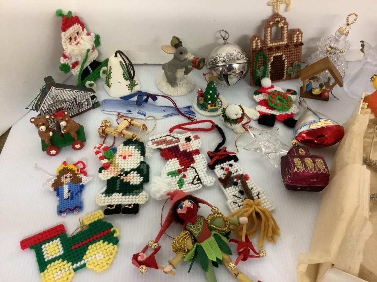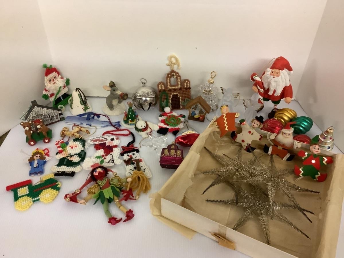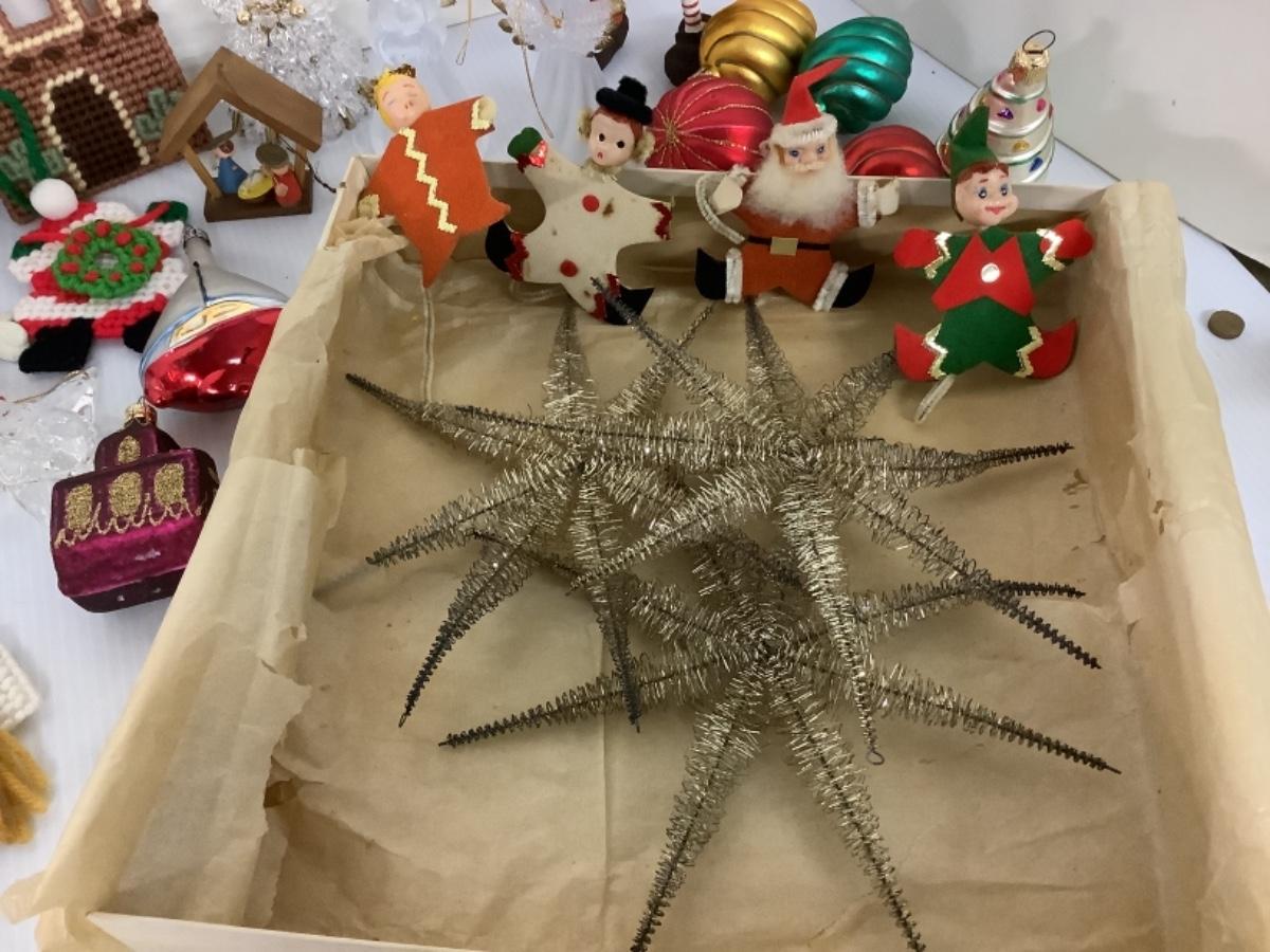 Vintage ornaments with small felt pipe cleaner figures and fine metal mesh stars