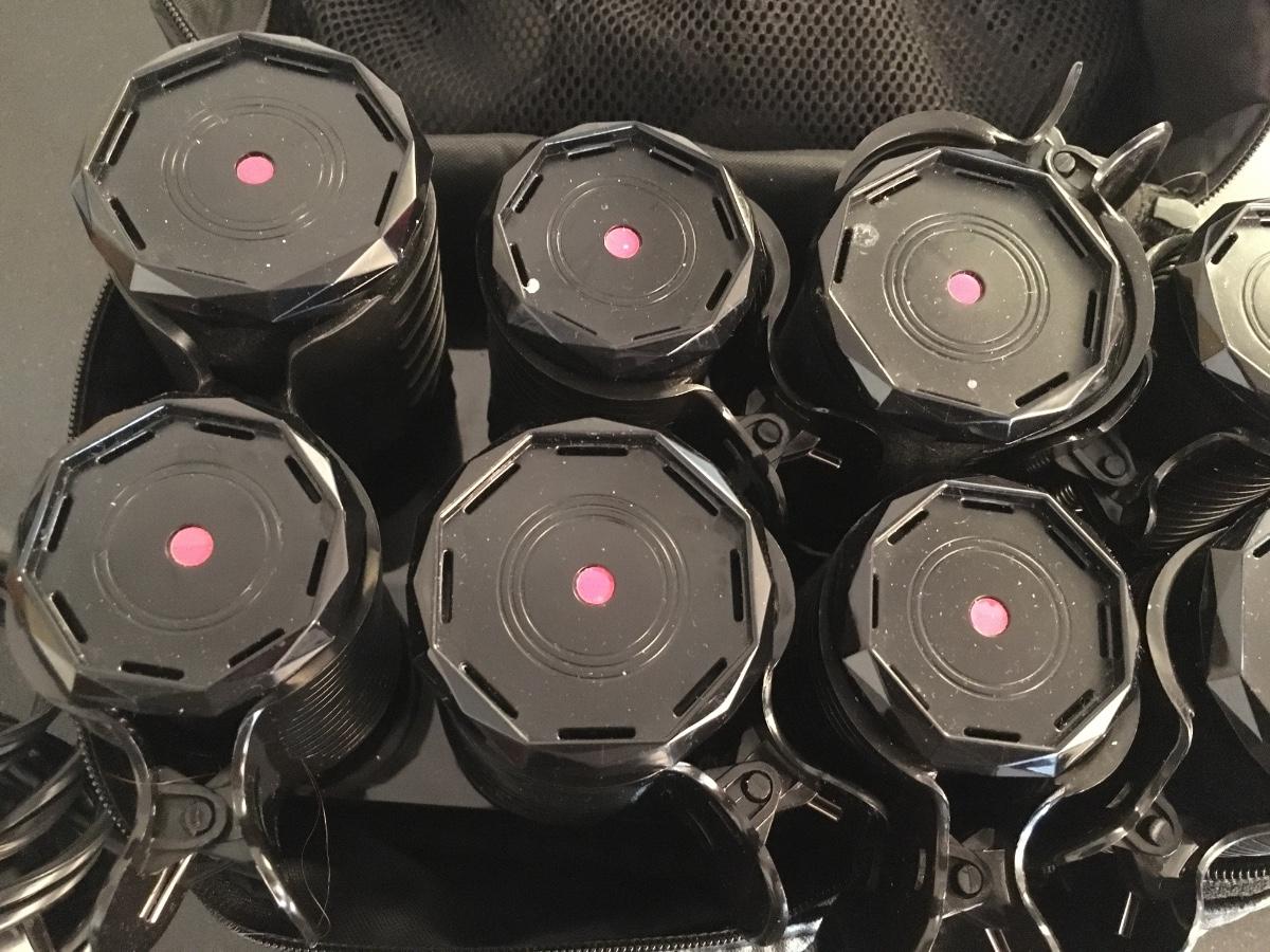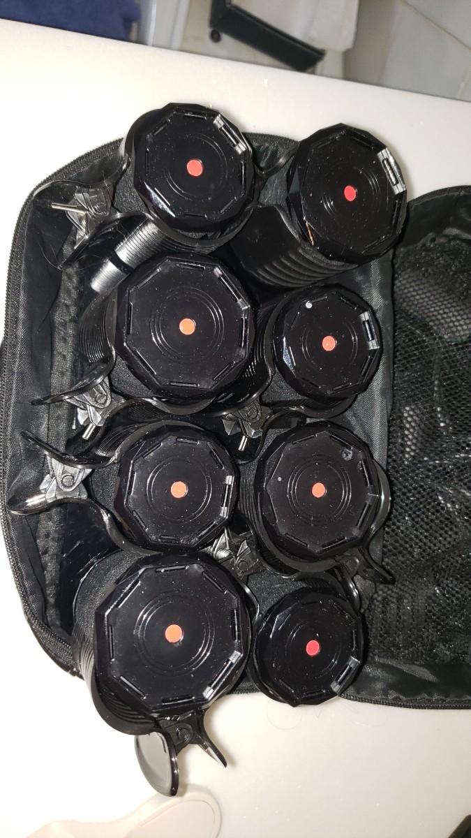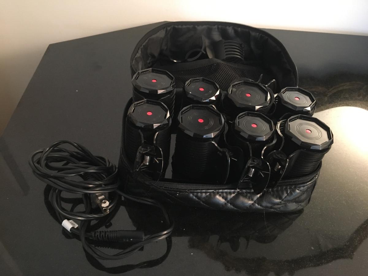 Comes with carrying case. Plugs in at base and heats up curlers. Comes with clips to hold curlers in place.