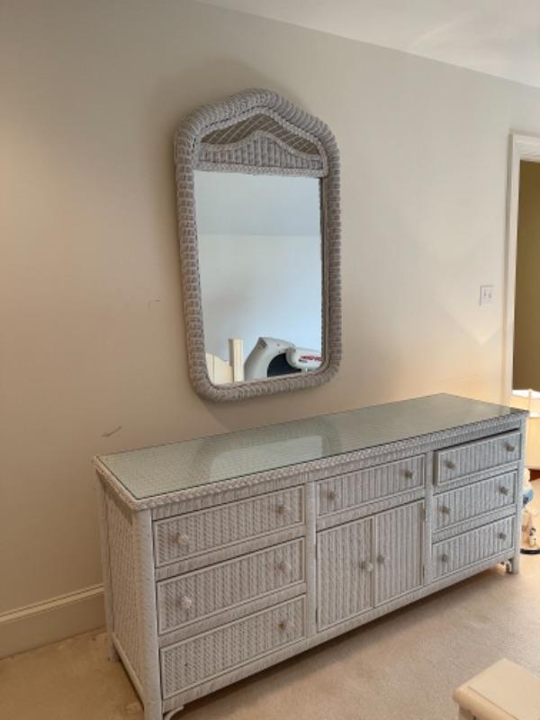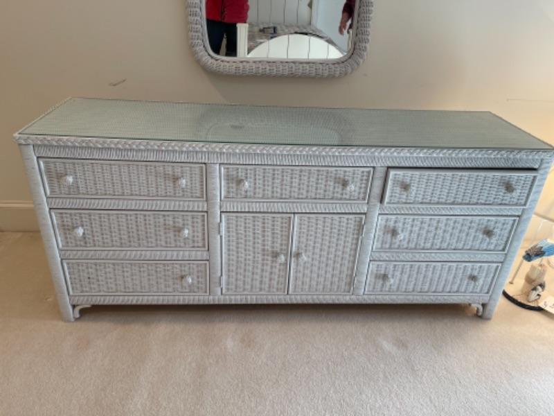 T356 Seven Drawer White Wicker Glass Top Dresser and Mirror
