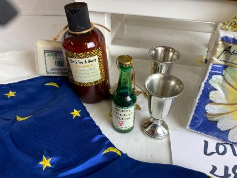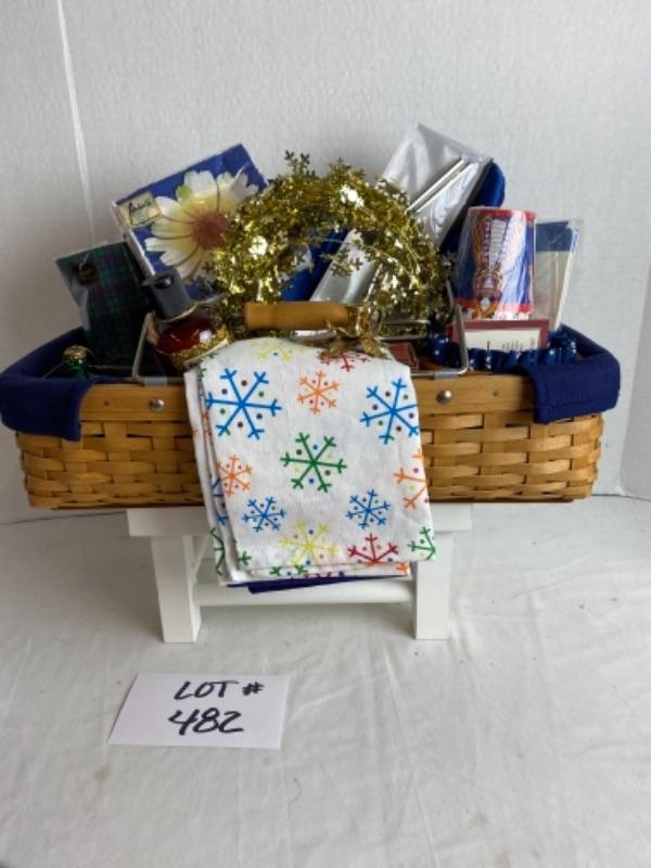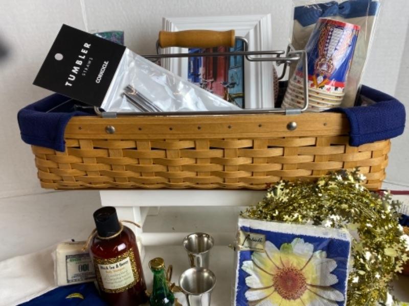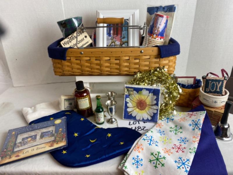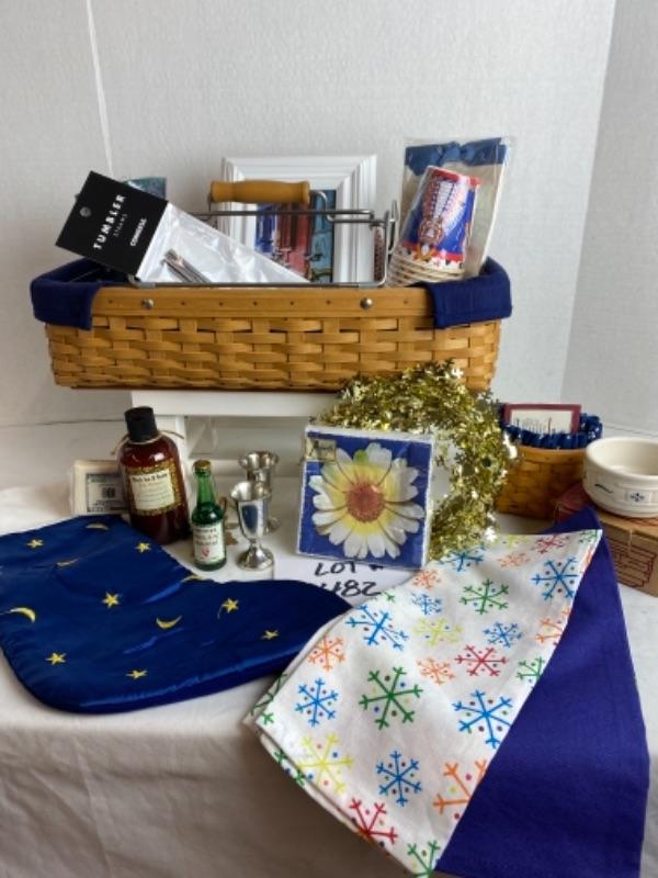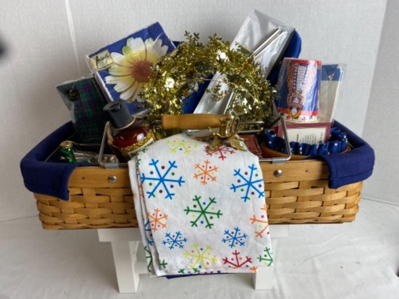 Longaberger Caddy gift basket lot with black tea and honey body shampoo, ornaments, moon and stars stocking, photo album, picture frame, science, Longaberger stackable custard cup and blue, and small basket, tea towels