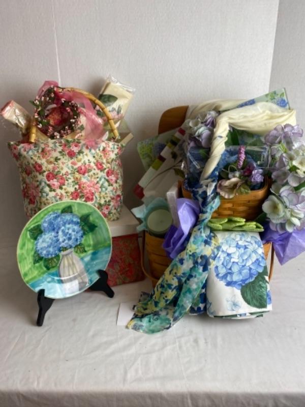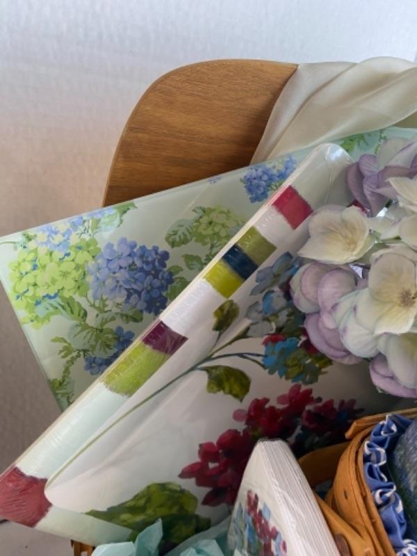 Longaberger Cake basket, with Dresden tour basket, candle, purple vase, details, hydrangea glass cutting board, scarves, handbag with Claire Burke candles, plate and much more