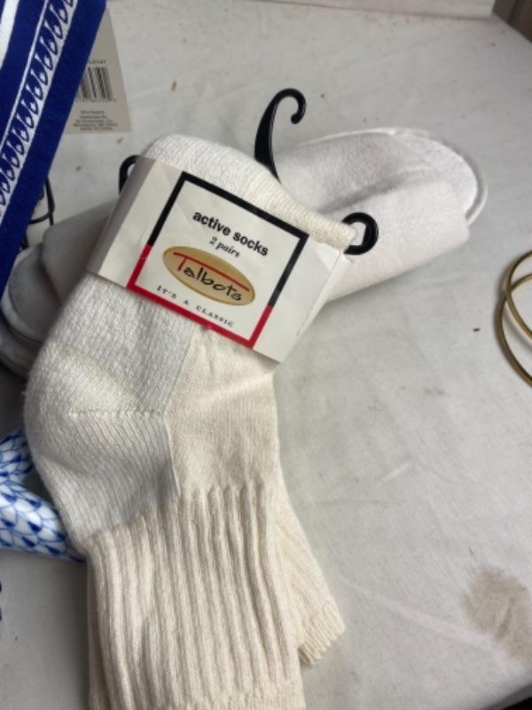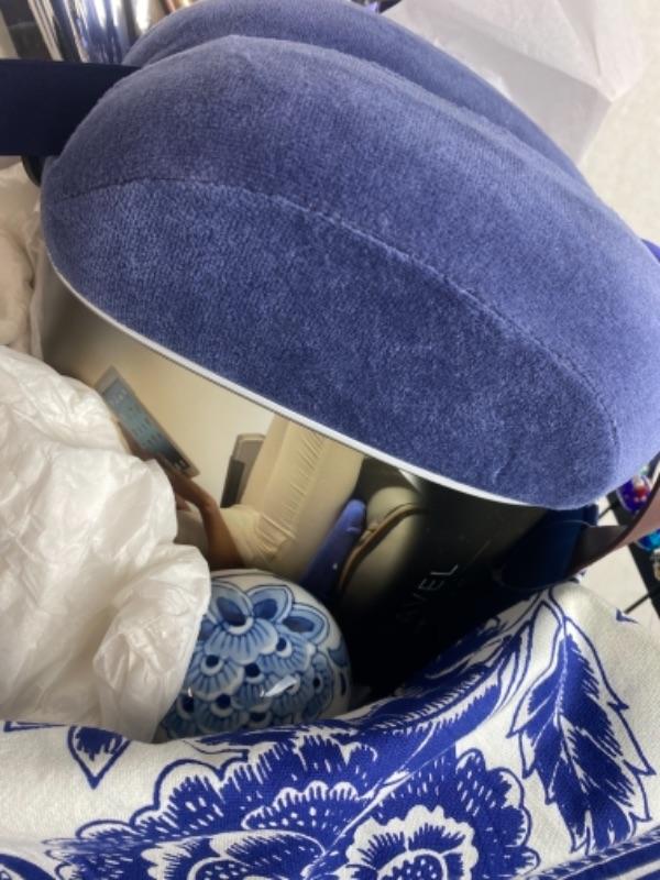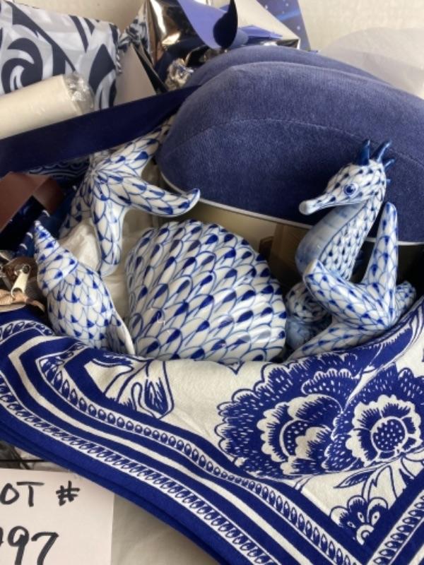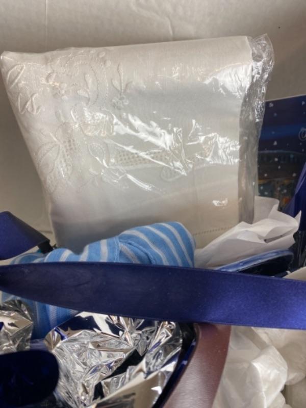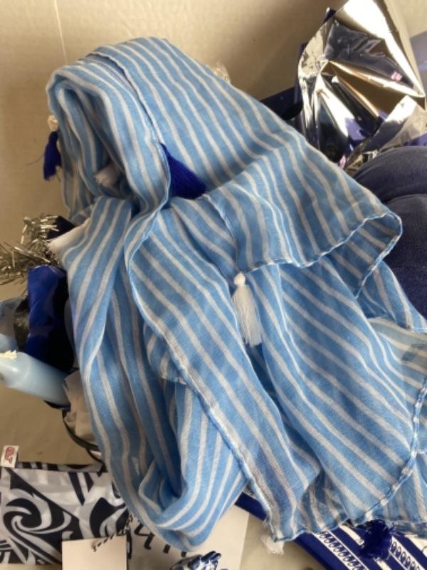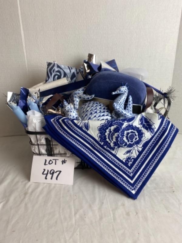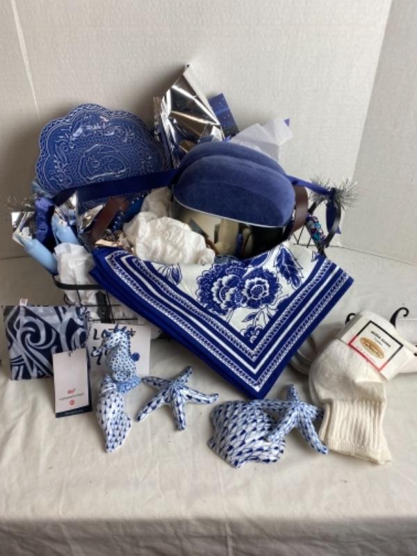 Blue and white gift basket with table Klos, memory foam soft seat pillow, blue and white nautical theme porcelain decorative pieces socks, scarf, blue majolica style plate and much more