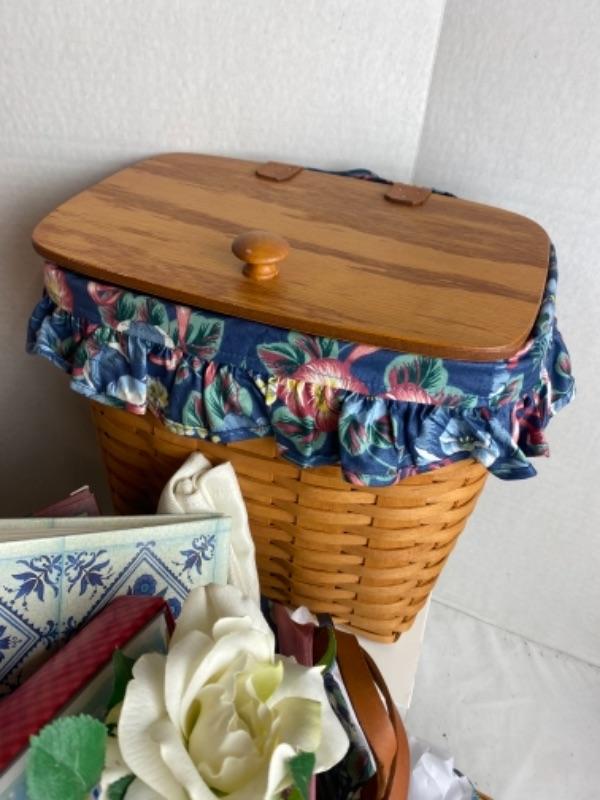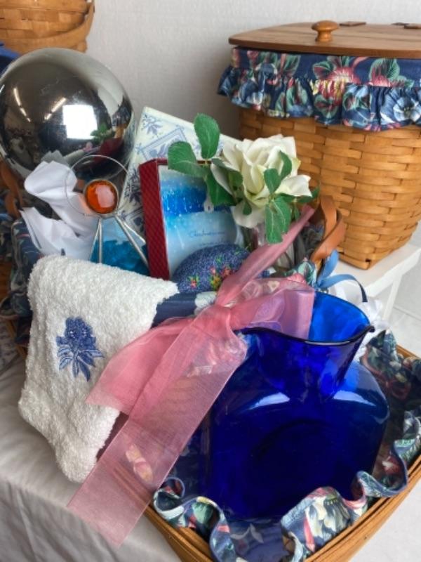 Large Longaberger 5 pc Gift Basket With blue water vase, long and burger socks, so flower vase, Christmas cards, Stainglass angel votive, gift card organizing file, Longaberger Pottery milk picture