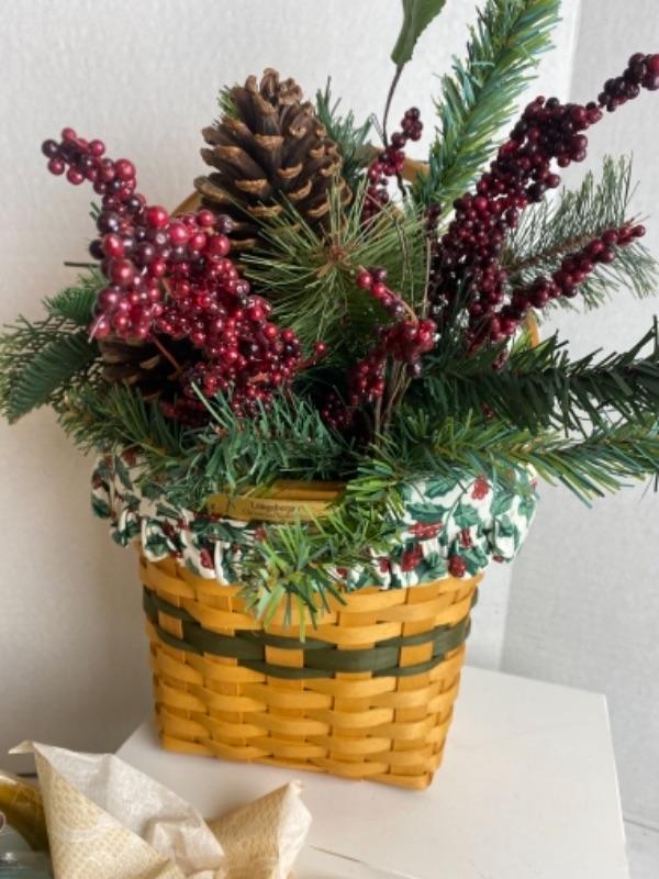 Two Longaberger Gift baskets one with artificial pinecone Decour in a 1998 glad tidings basket, the other is a bread basket with a Gorham Ornament, candle, small handbag, paper products