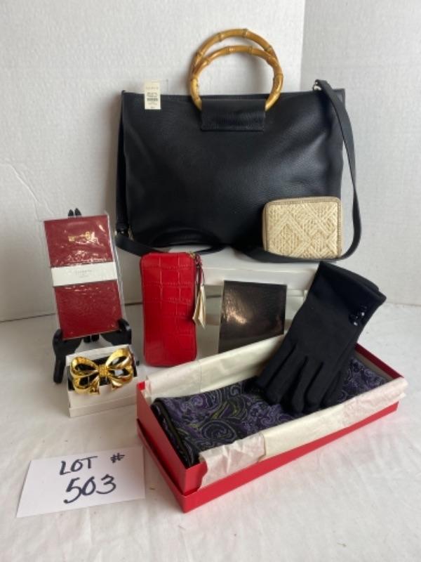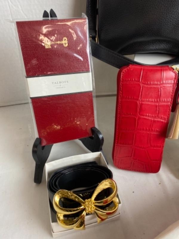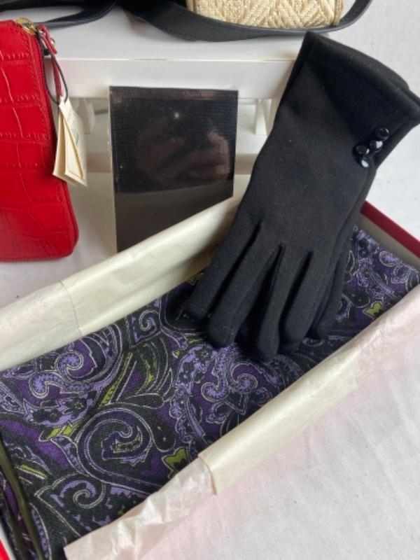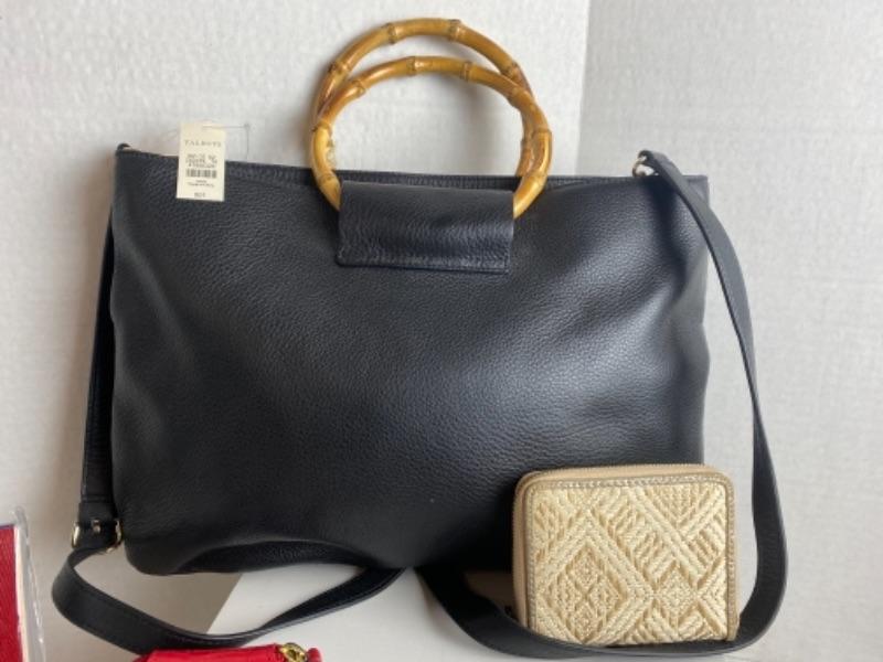 New Talbots Black Leather handbag with paisley purple black scarf , bow belt, crane writing tablets, leather carrying tote bag , gloves
