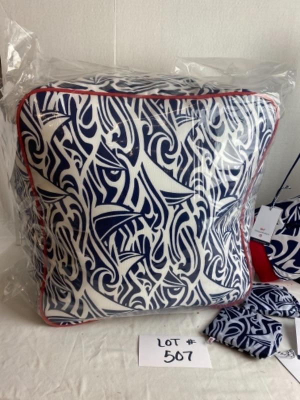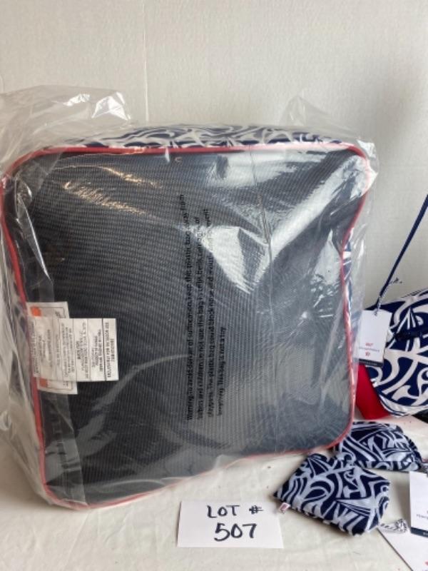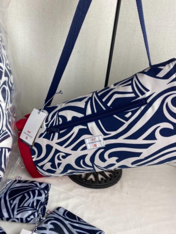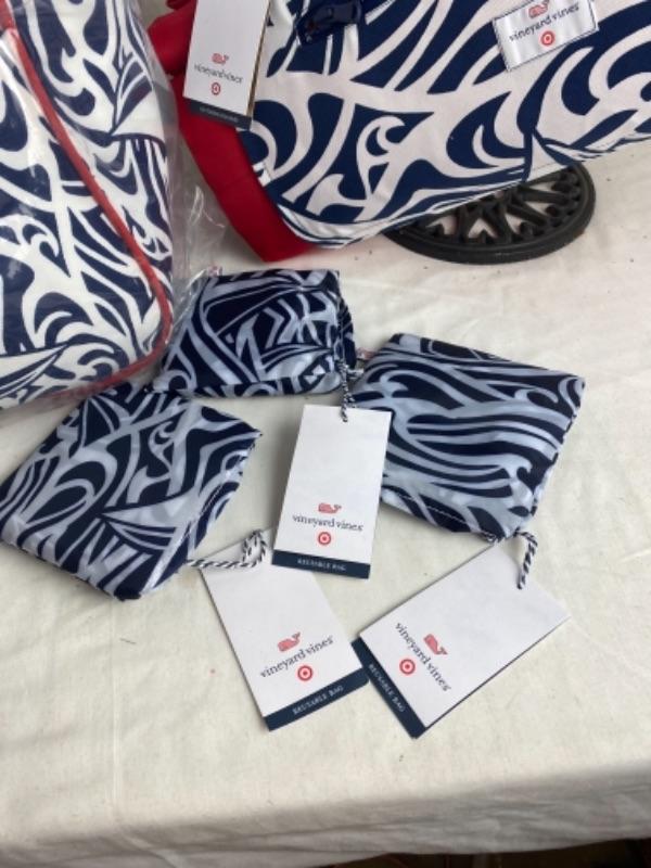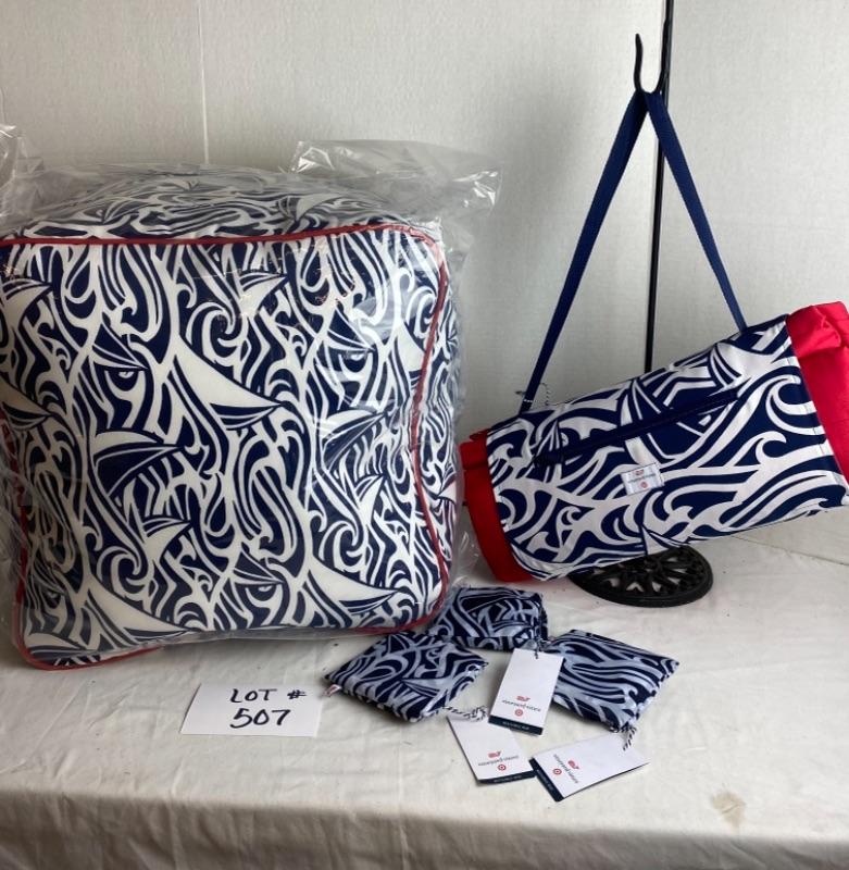 New Vineyard vine Gift sent with outdoor blanket new with tag three reusable shopping totes, large ottoman 18 in.² 13 inches high