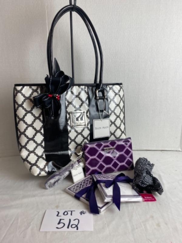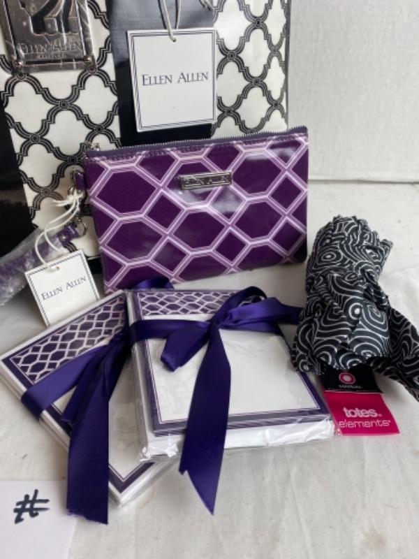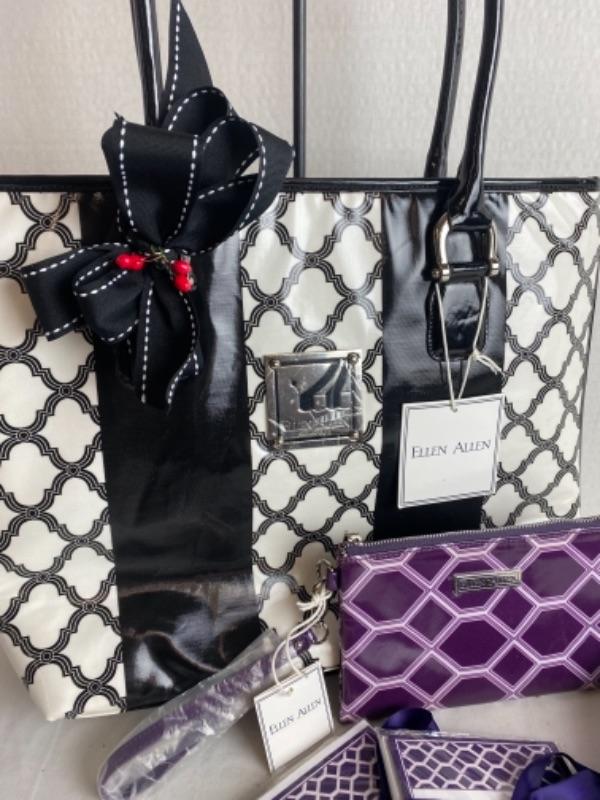Alan Alan large tote new with tag black and white, purple and white small clutch bag, Alan Alan two sets of purple and white no cards, totes umbrella