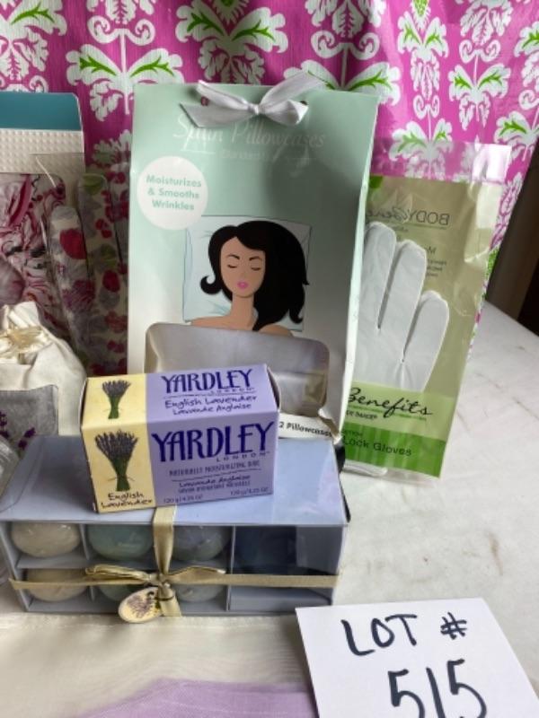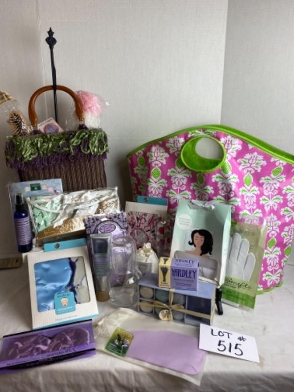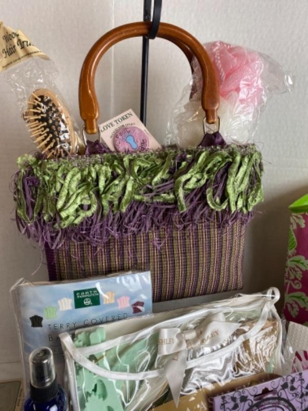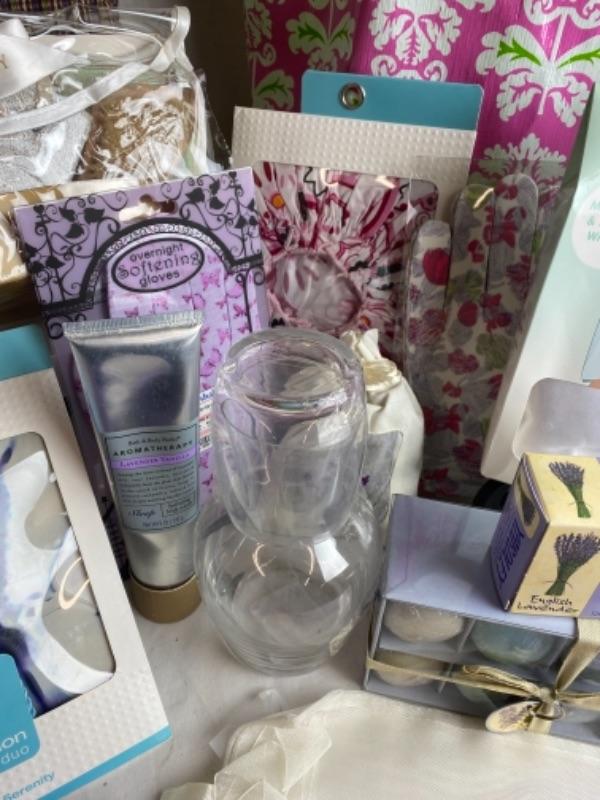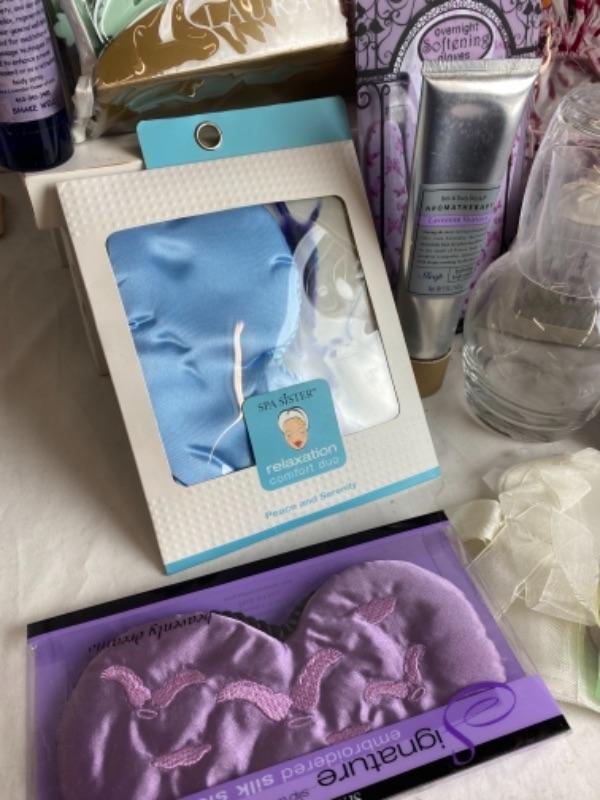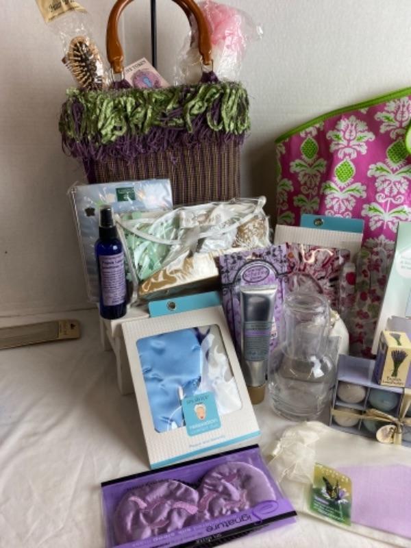 Large spa gift tote including face mask, sleep mask, bath and Bodyworks aromatherapy body cream, softening gloves, Laura Ashley pedicure kit, Terri covered bath pillow, green and purple handbag, shower cap, satin pillowcases, body gloves, English lavender soap and much more