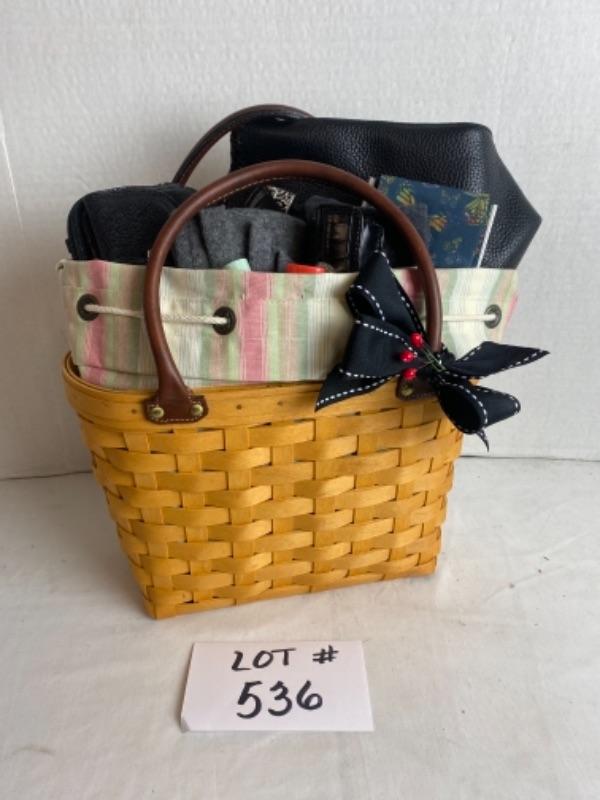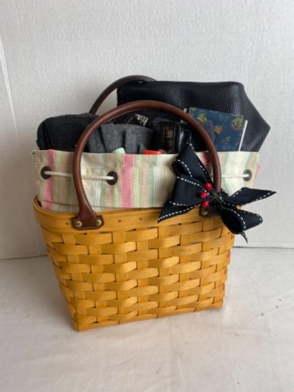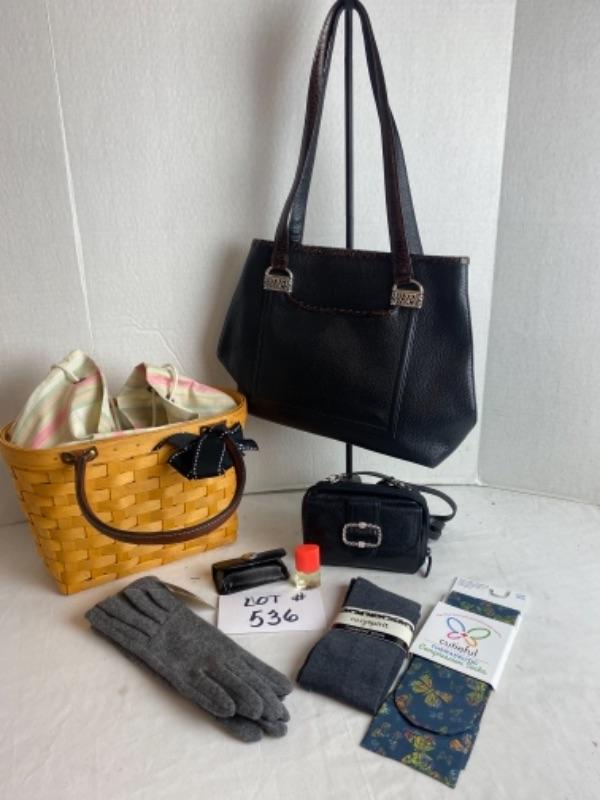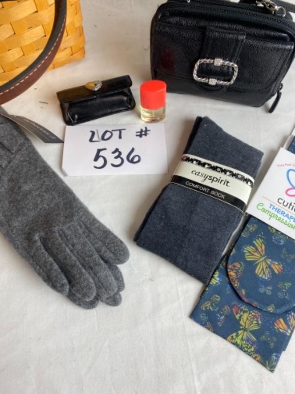 Longaberger Brighton handbag gift set With echo charge gloves from Talbots, easy spirit comfort socks, therapeutic compression socks, Brighton lip case, small Clinique happy heart perfume sample