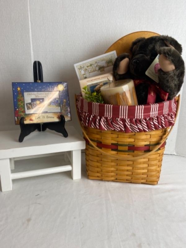 Longaberger Snore Bear Gift Basket With long and burger cinnamon candle and wooden base with ivory Longaberger Pottery trivet plate, bear coaster set, tea towels, soap and much more