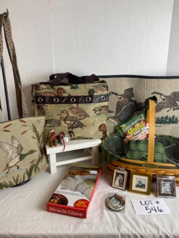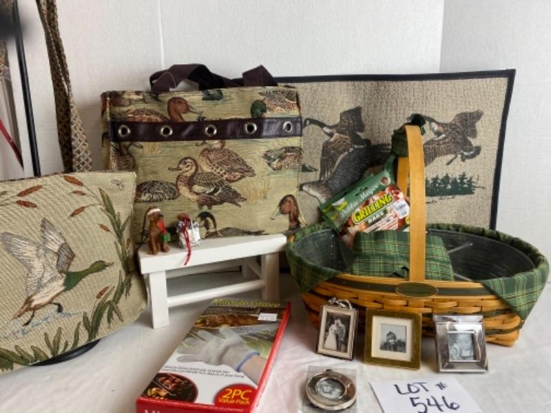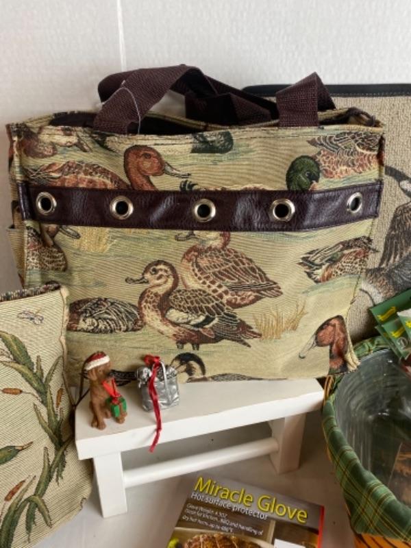 Longaberger Traditions gift basket with water fowl tapestry Handbag, Waterfowl duck tote bag, grill gloves, Waterfowl doormat, small picture frame Ornaments