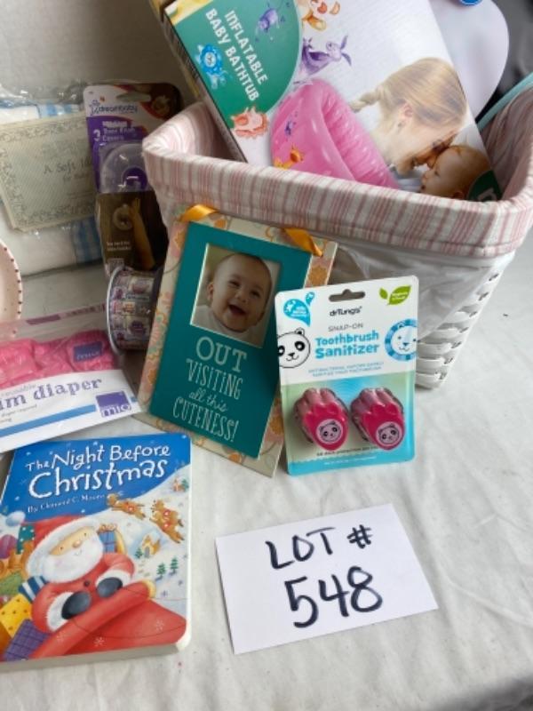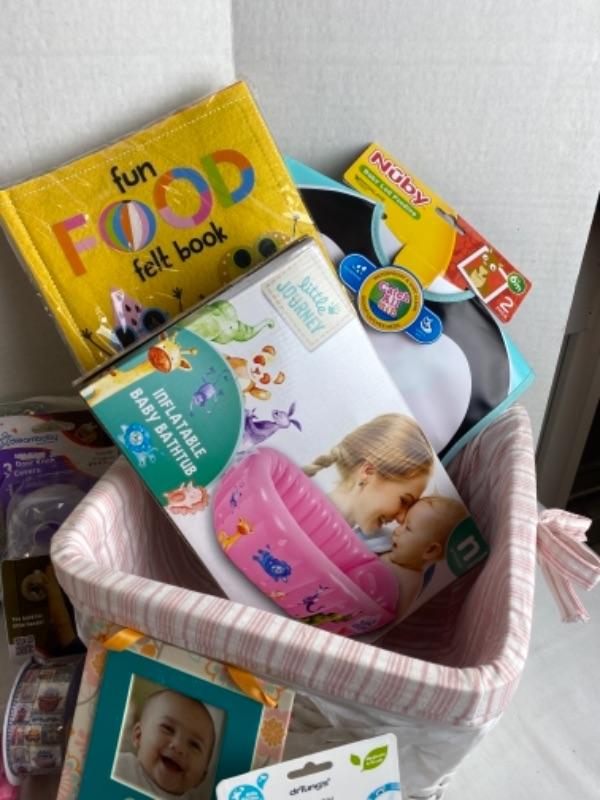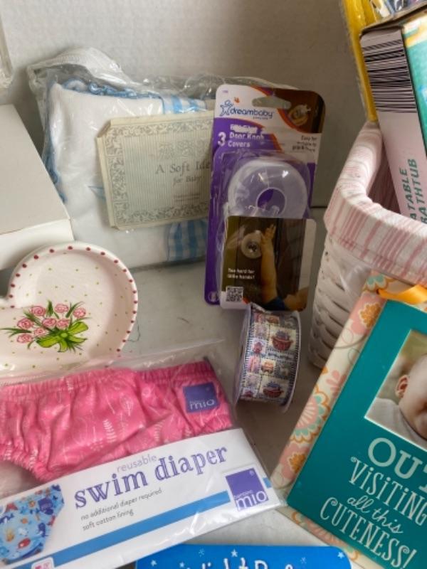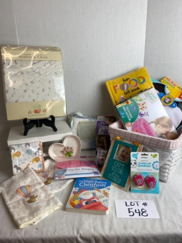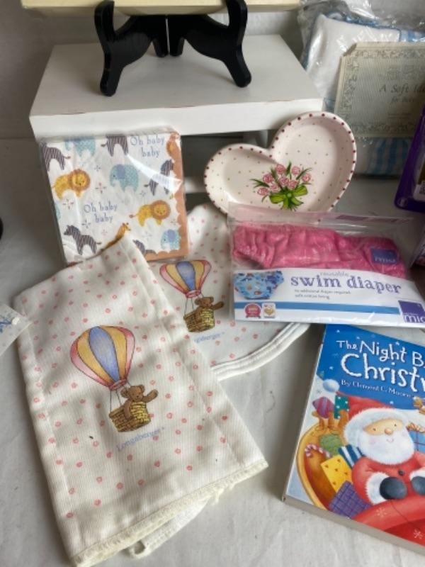 Baby gift basket with Laura Ashley receiving blanket Reusable swim diaper, heart dish, door knob covers, baby blanket, inflatable baby bathtub, felt book, bib, Christmas book and much more