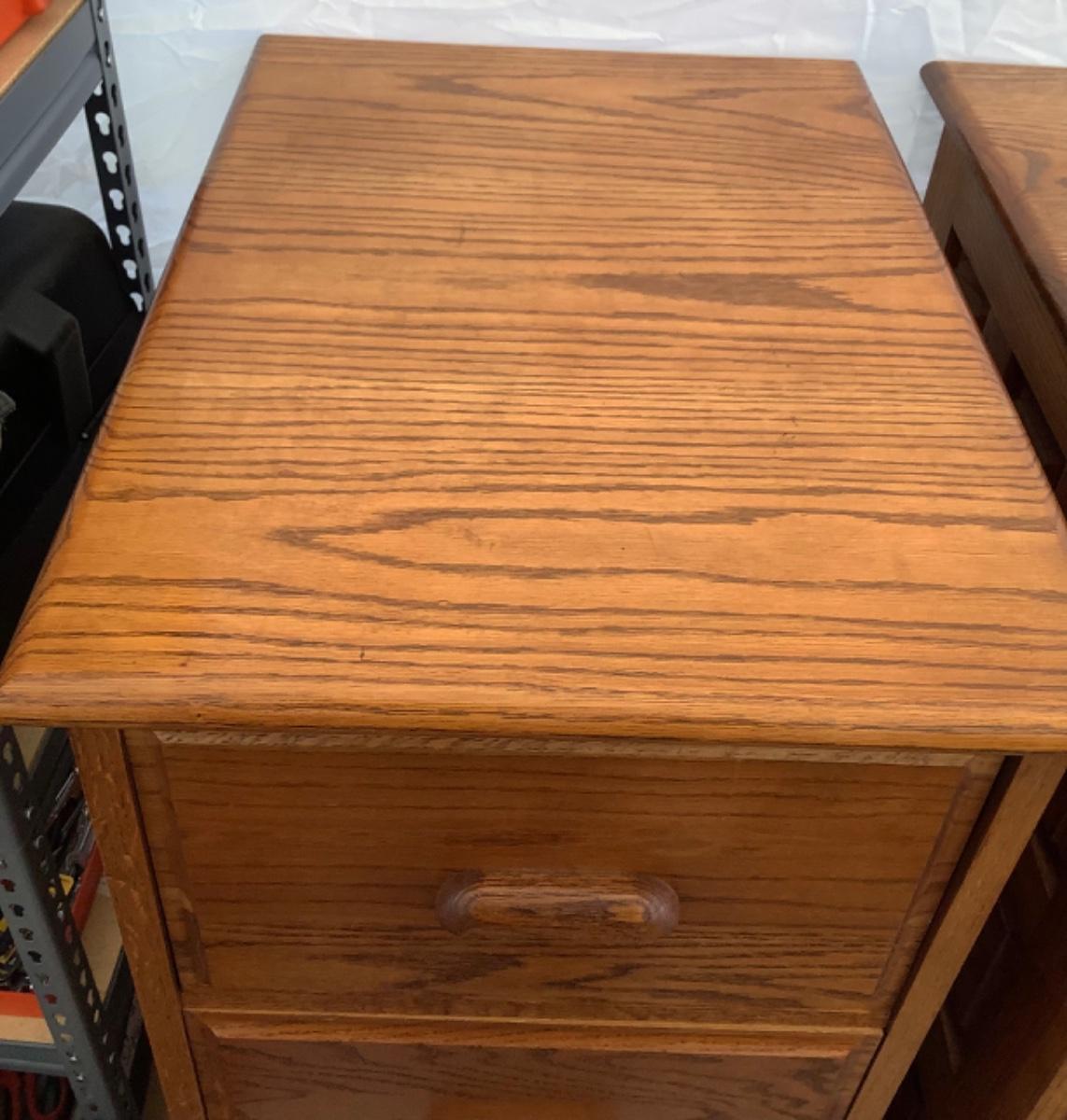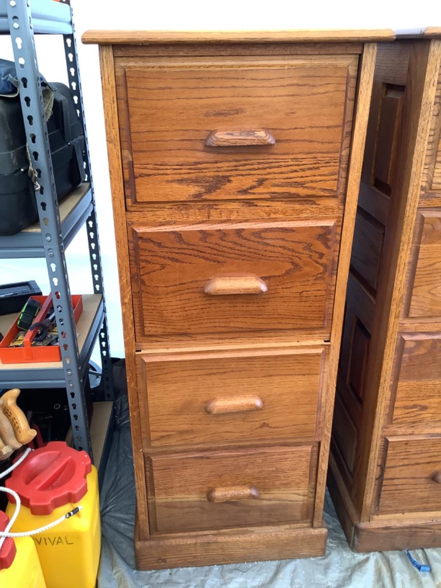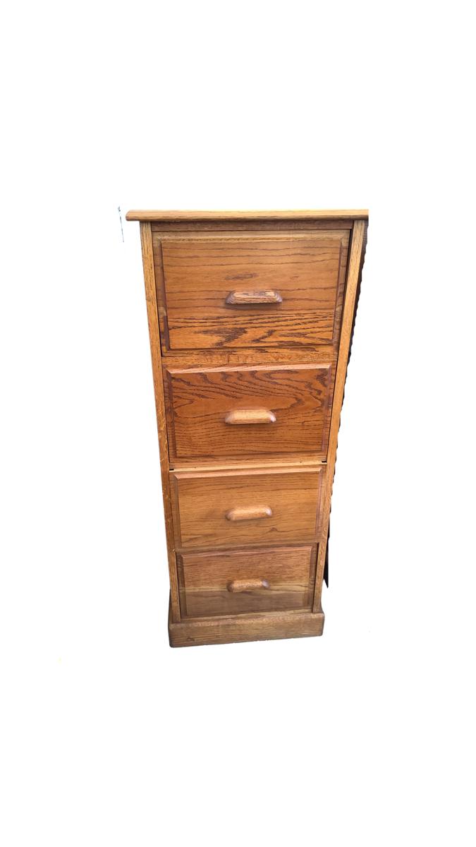 Four drawer oak filing cabinet. Overall condition good, there are some scratches/staining. All drawers close fully. Some drawer fronts need to be worked on to close flush to cabinet front-see pic. 54”H x 30”D x 22”W