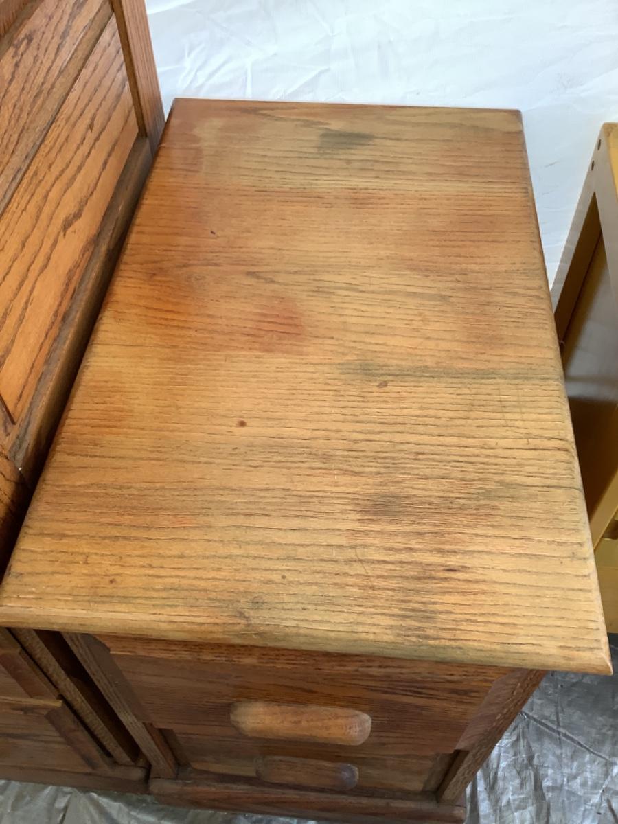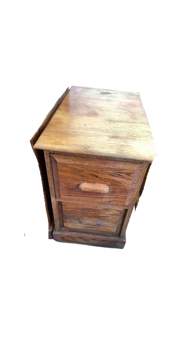 Two drawer oak filing cabinet. Overall condition good, there are some scratches/staining. All drawers close fully. Some drawer fronts need to be worked on to close flush to cabinet front-see pic. 29.5”H x 30”D x 19”W. The top has some fading-see pic.