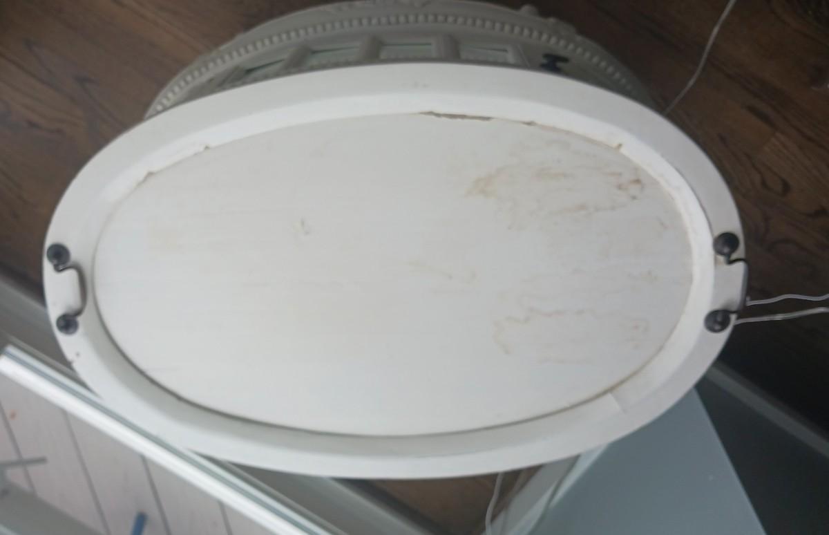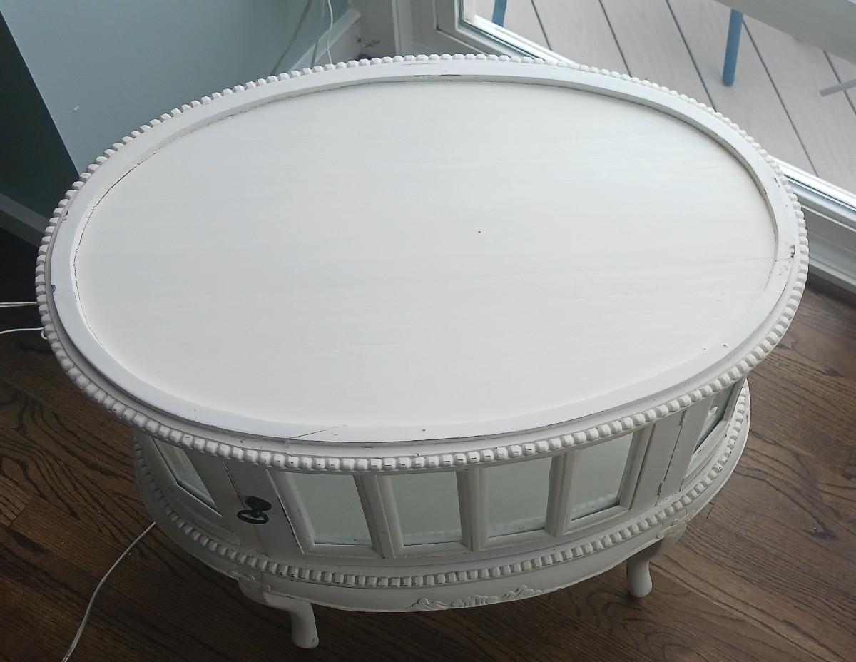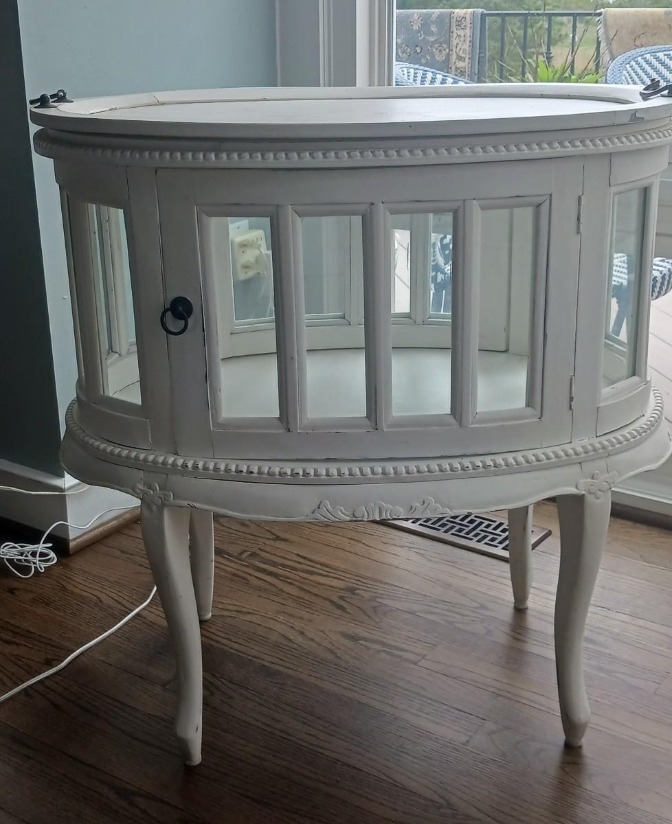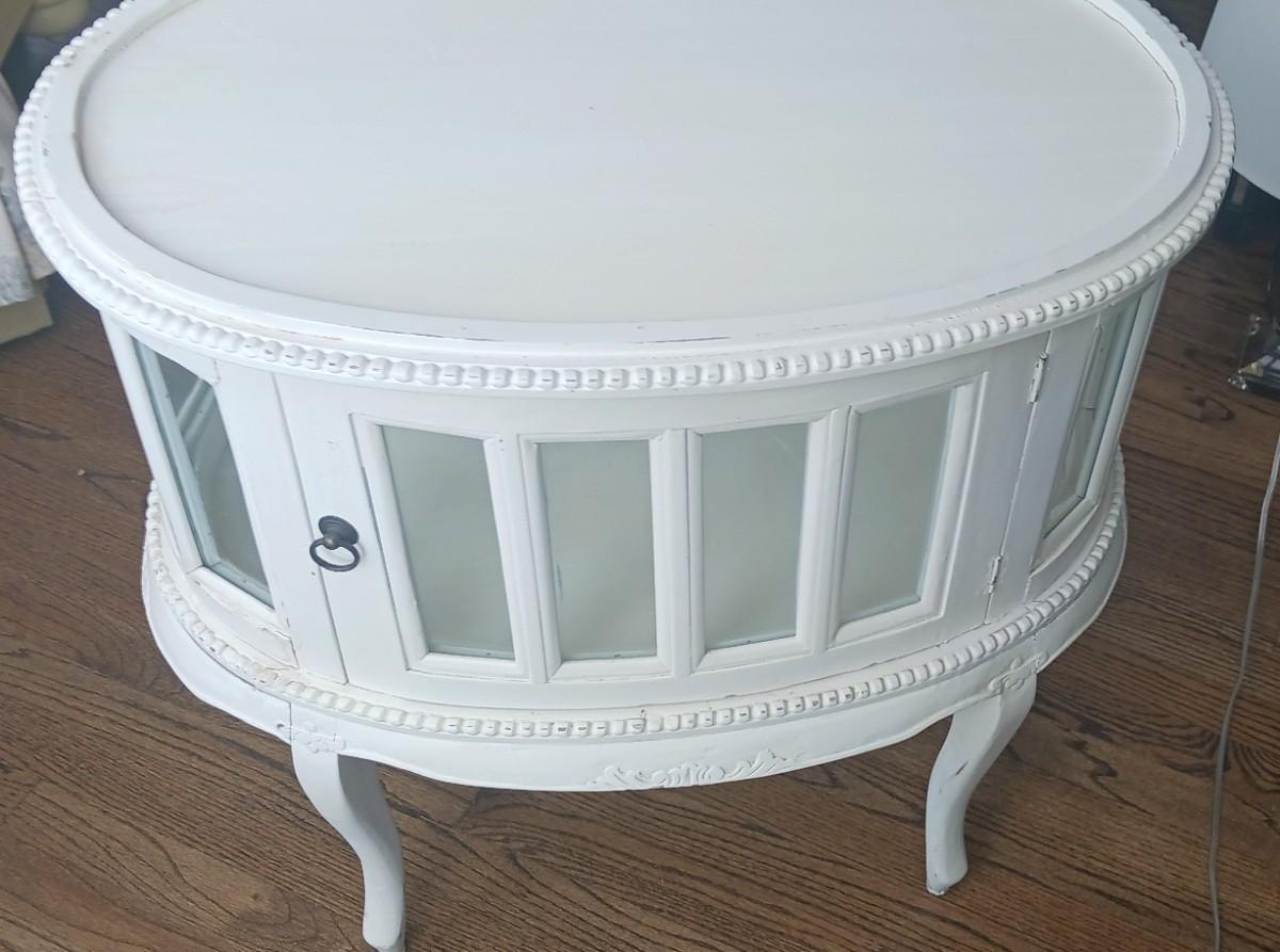 White wood table with small cabinet in glass with removable top (tray) 19 inches deep, 29 inches wide, 30 inches tall.