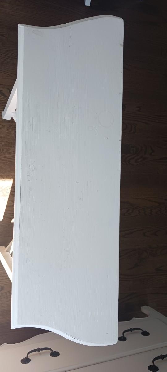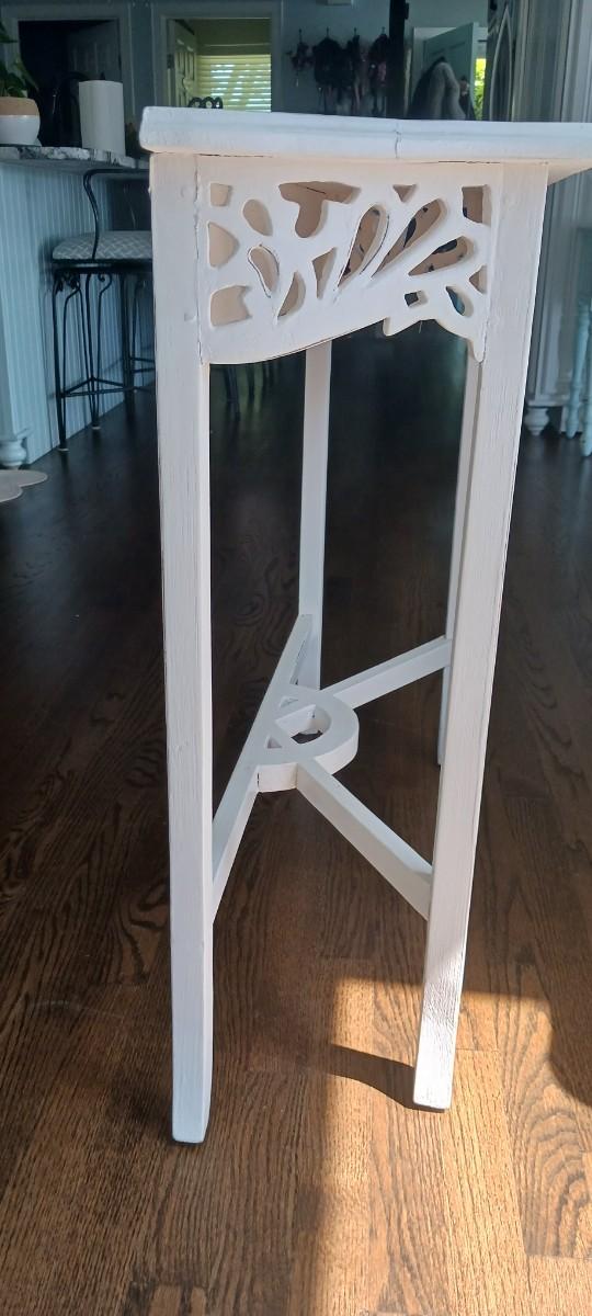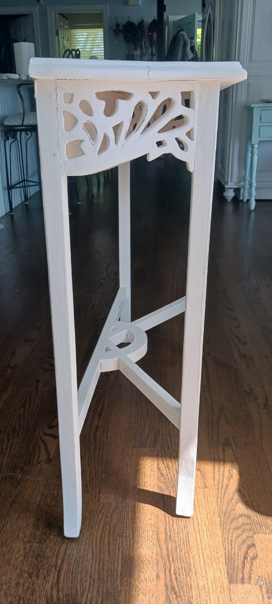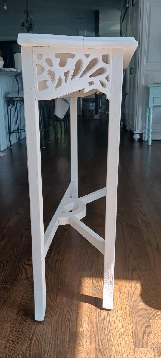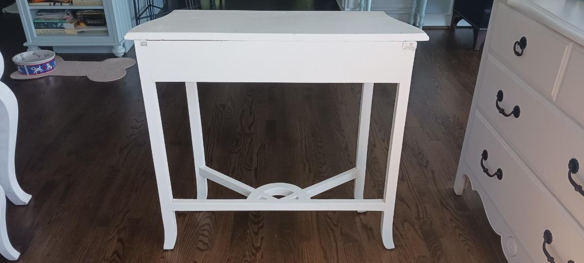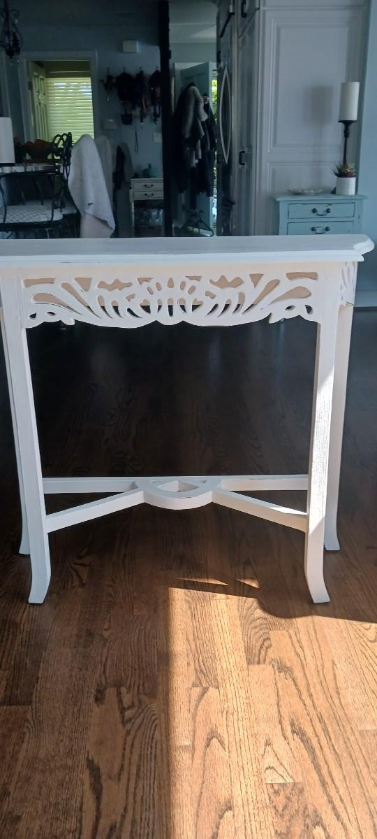 Quite wood side table. 32 inches wide, 10 inches deep, 30 inches tall.