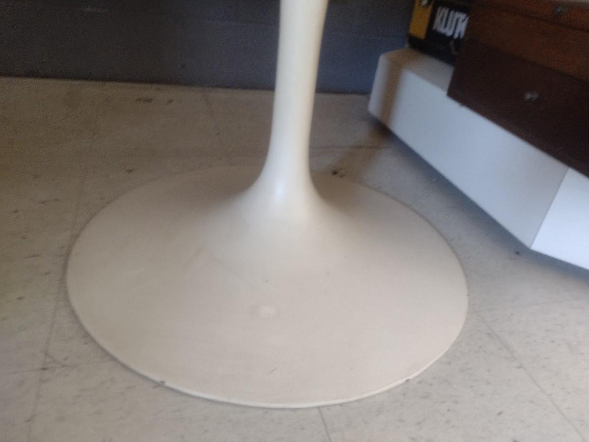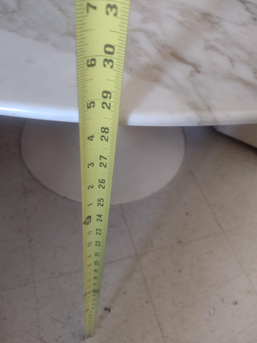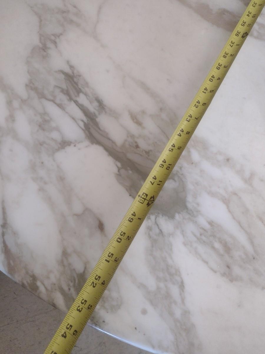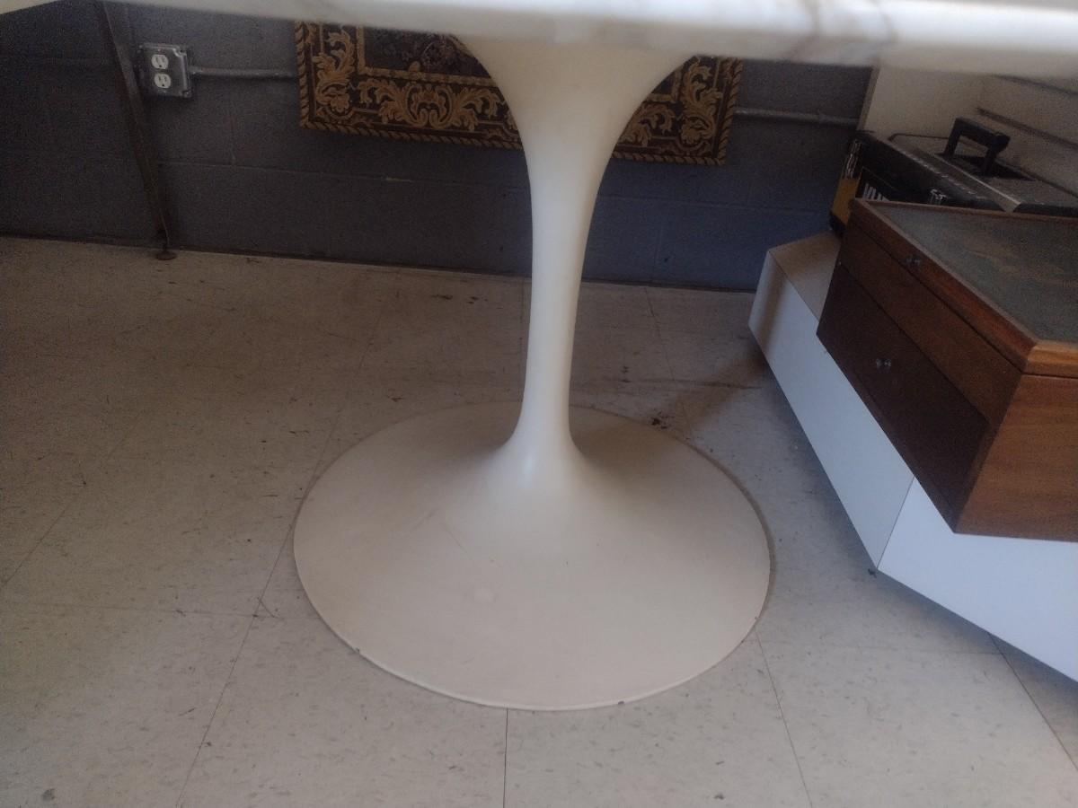 MCM Design Eero Saarinen Inspired Tulip Style Dining Table Marble Top with Cast Metal Base 53". This table is two pieces. Each element weighs about 150lbs. Please bring appropriate help to remove. It took two to three people to bring it into the building.