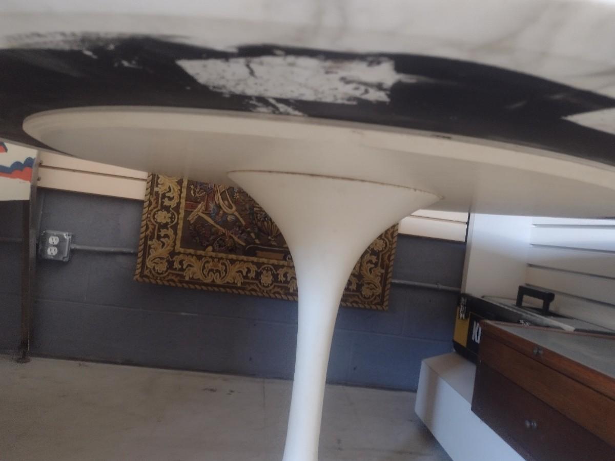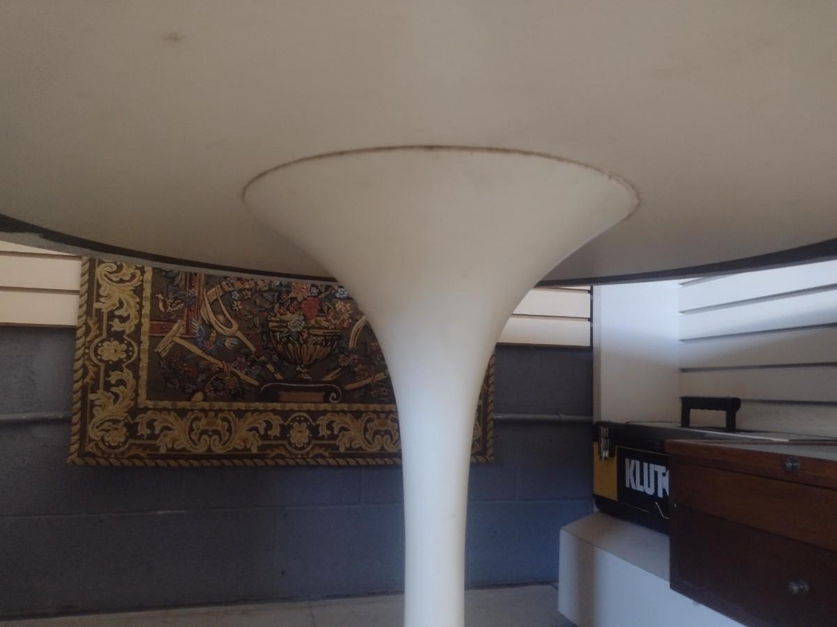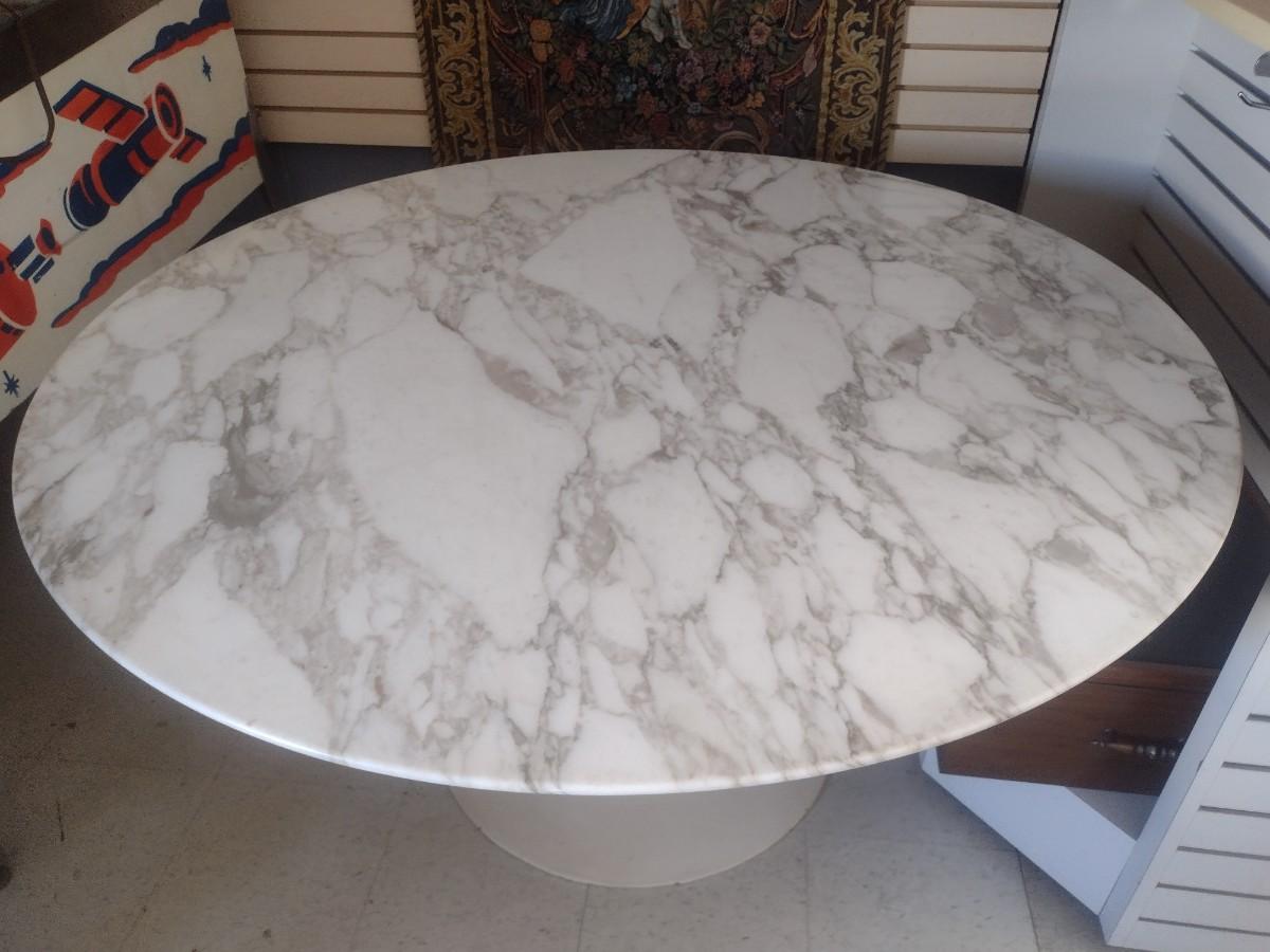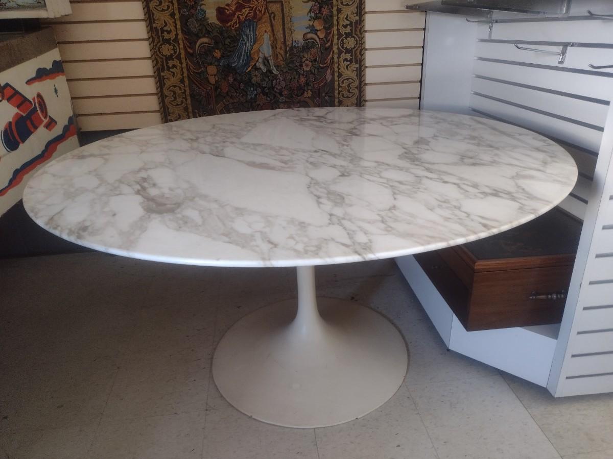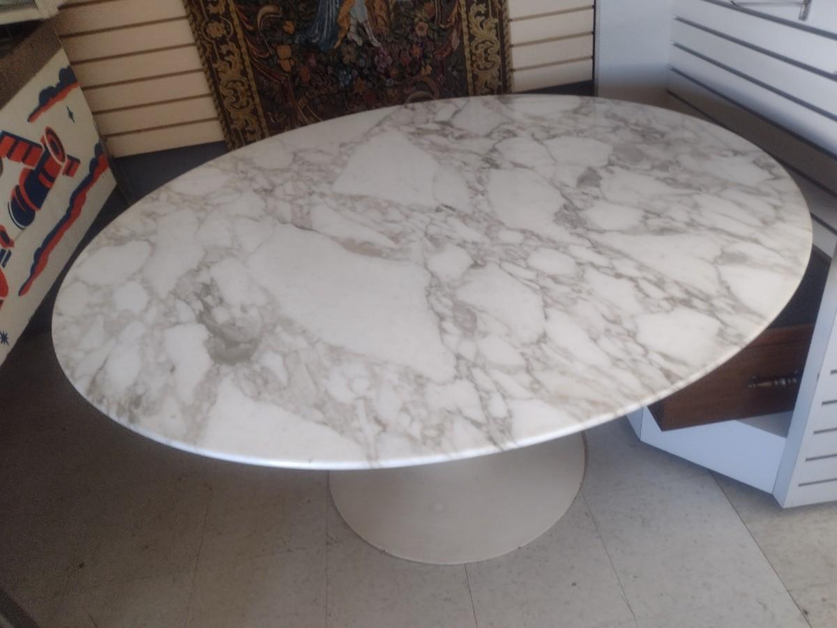 MCM Design Eero Saarinen Inspired Tulip Style Dining Table Marble Top with Cast Metal Base 53". This table is two pieces. Each element weighs about 150lbs. Please bring appropriate help to remove. It took two to three people to bring it into the building.