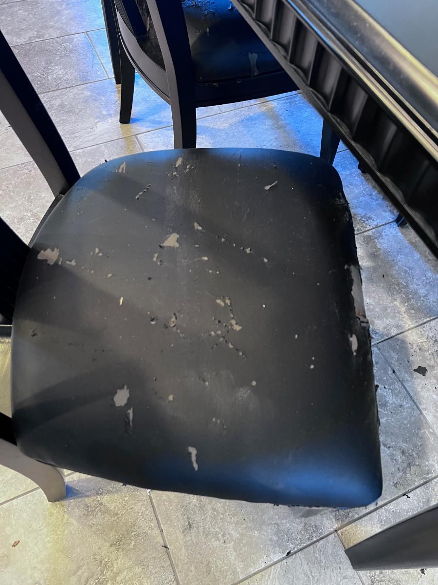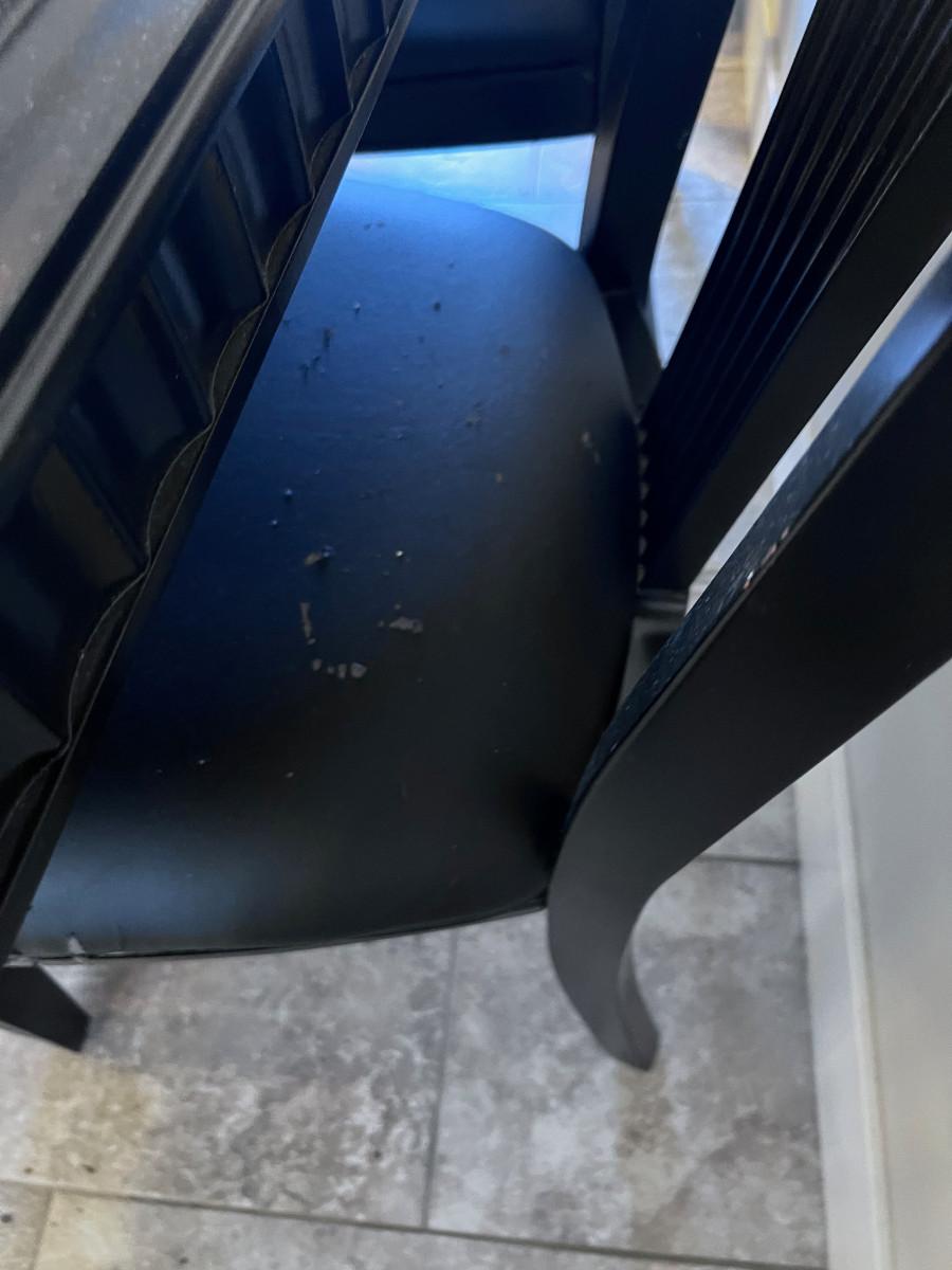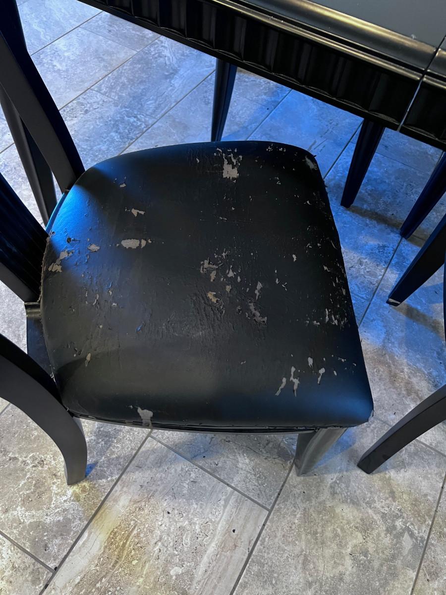 The Seats of 4 Vinal Seats are in need of replacement. 2 are very good not used condition. TABLE is 64 x 42 plus Leaf of 20" More. Has 2 chips on one side. Otherwise good Condition.
