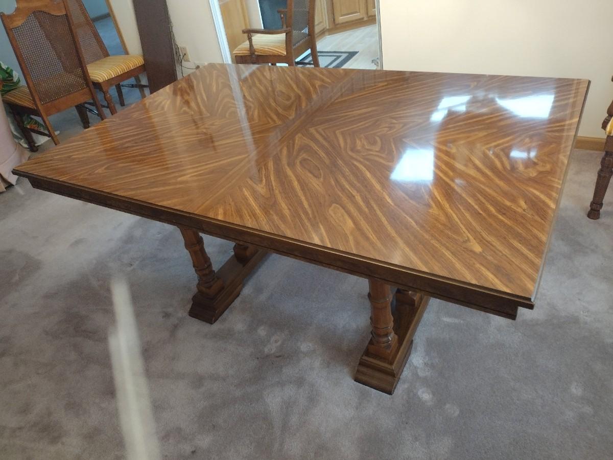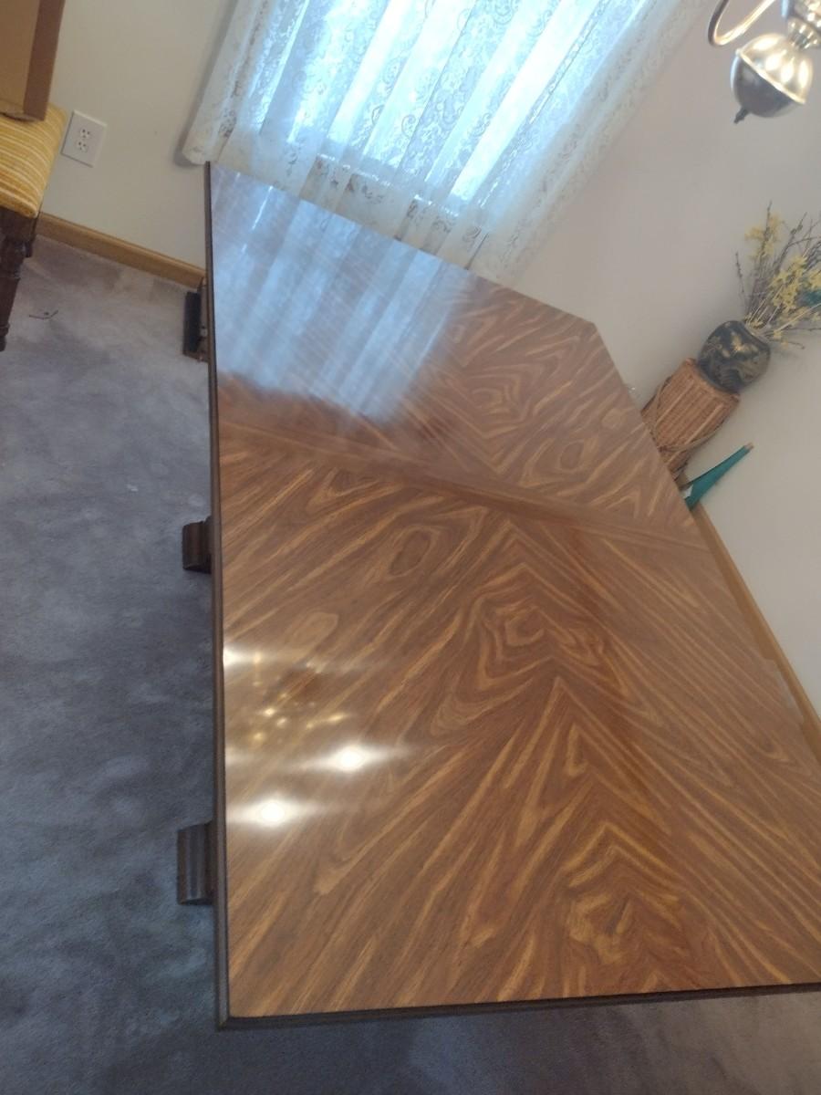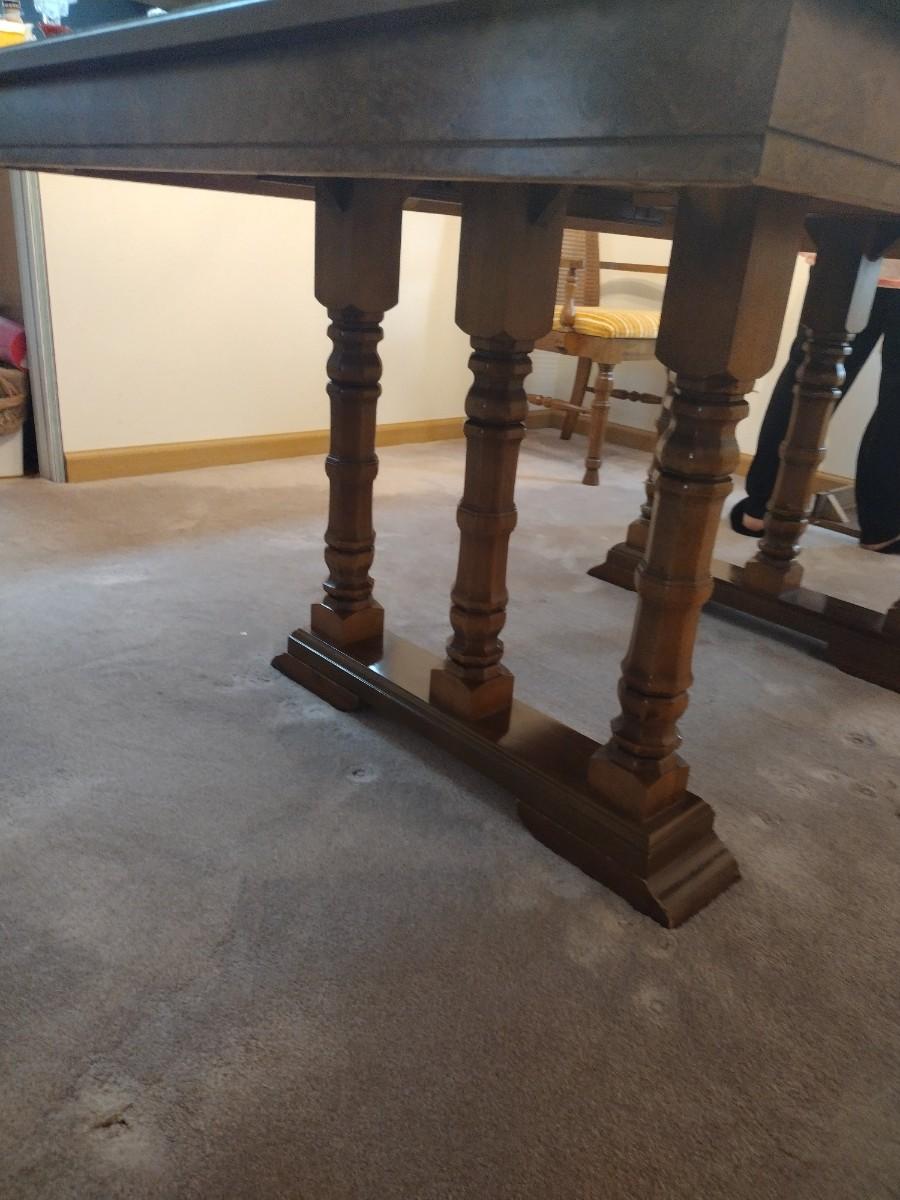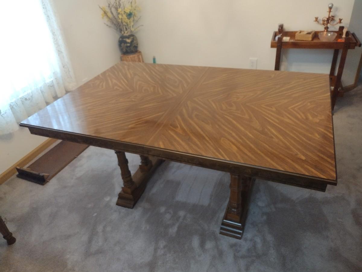 Oak dining table measures 64x42x29 with three 12" leaves. One leaf has the table frame on it.