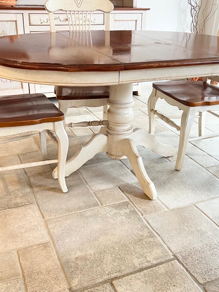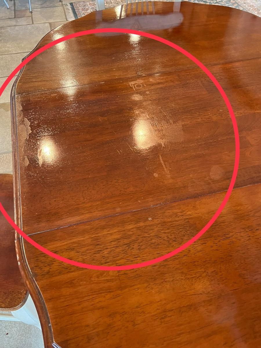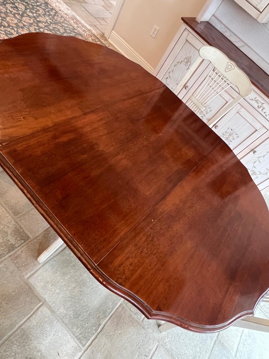 Really needs additional cleaning ~ Has minor surface damage that is mostly on the leaf (see photo) ~ Chairs have red stains on chairs where there were red cushions, see photos ~ Table with leaf = 30” H x 60” W x 42” D ~ Table without leaf = 42” Round ~ Leaf = 18” ~ Hutch Sold Separately