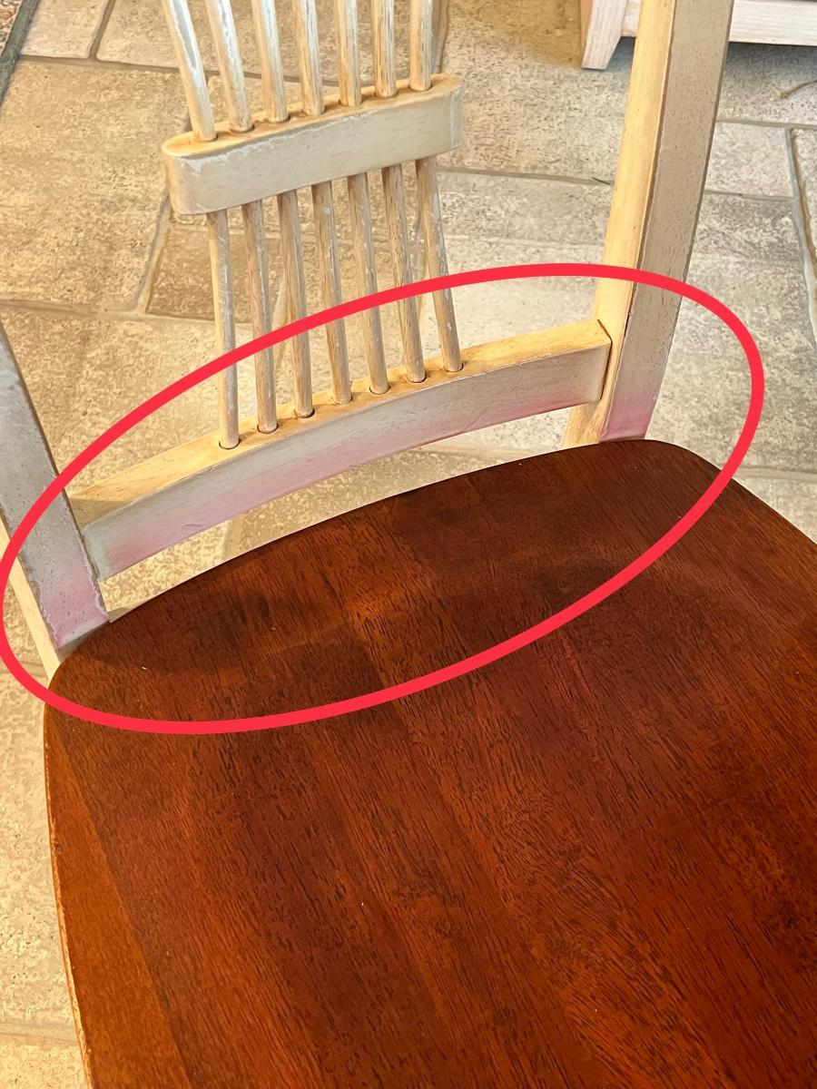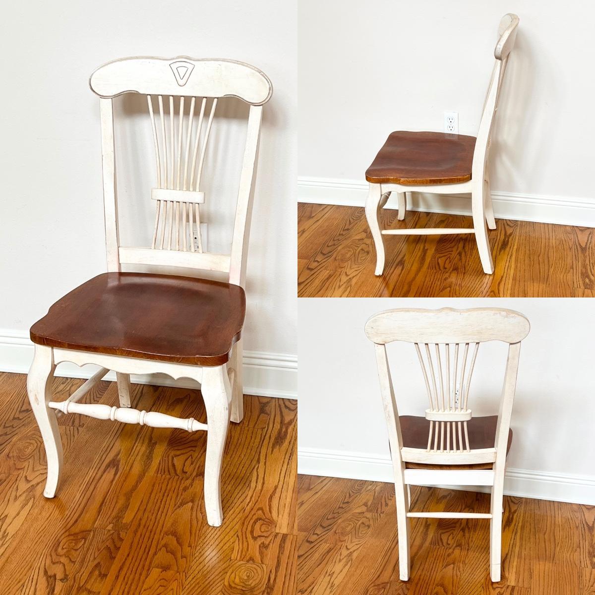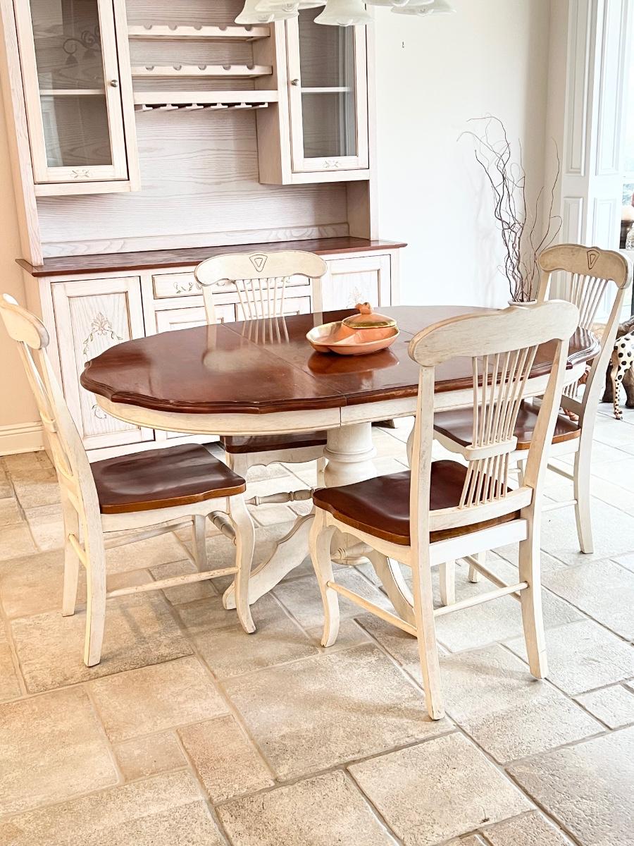 Really needs additional cleaning ~ Has minor surface damage that is mostly on the leaf (see photo) ~ Chairs have red stains on chairs where there were red cushions, see photos ~ Table with leaf = 30” H x 60” W x 42” D ~ Table without leaf = 42” Round ~ Leaf = 18” ~ Hutch Sold Separately