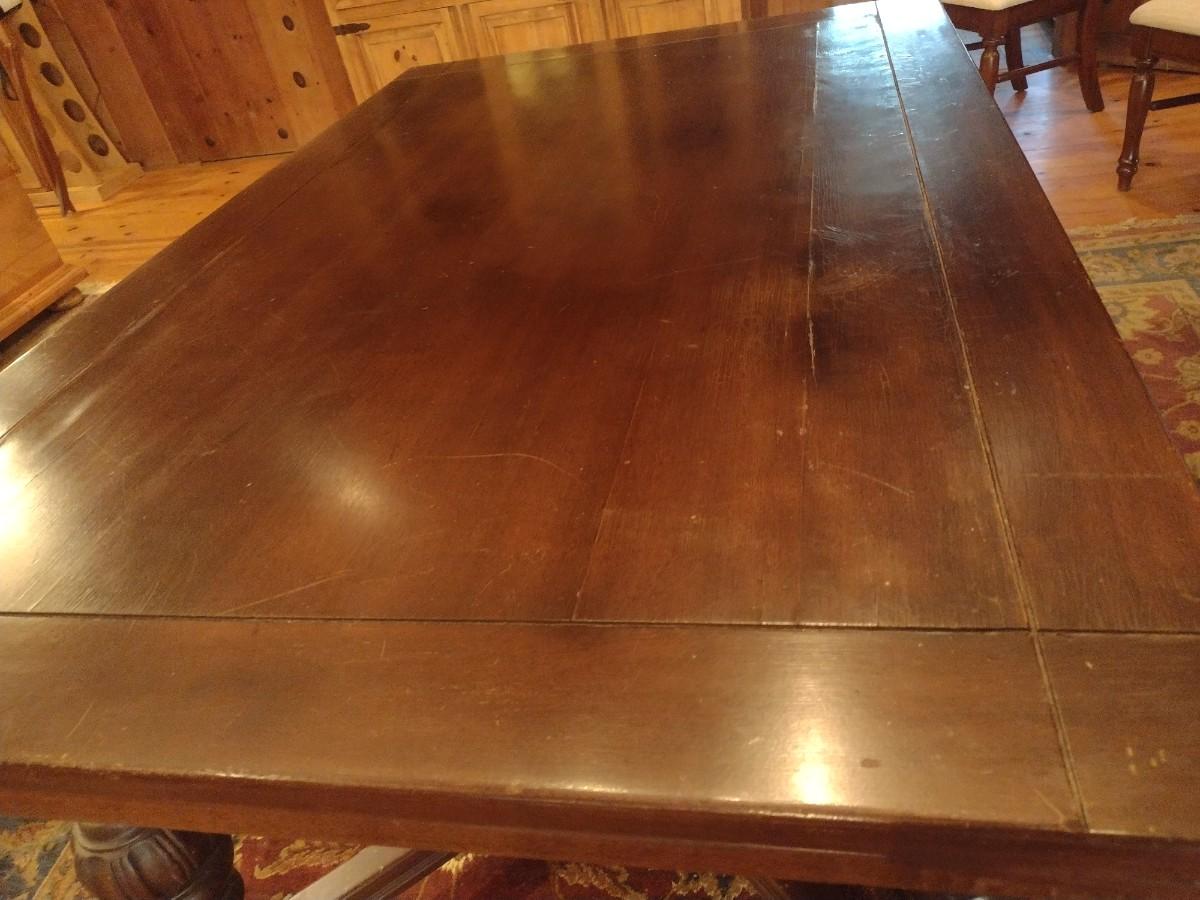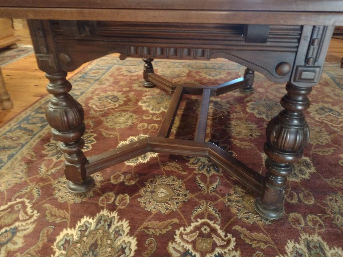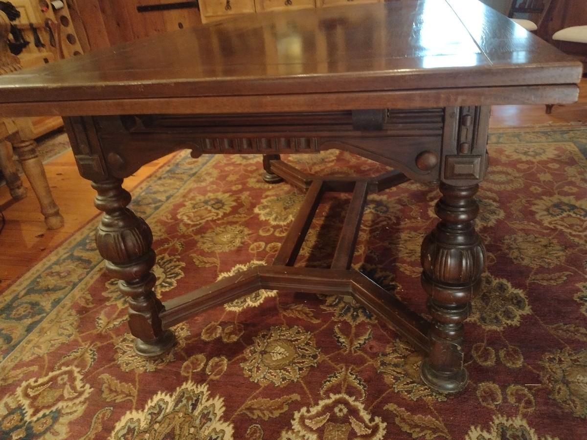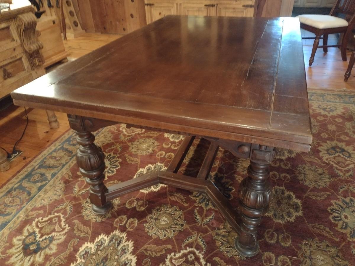 Georgian Design Dining Table with Pull-Out End Leaf Extensions PLEASE NOTE:. Due to no internet connection or wireless service, all invoices must be prepaid via PayPal, Stripe, or Zelle prior to arrival at pick up. Exact change cash onsite is acceptable but absolutely no debit or credit cards at time of pick up.