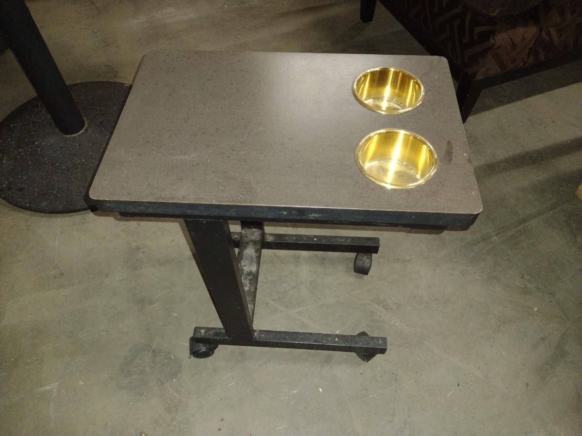 Mobile Side Table with Cup Holders Shipping option via freight or local mover is Buyer's responsibility and expense. Buyer must have all shipping scheduled within the stated dates and times of pickup. Recommended local movers are Beaty Bros. Moving 828-201-2982 and Carolina Pack n Go 828-489-9773