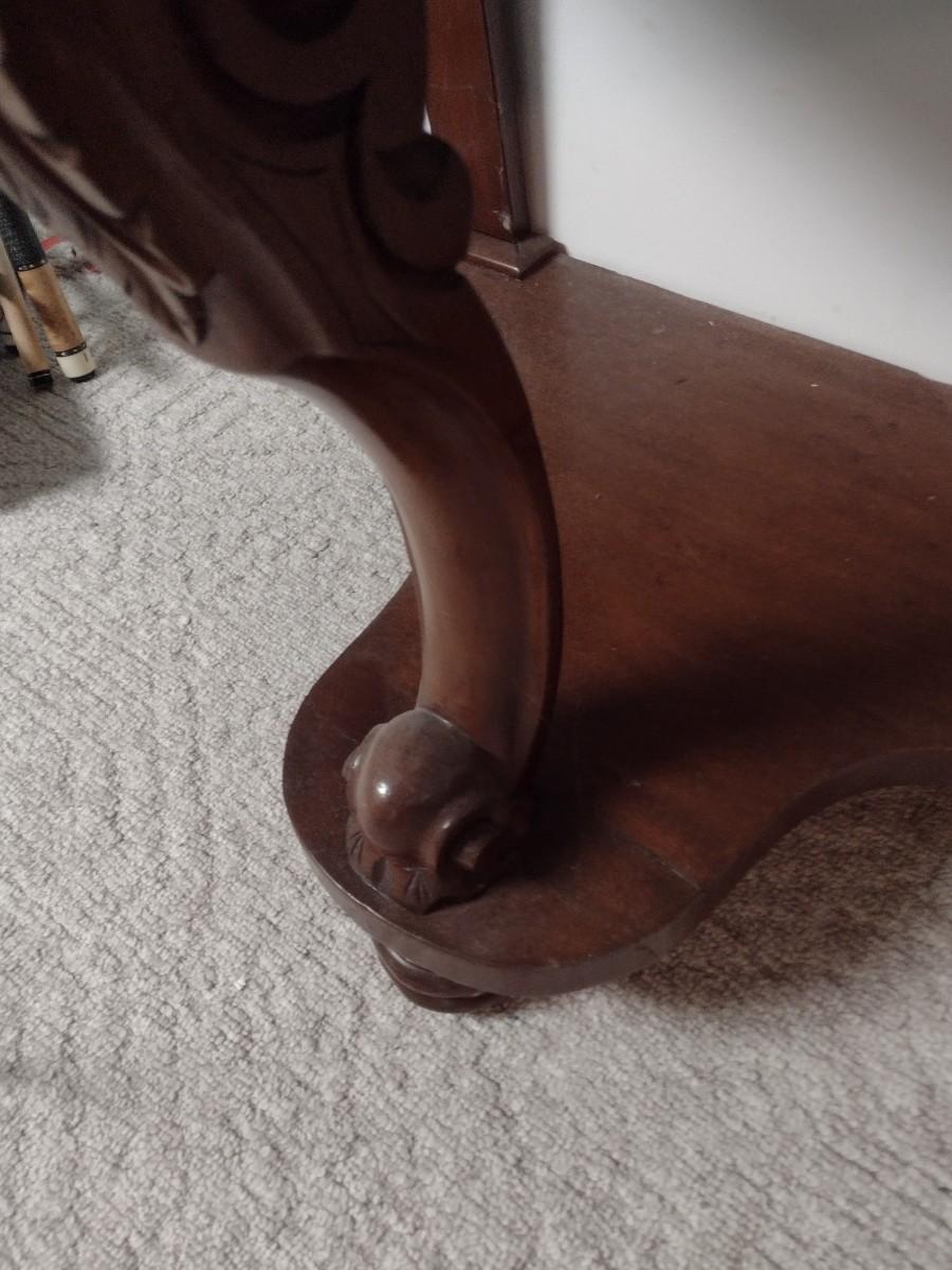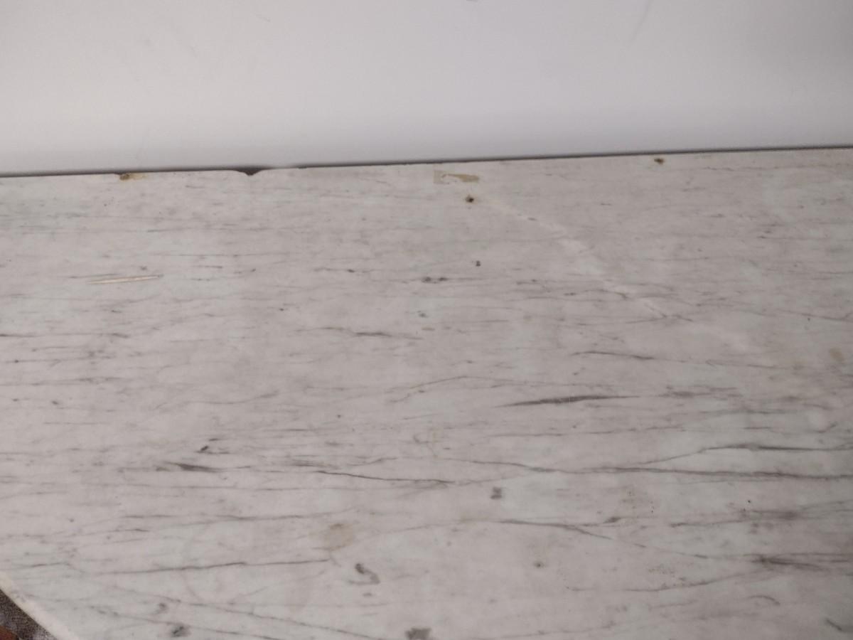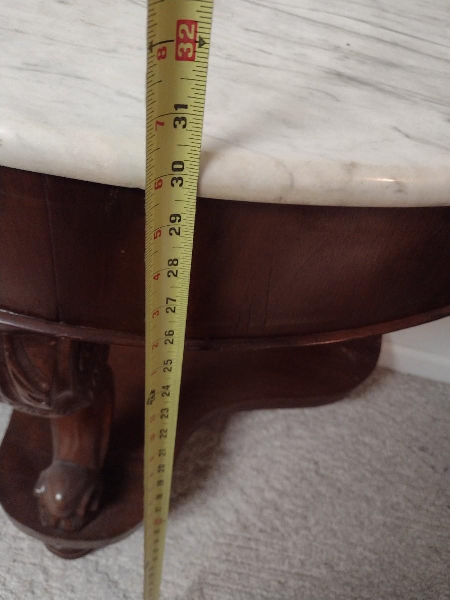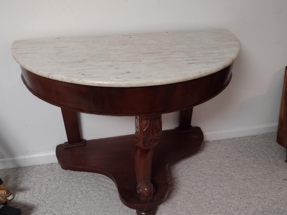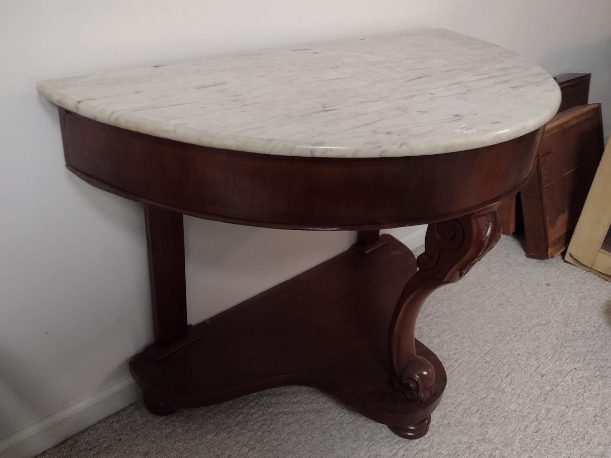 Vintage Mahogany Finish Demilune Marble Top Table lower level item. Will need assistance to remove from home.