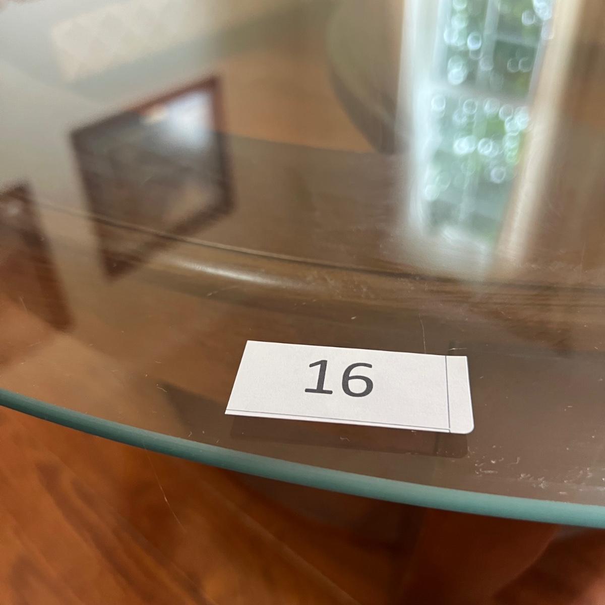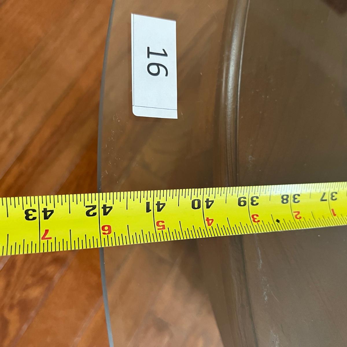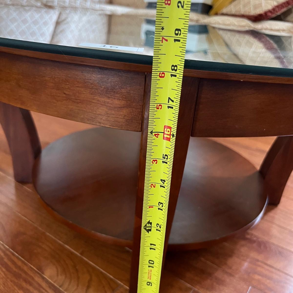 Glass top round table, see pictures for measurements. Wood shows some wear as shown in the pictures. Glass is in good condition, no chips or cracks.