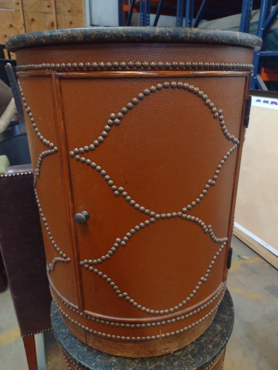 Marble Top Leather Design Finish Brass Tack Accent Round Side Table
