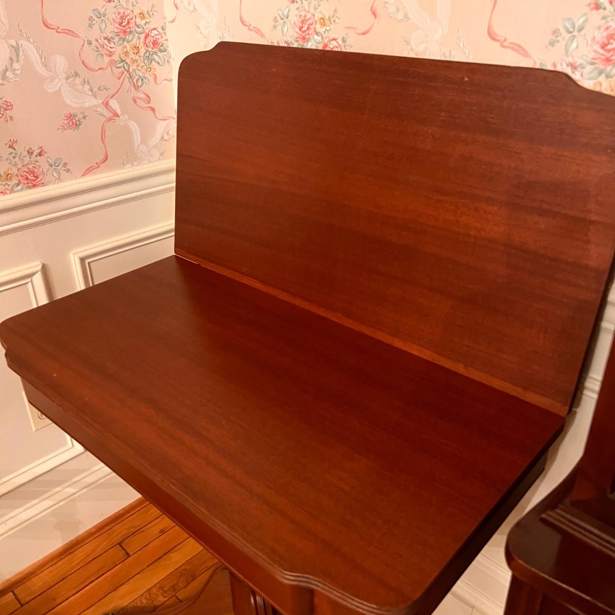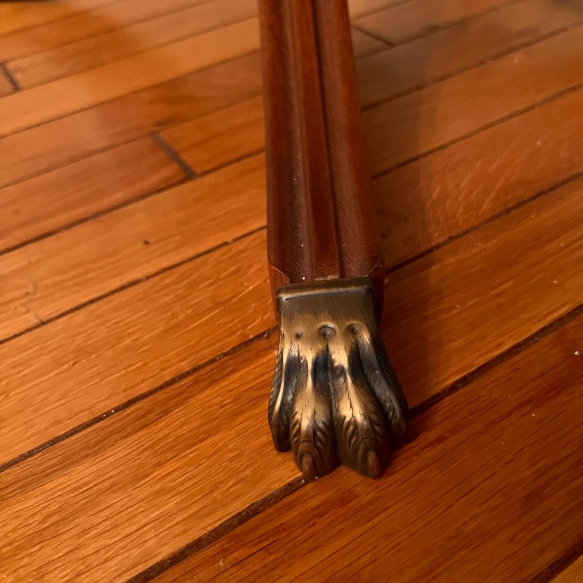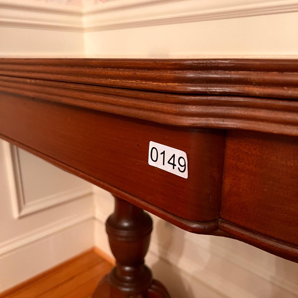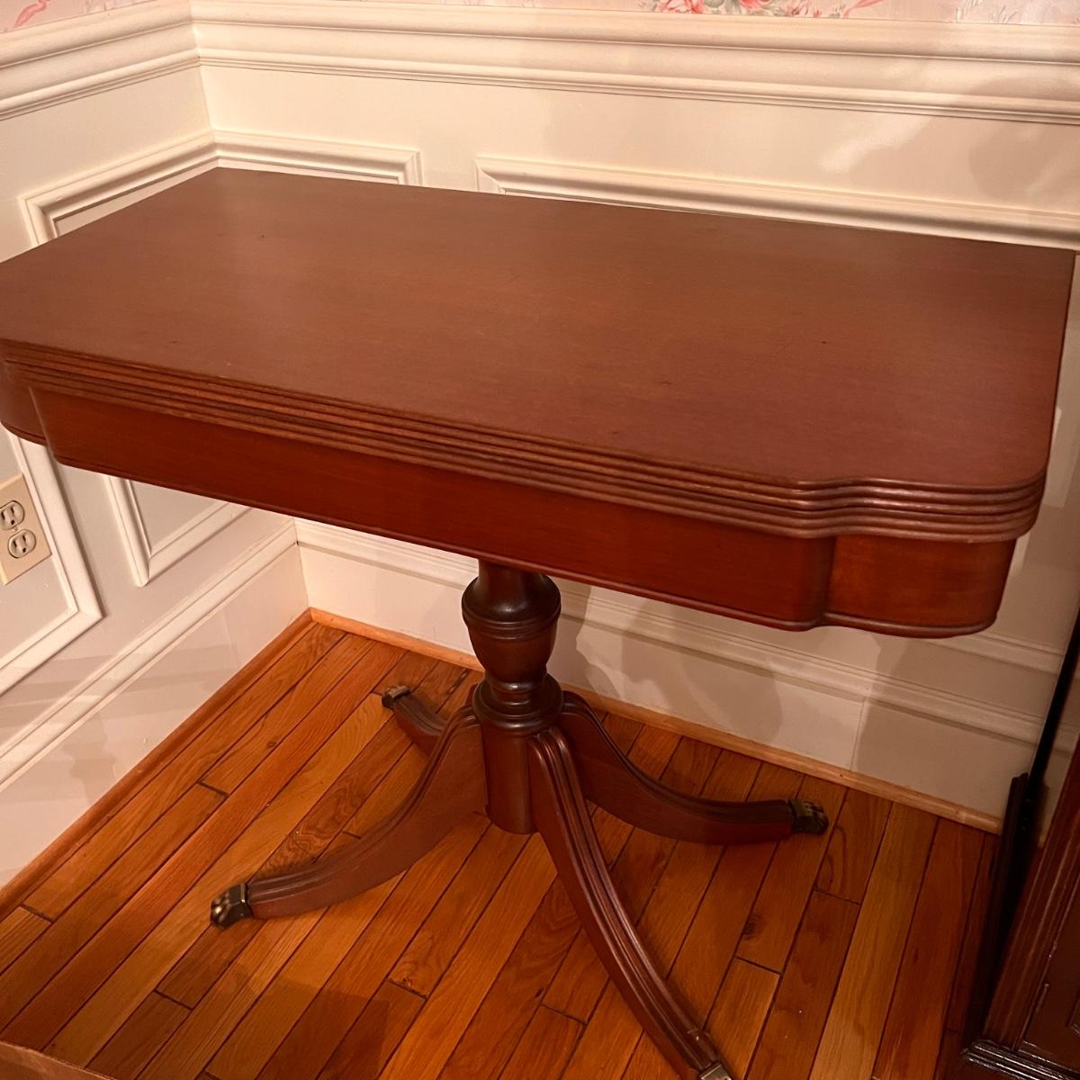 Solid wood game table / tea table with brass claw castors. It has a swivel top that opens to double its size. It measures 29" tall, is 18" deep and 36" wide when closed. Opened its a 36" diameter square. In good condition. Has a mark as shown in second to last picture.