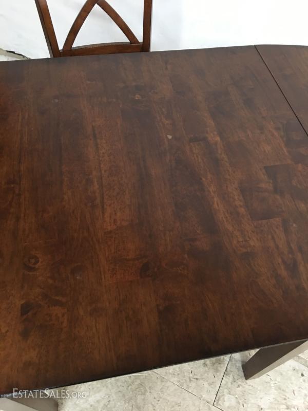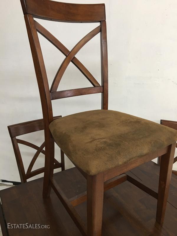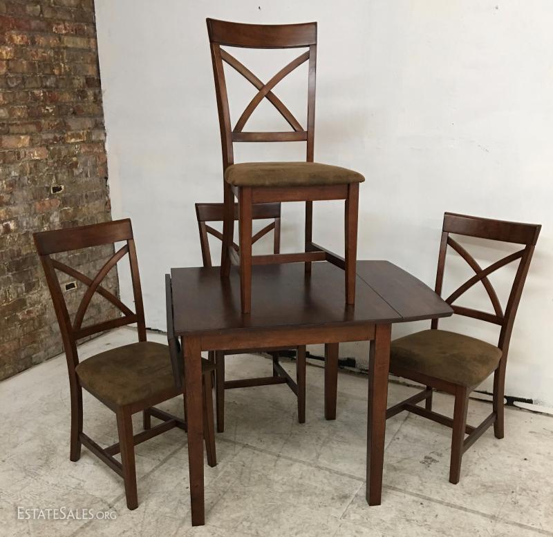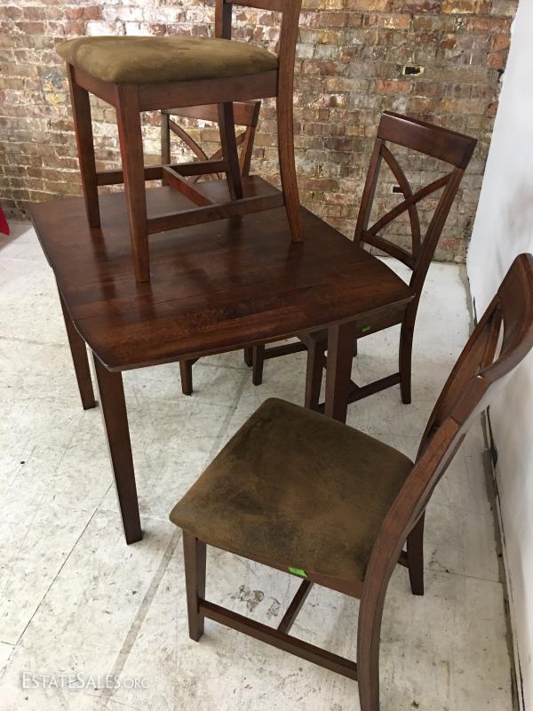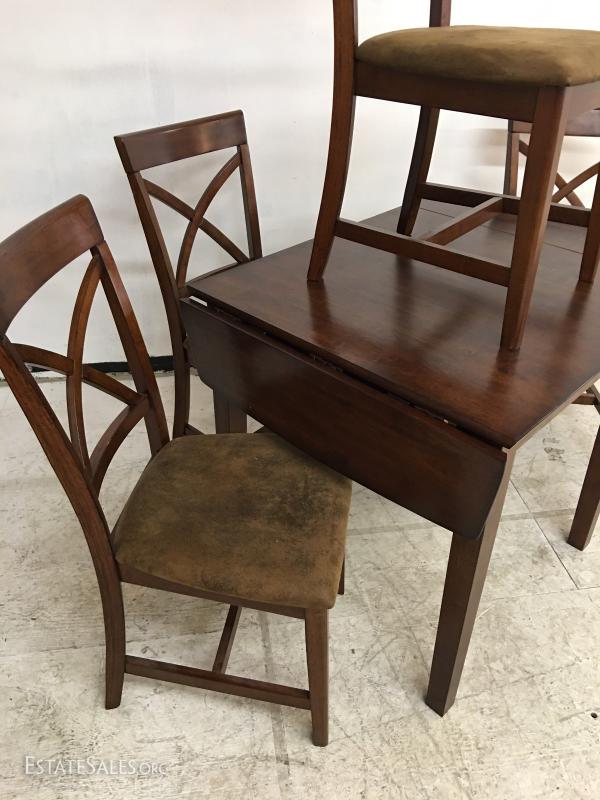 Table and 4 Chairs, Drop Leaf Mahogany Finish, Ultra Suede Seats. Measures 48" by 30" with the leaves up. In excellent condition with very slight wear to top from use.