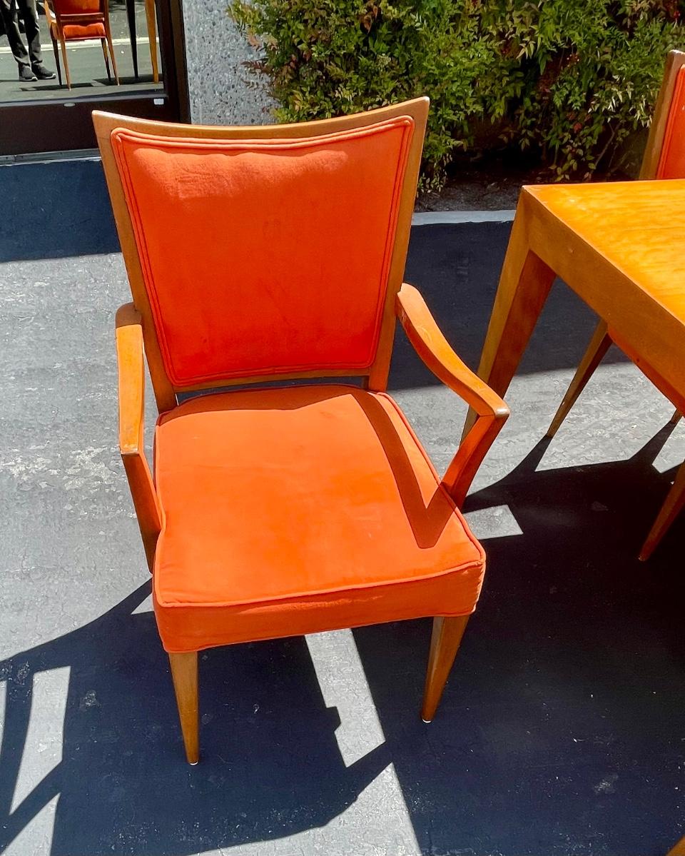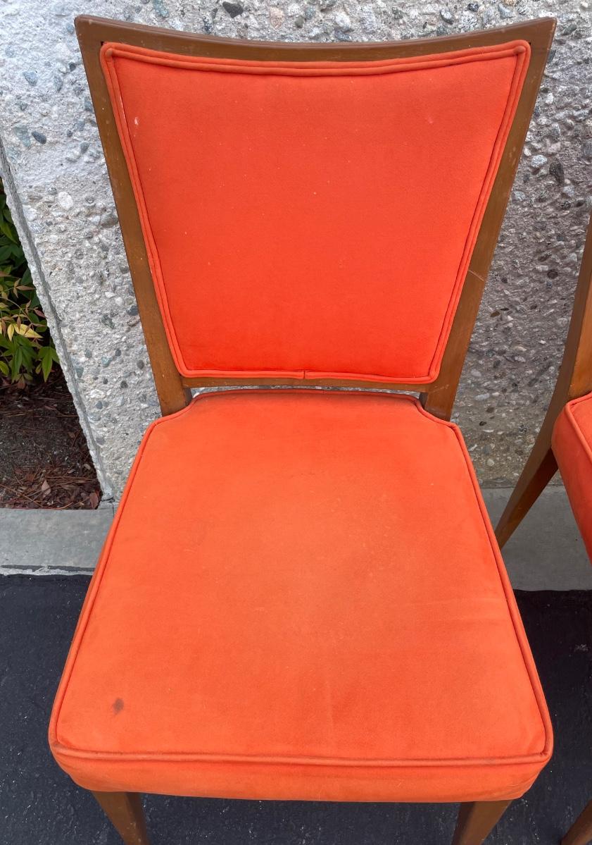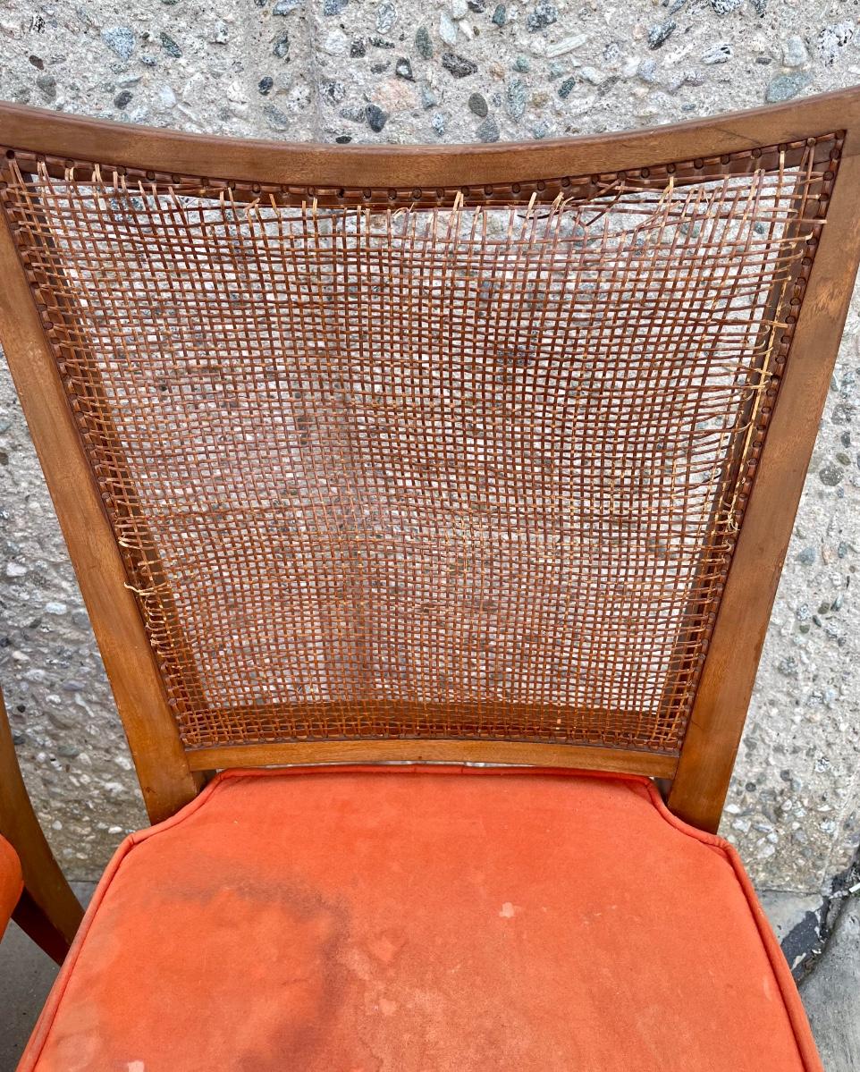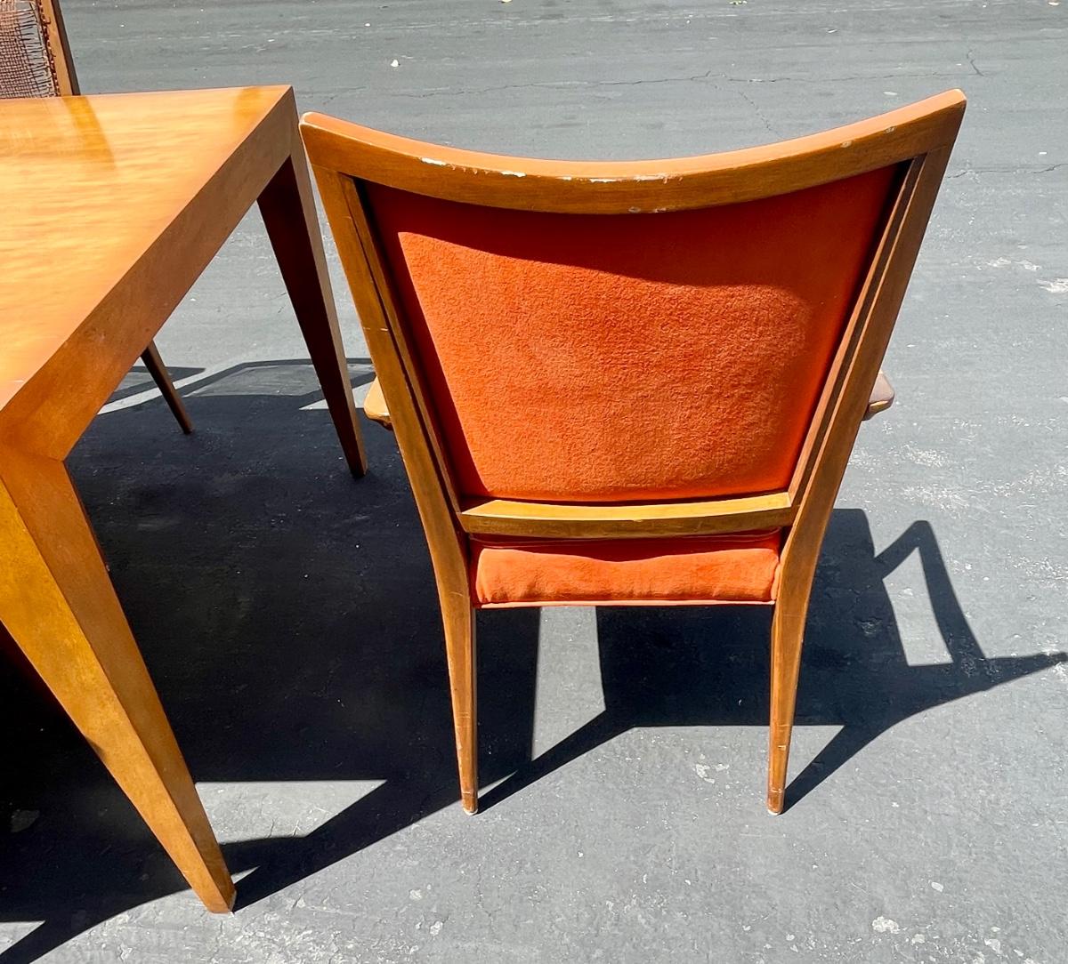 Solid table include 24" leaf and full set of table top pads. 8 chairs includes: 2 end chairs with arms with orange upholstered seats and backs, 3 side chairs with orange upholstered seats and backs, and 3 wicker-back side chairs with upholstered seats. Upholstery is orange fabric, some have spots/stains. 2 of the wicker backs have damage. See photos for details. Chairs are solid wood construction.