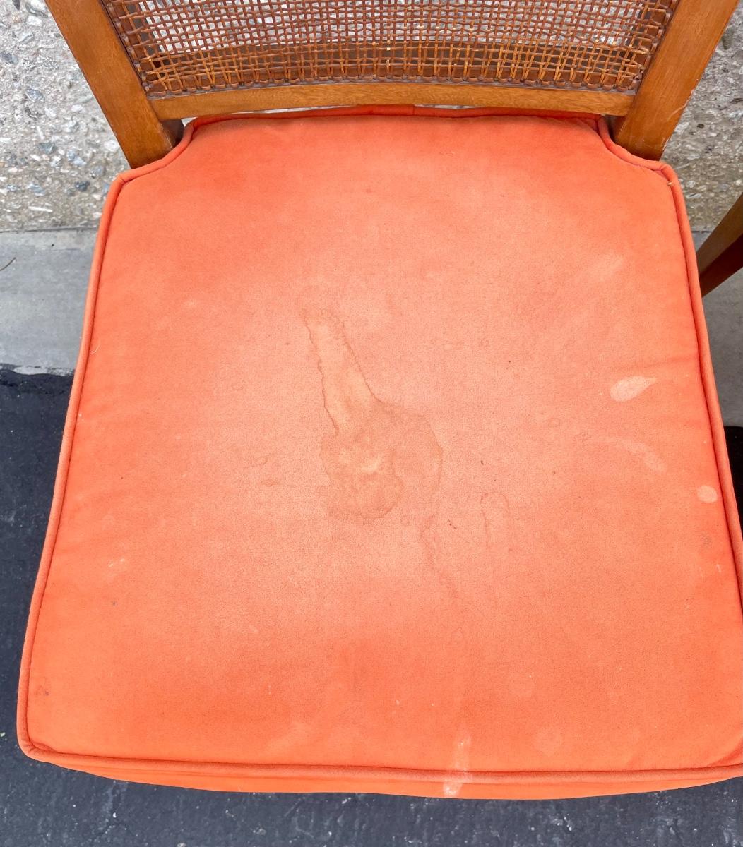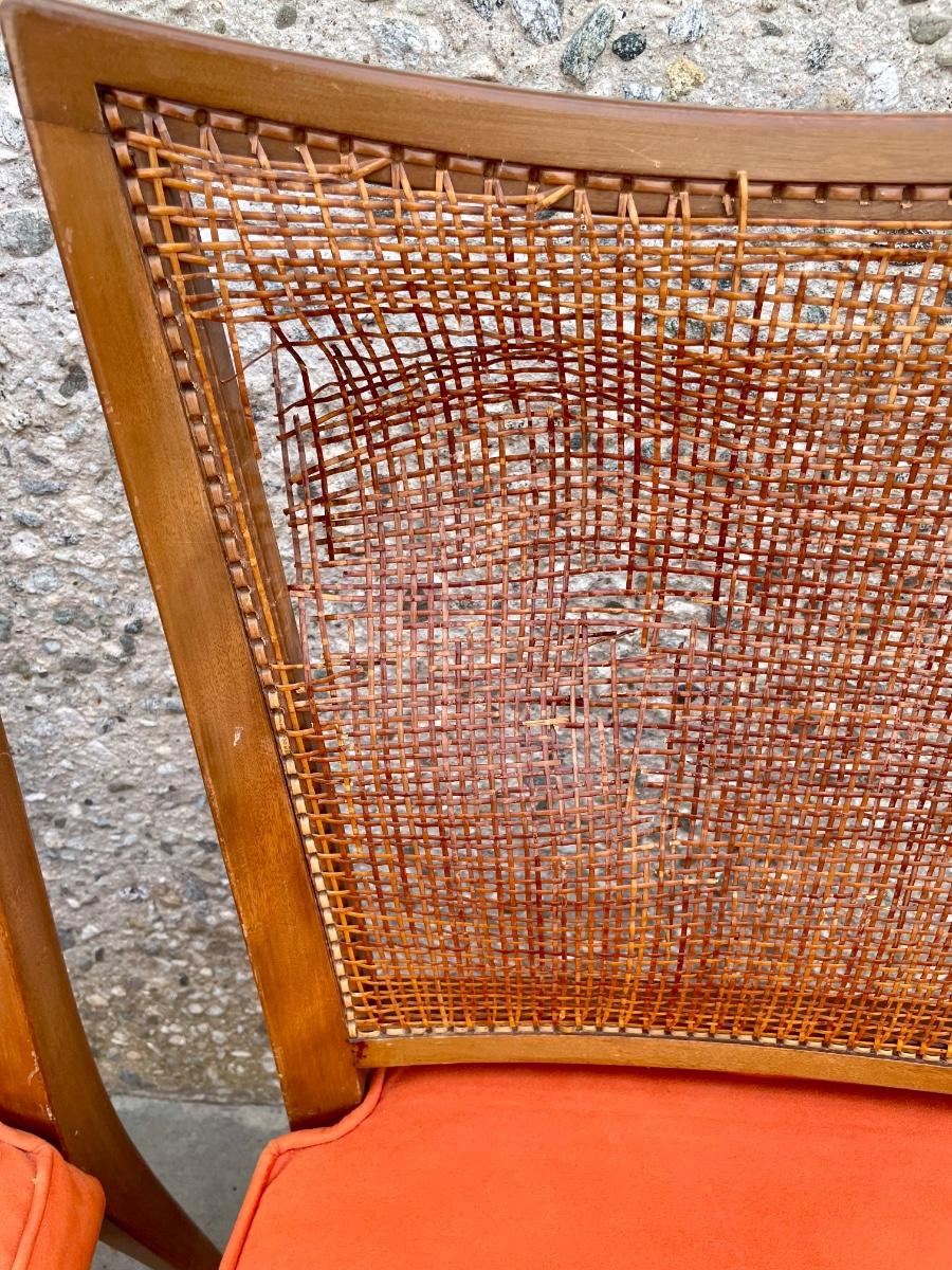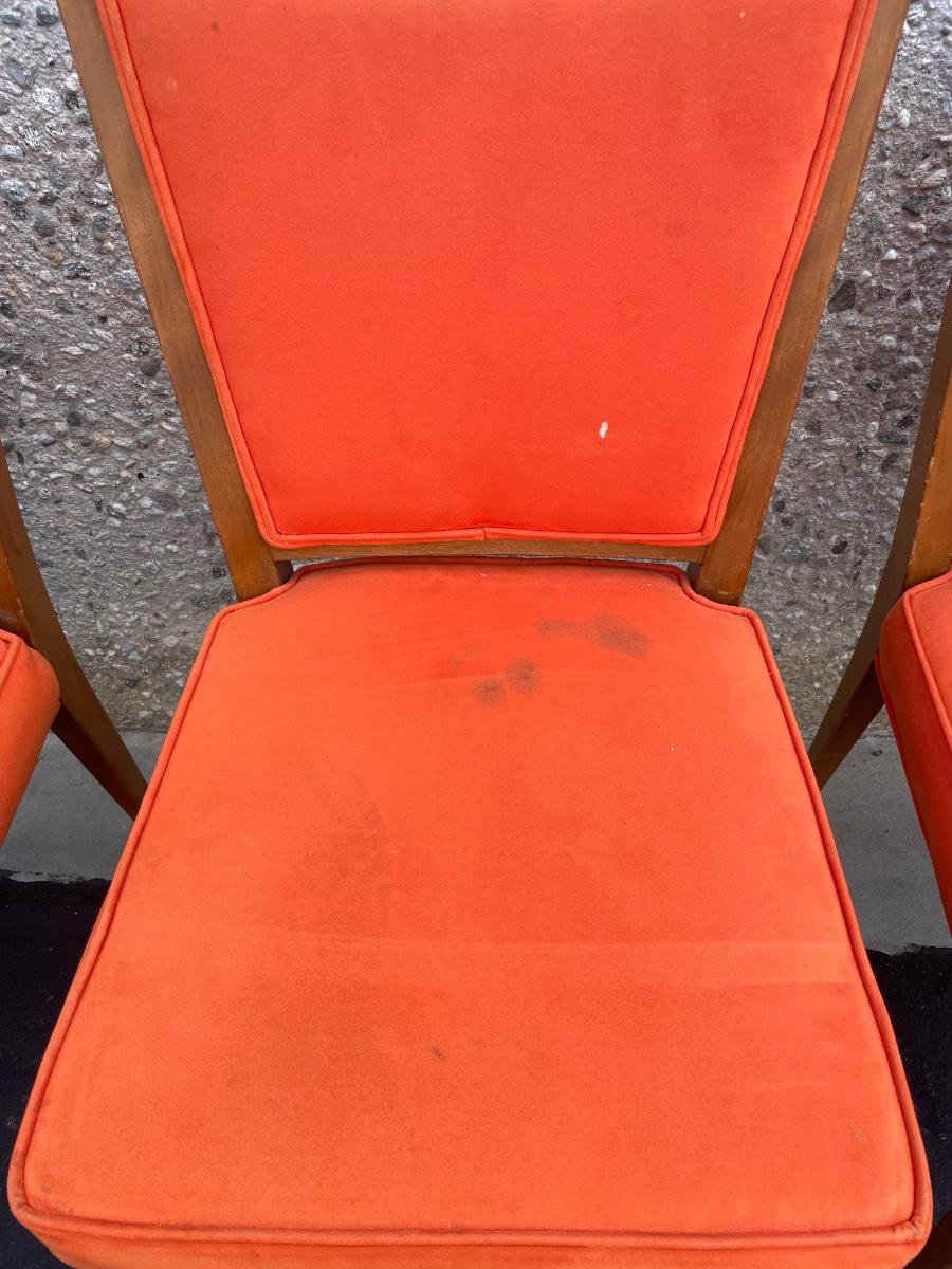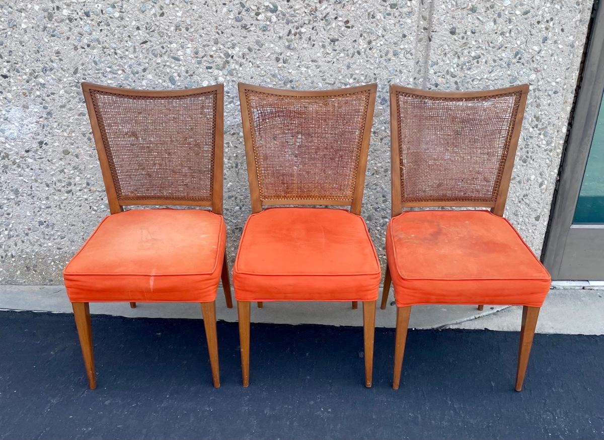 Solid table include 24" leaf and full set of table top pads. 8 chairs includes: 2 end chairs with arms with orange upholstered seats and backs, 3 side chairs with orange upholstered seats and backs, and 3 wicker-back side chairs with upholstered seats. Upholstery is orange fabric, some have spots/stains. 2 of the wicker backs have damage. See photos for details. Chairs are solid wood construction.