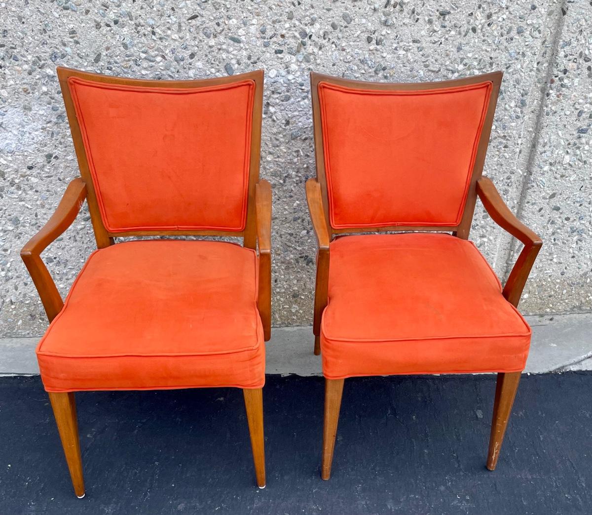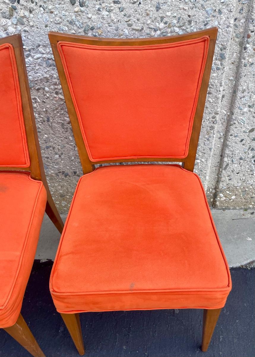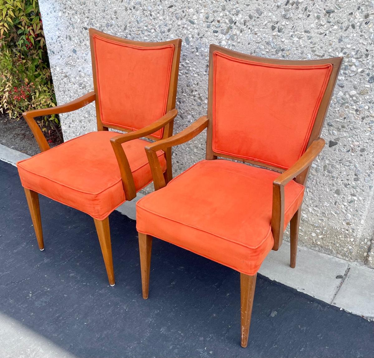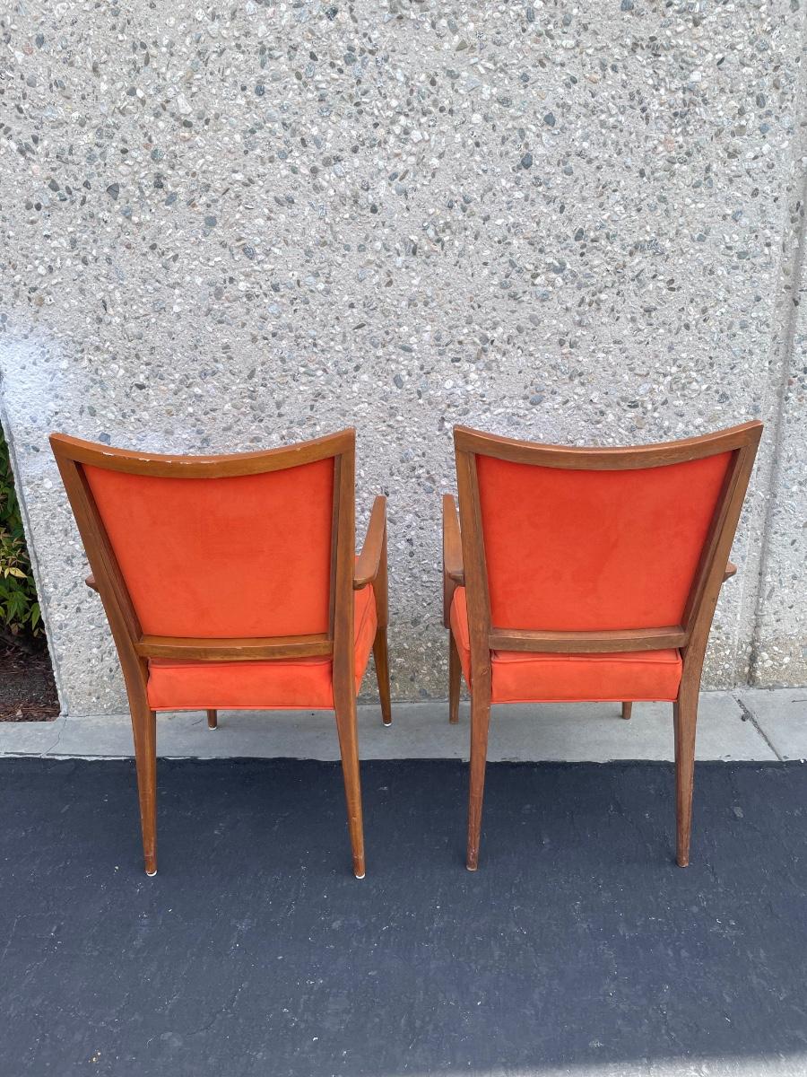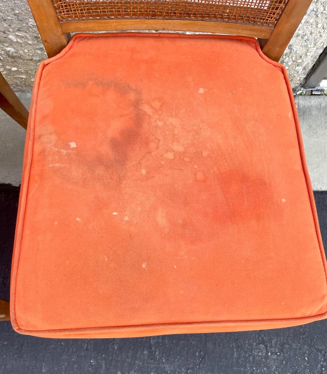 Solid table include 24" leaf and full set of table top pads. 8 chairs includes: 2 end chairs with arms with orange upholstered seats and backs, 3 side chairs with orange upholstered seats and backs, and 3 wicker-back side chairs with upholstered seats. Upholstery is orange fabric, some have spots/stains. 2 of the wicker backs have damage. See photos for details. Chairs are solid wood construction.