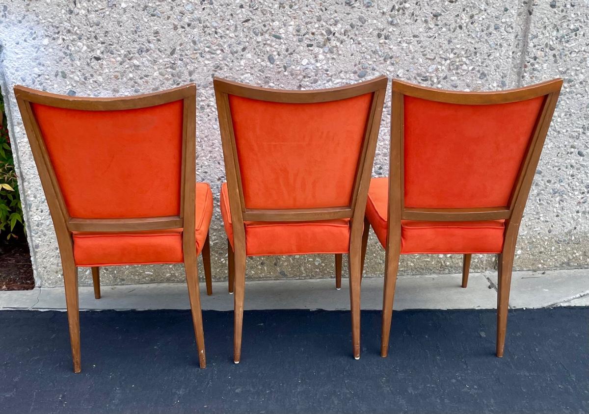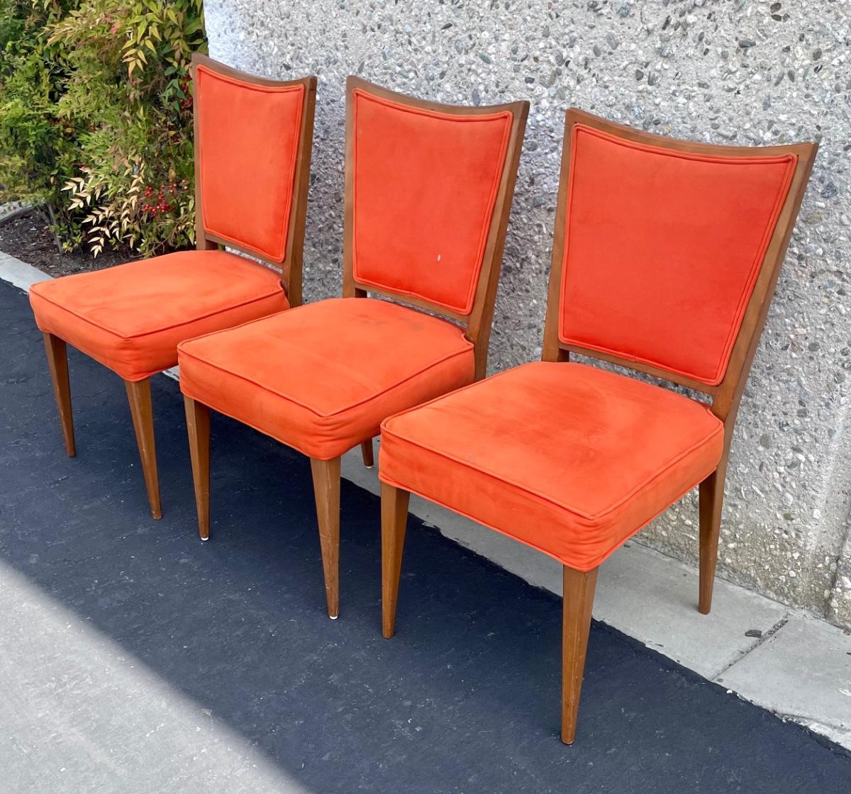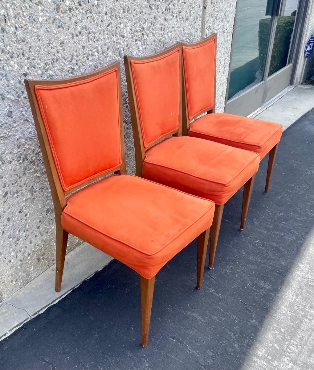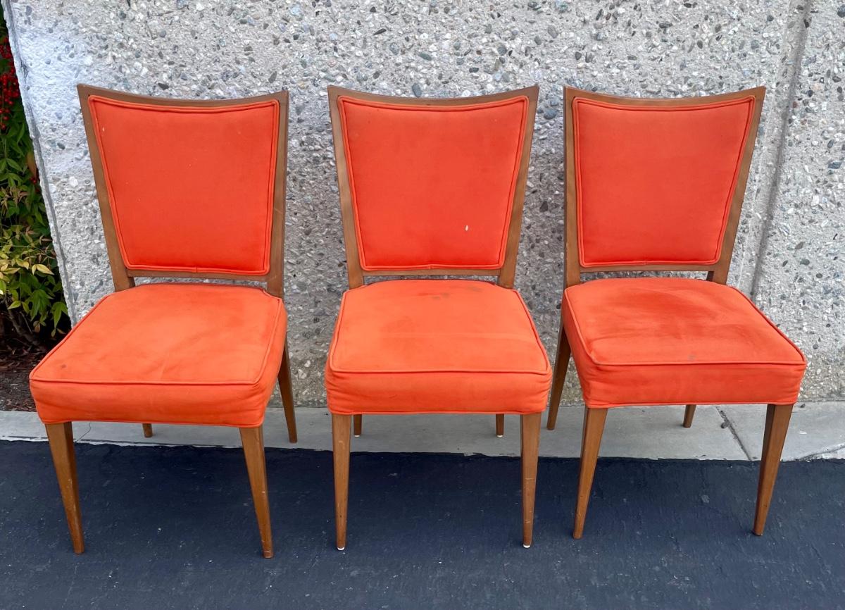 Solid table include 24" leaf and full set of table top pads. 8 chairs includes: 2 end chairs with arms with orange upholstered seats and backs, 3 side chairs with orange upholstered seats and backs, and 3 wicker-back side chairs with upholstered seats. Upholstery is orange fabric, some have spots/stains. 2 of the wicker backs have damage. See photos for details. Chairs are solid wood construction.