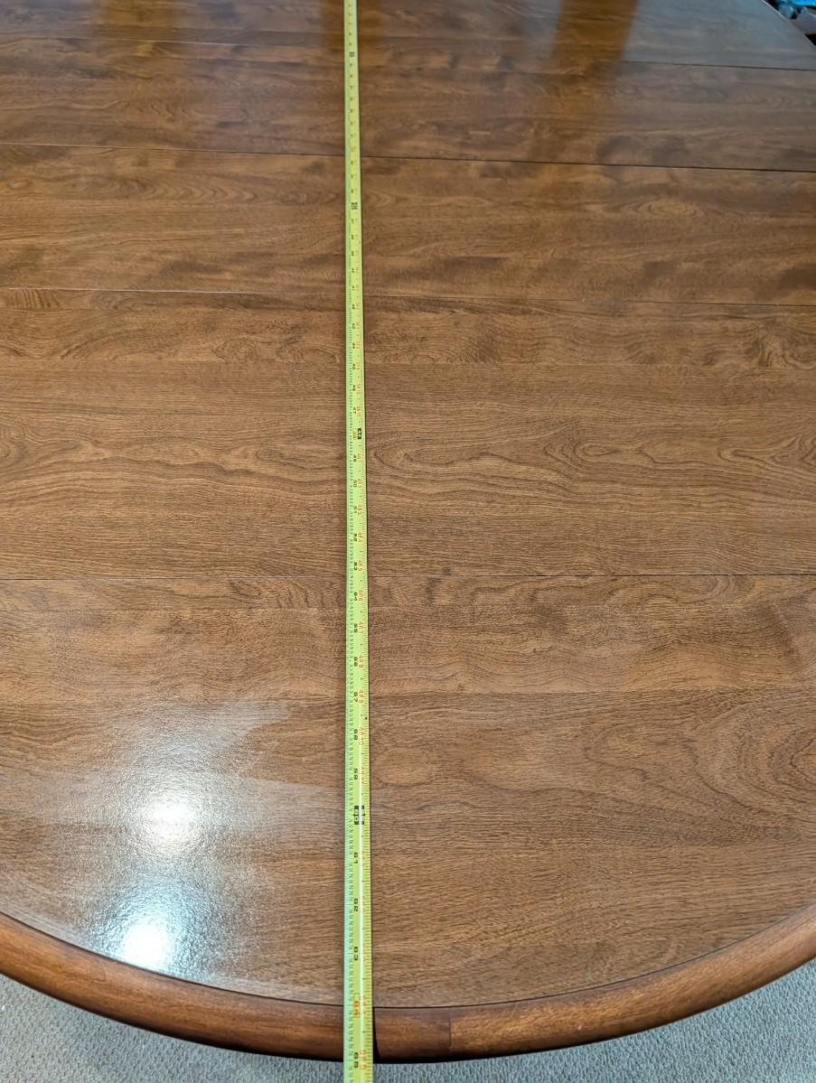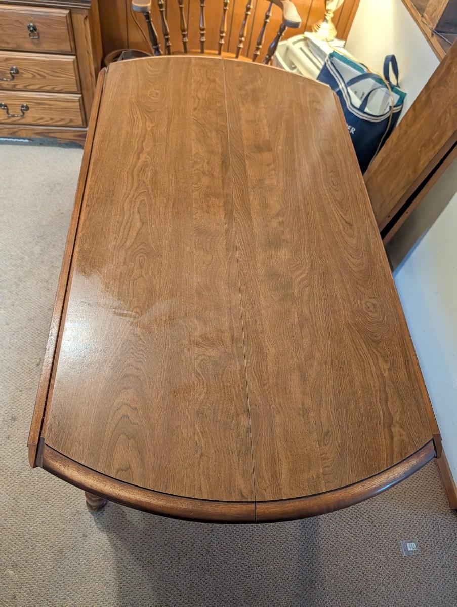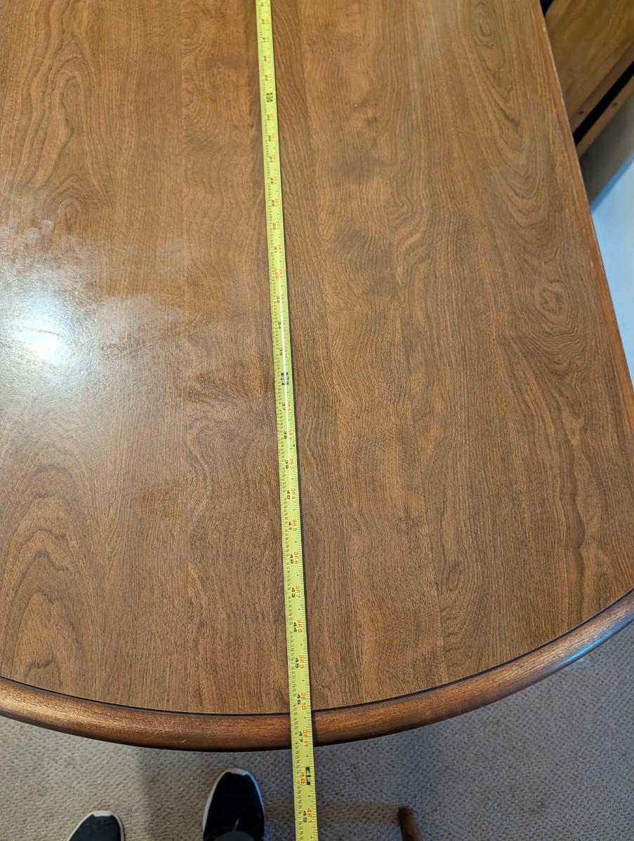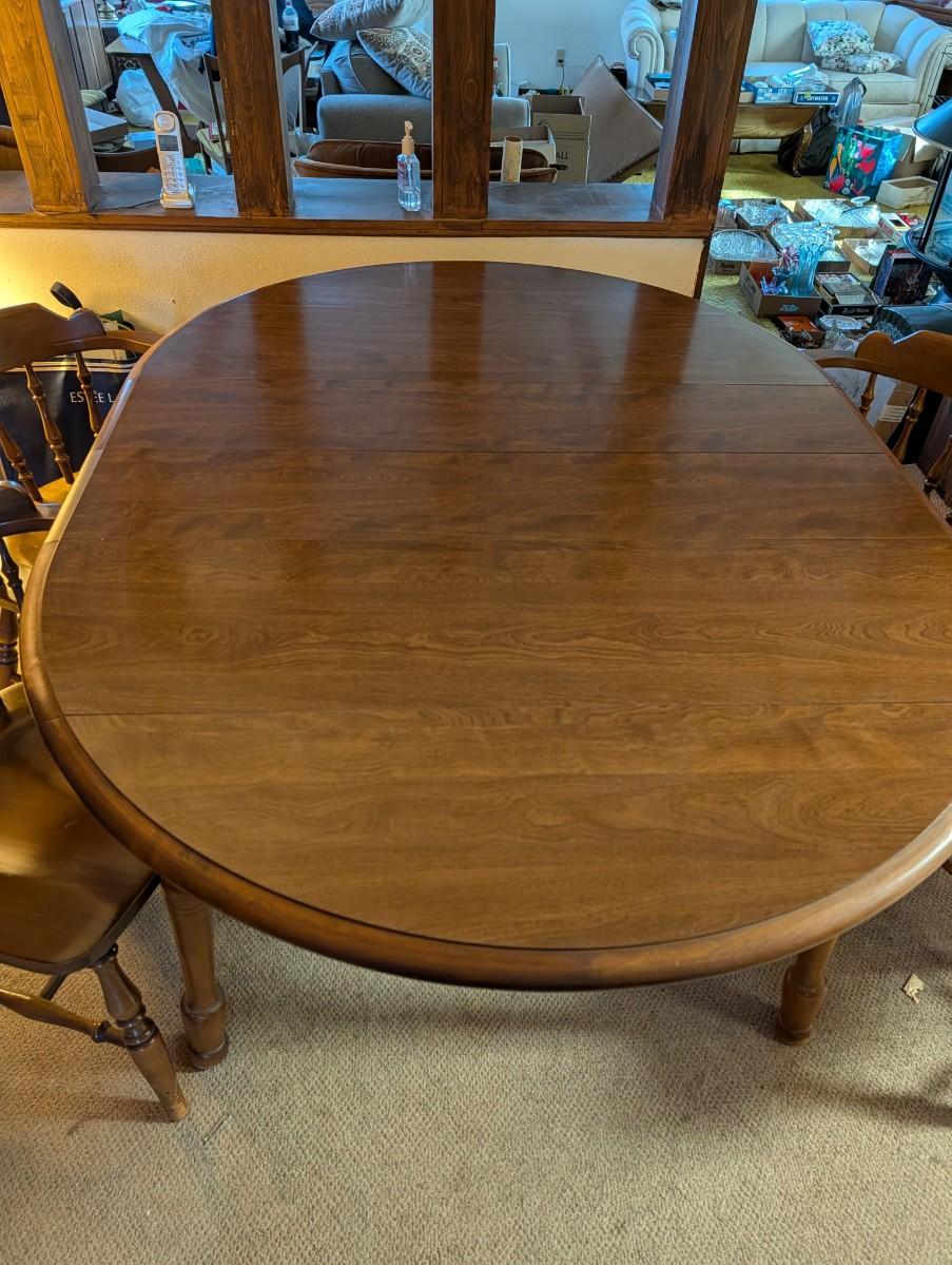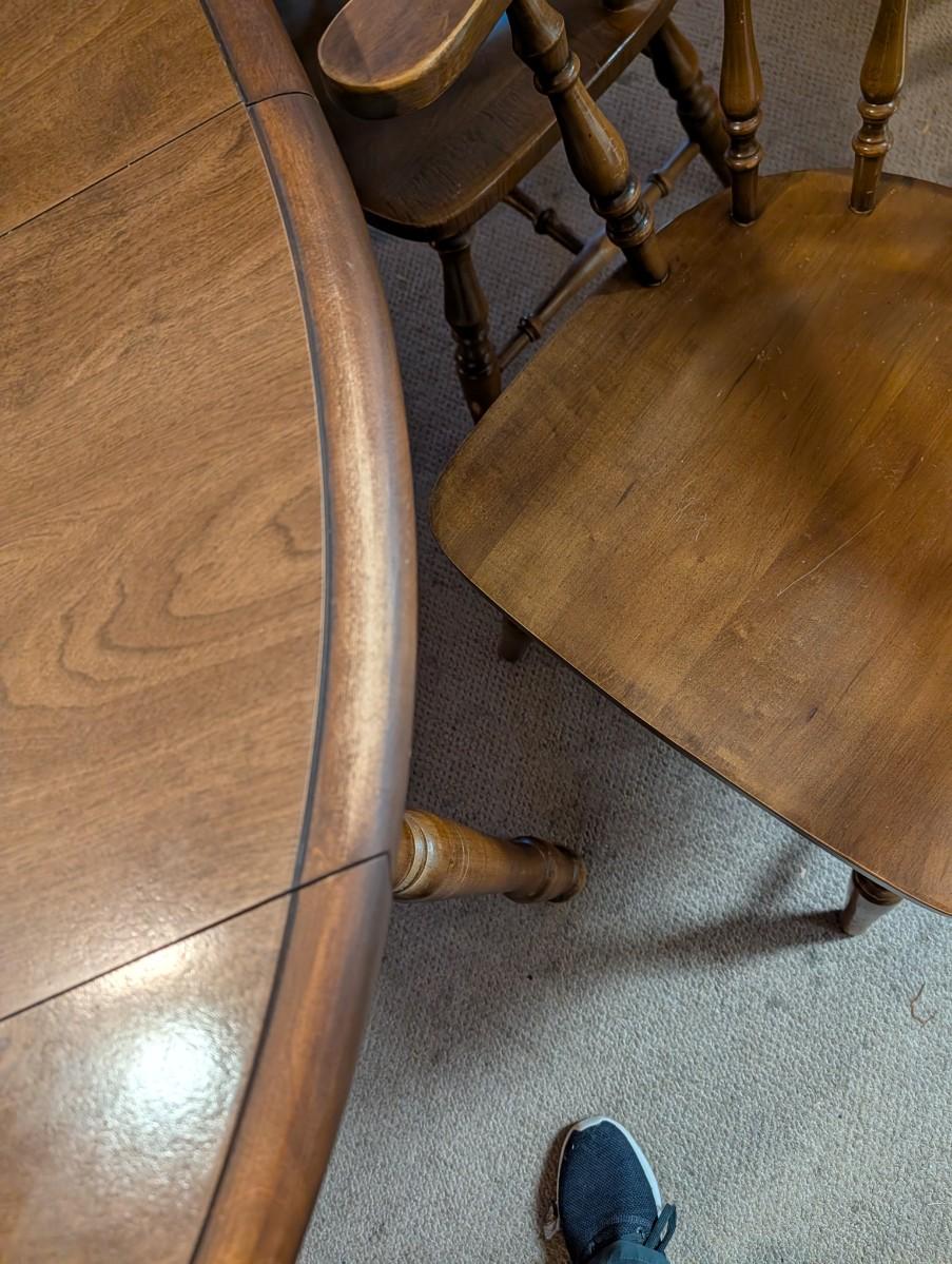Table and chairs includes 2 leafs. Pictures show the sizes the table can be, and the places where there is wear.