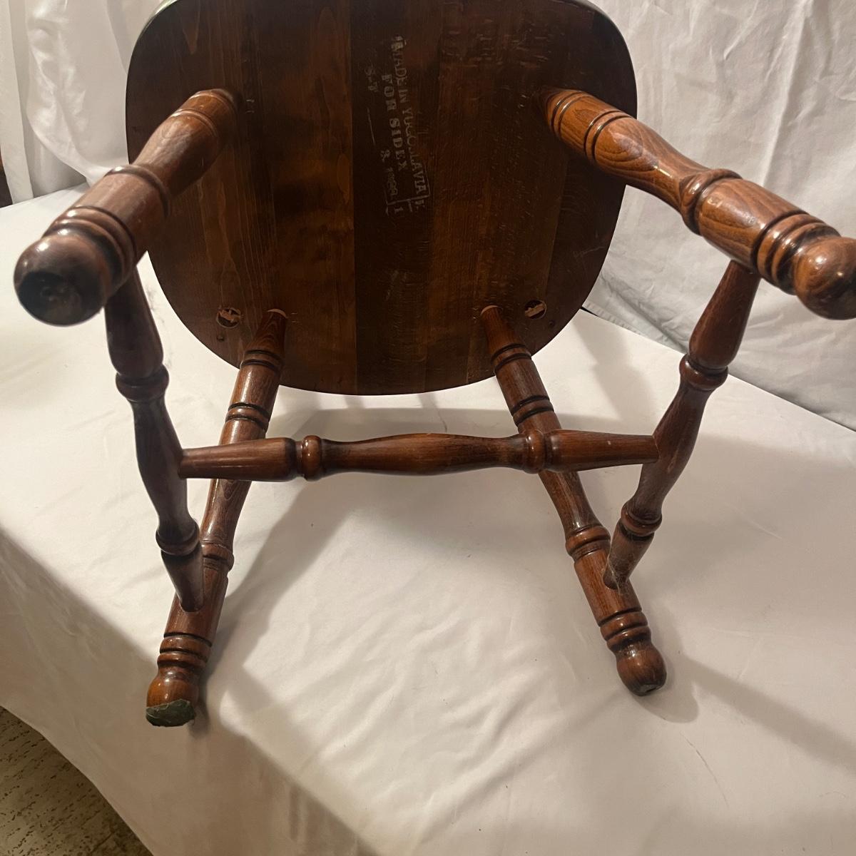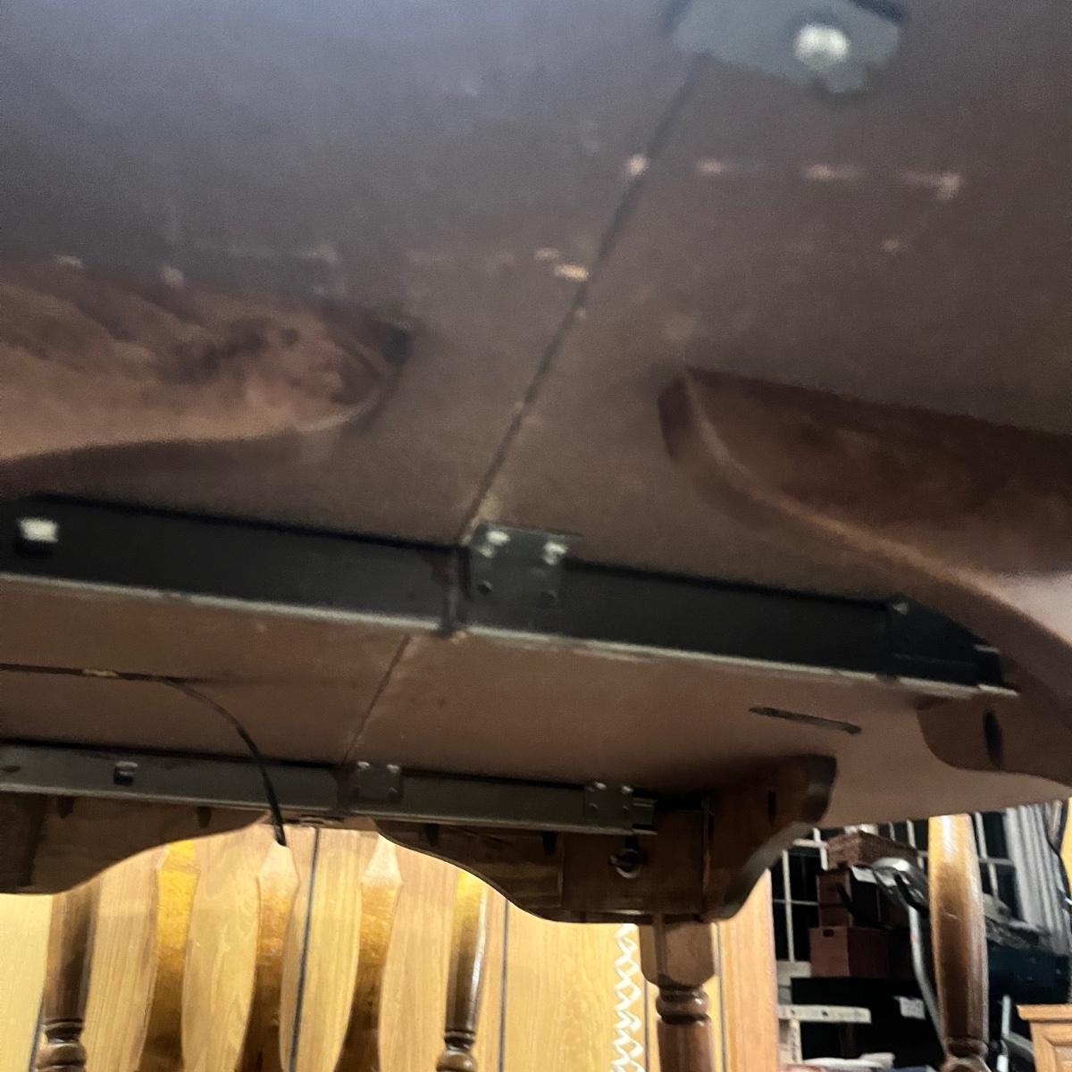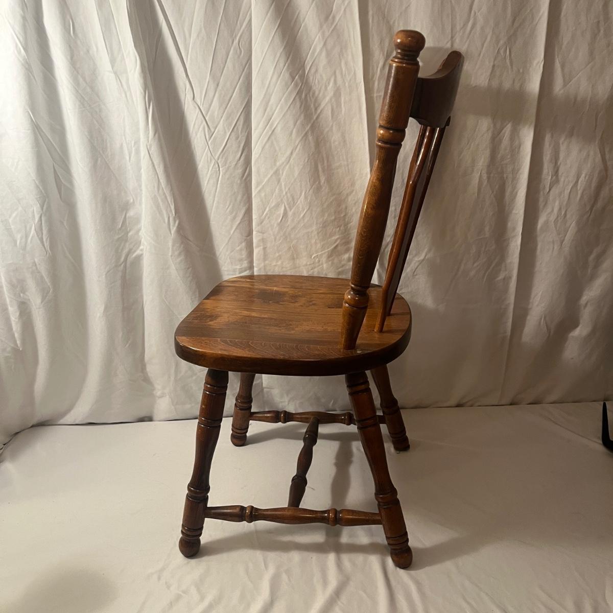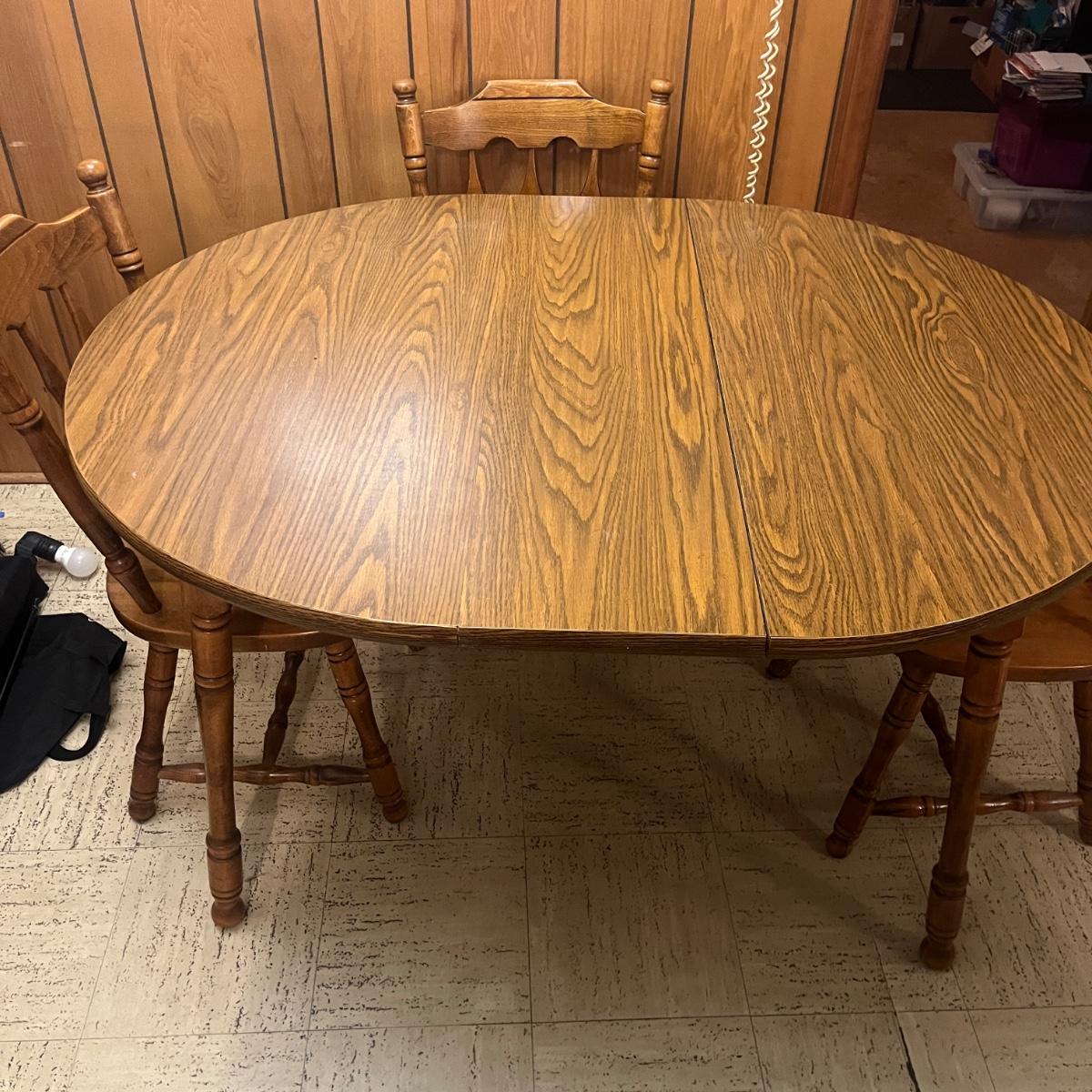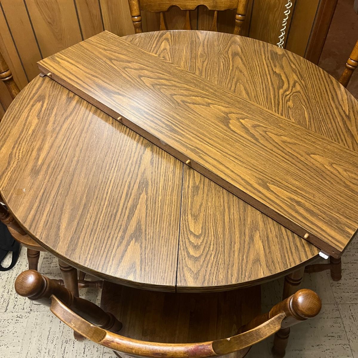 Lot includes four chairs and a table with one leaf. Table measures 42”D x 29.5”H without leaf and 42” x 54” x 29.5”H with leaf. Chairs are solid wood and table has a veneer.