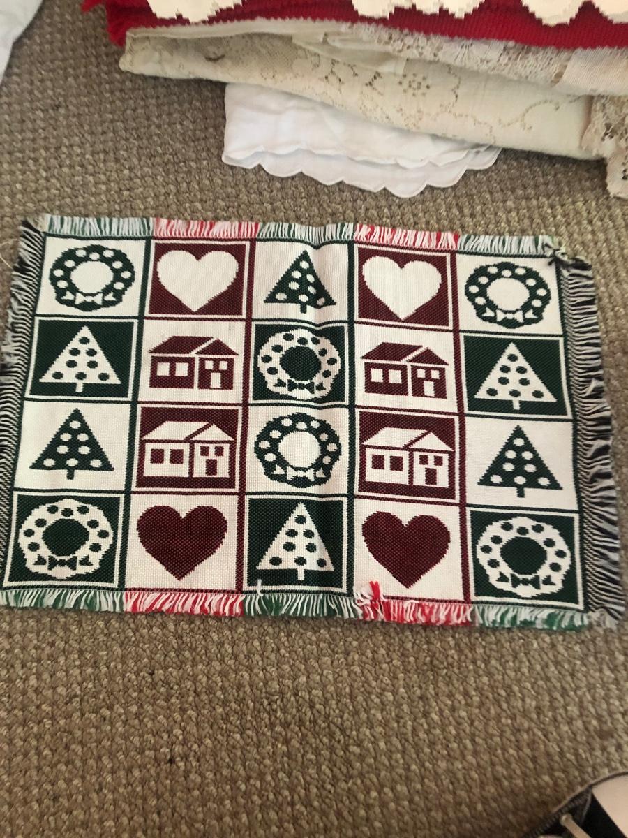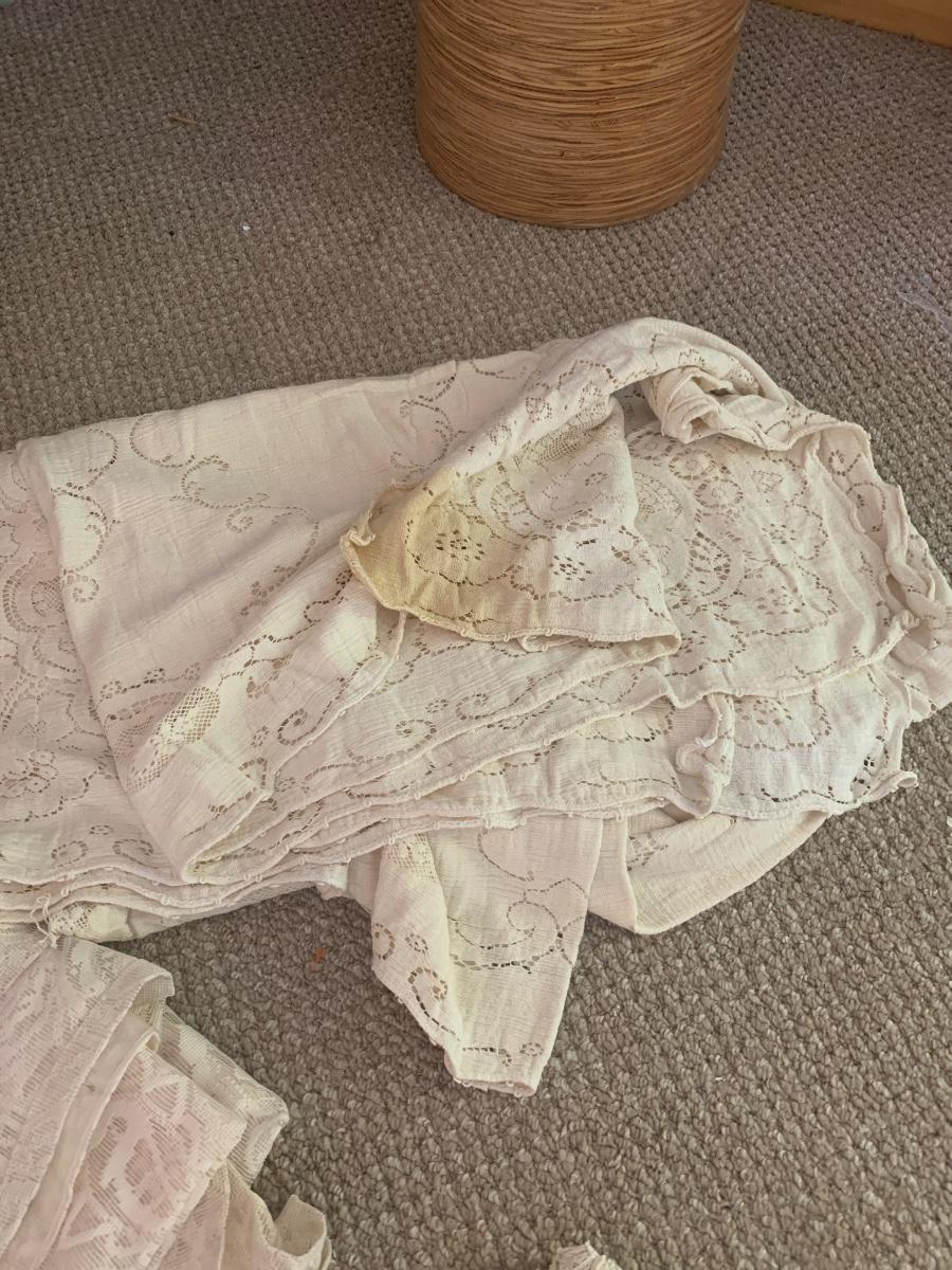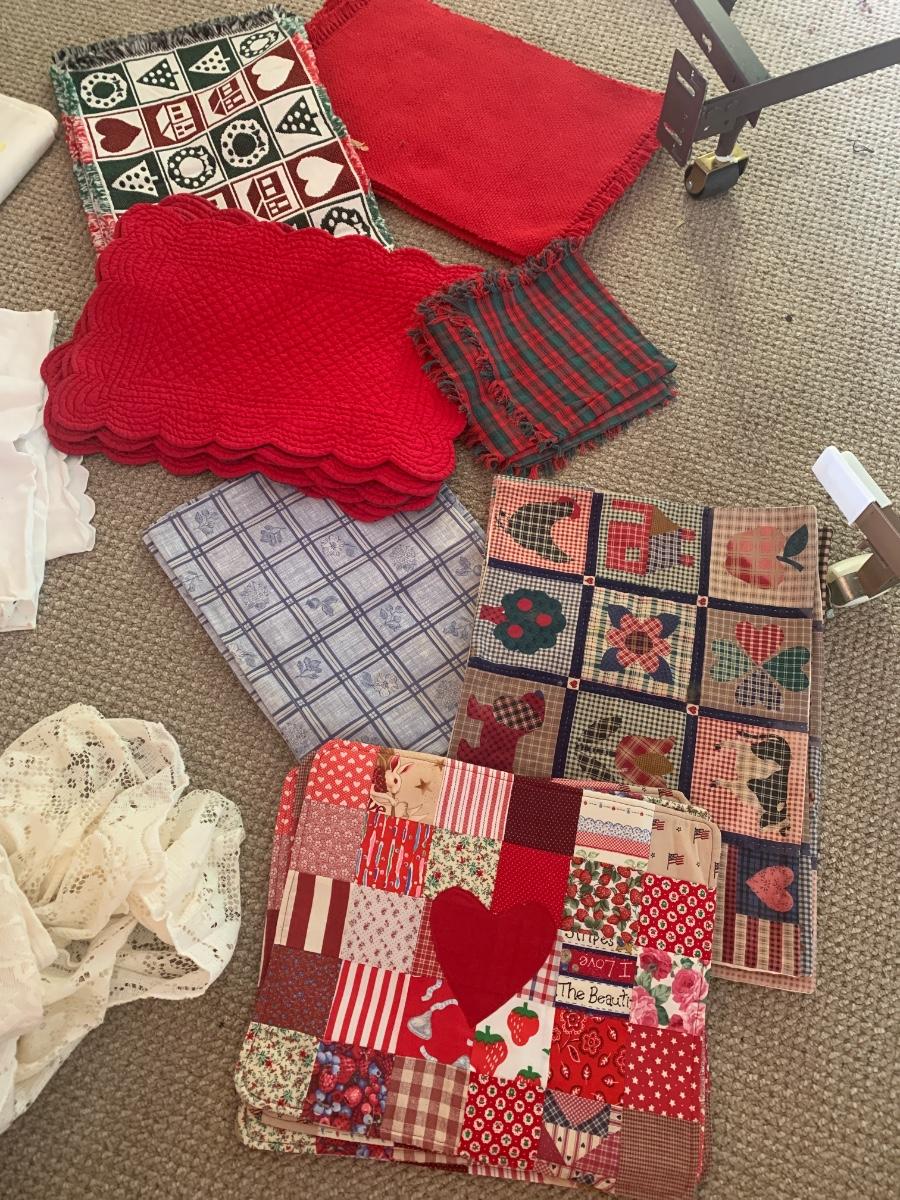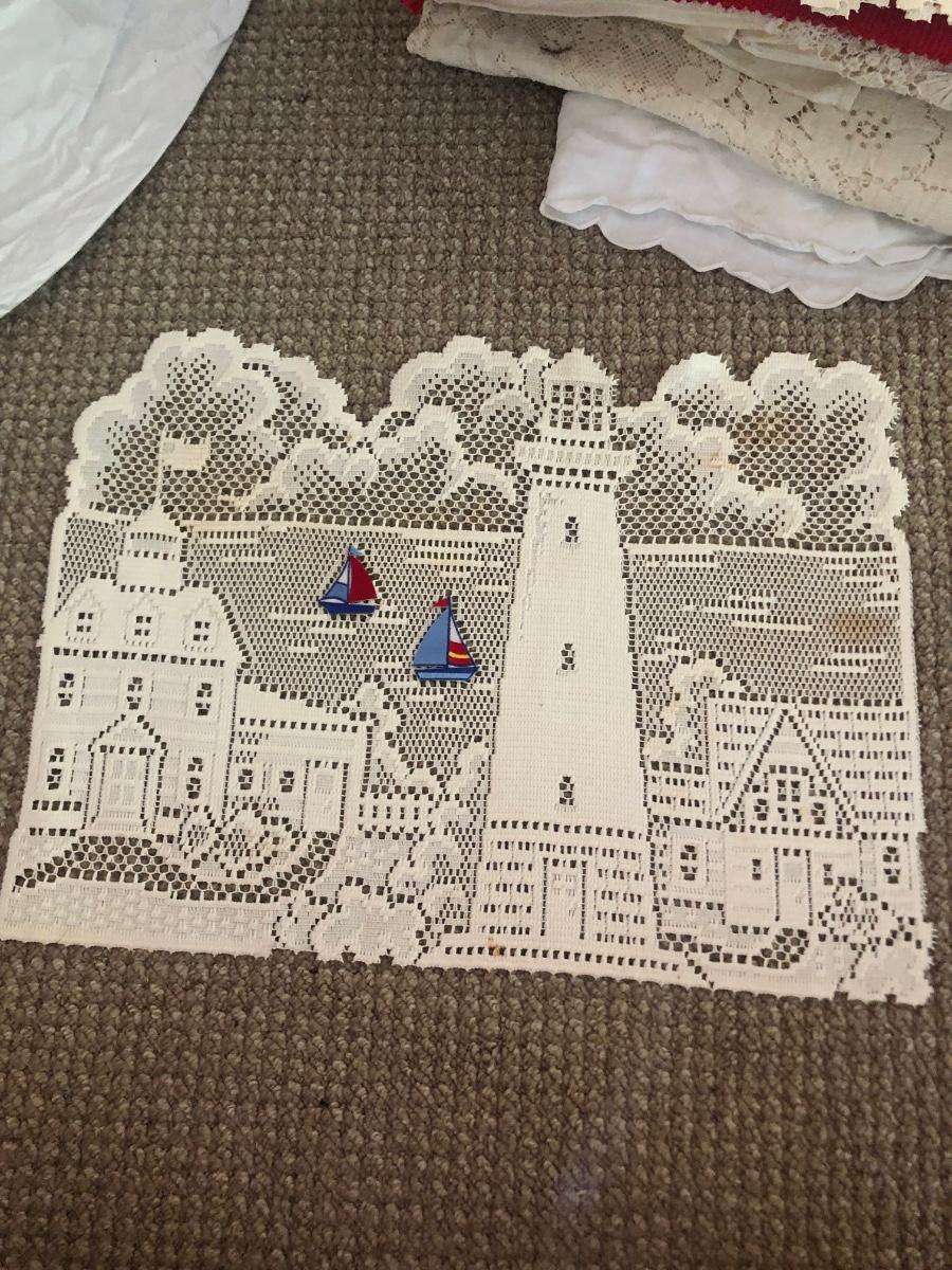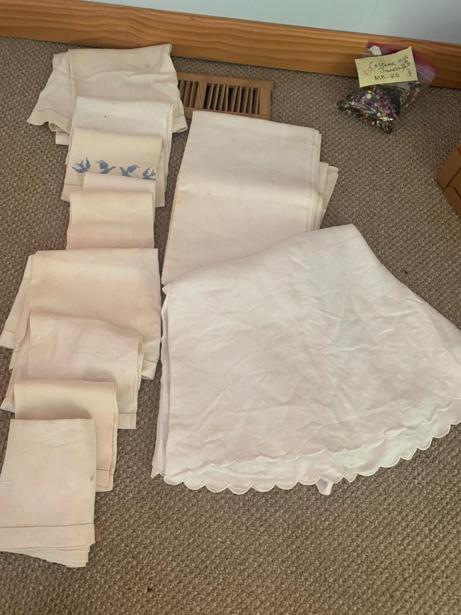 There are six sets of at least 4 of every style of place mat. Several linen hand towels and two linen table cloths (one oval one large rectangle). Three lace rectangular tablecloths and one shower curtain. Some of these pieces are stained but none are torn.