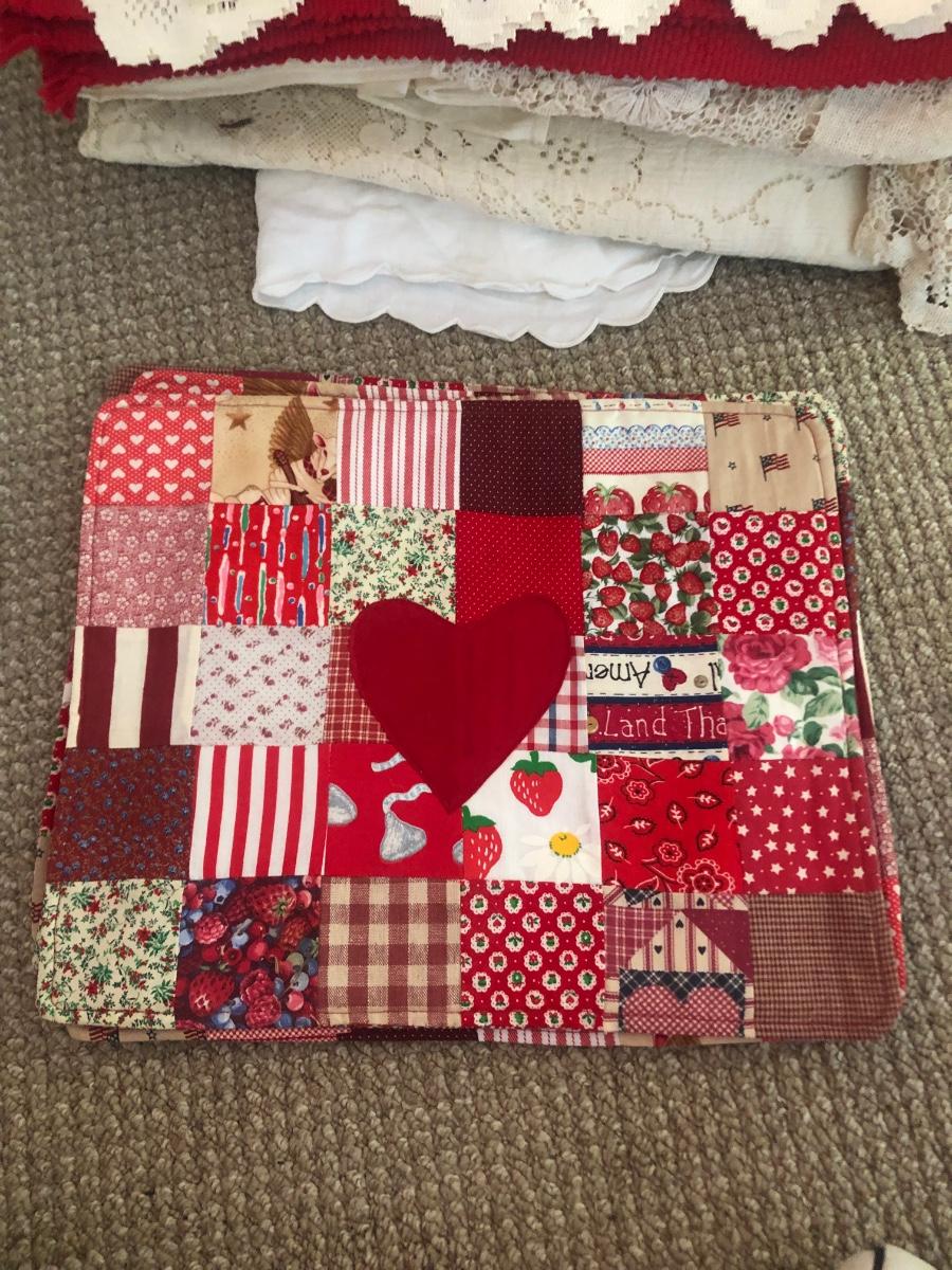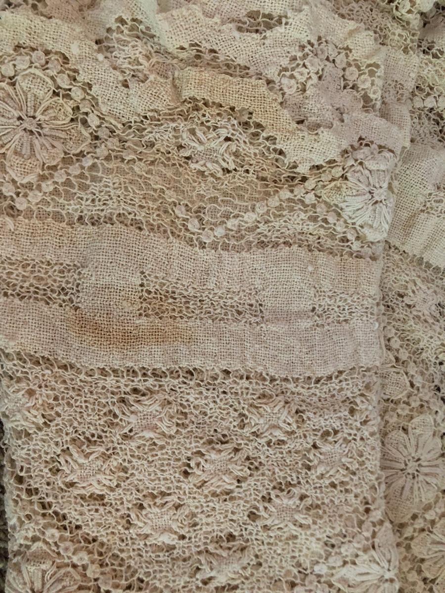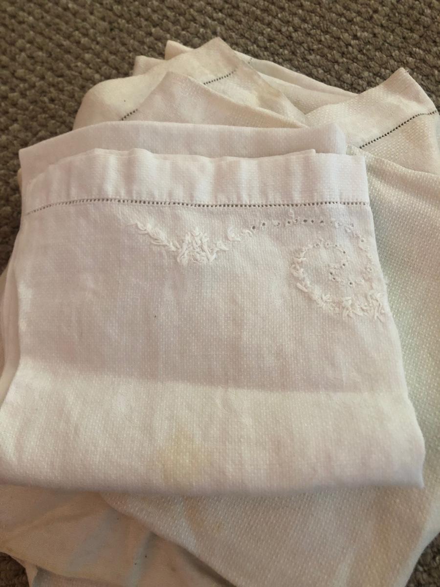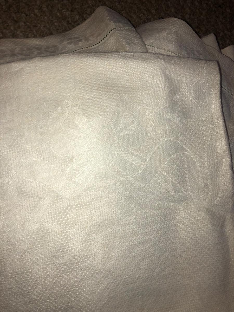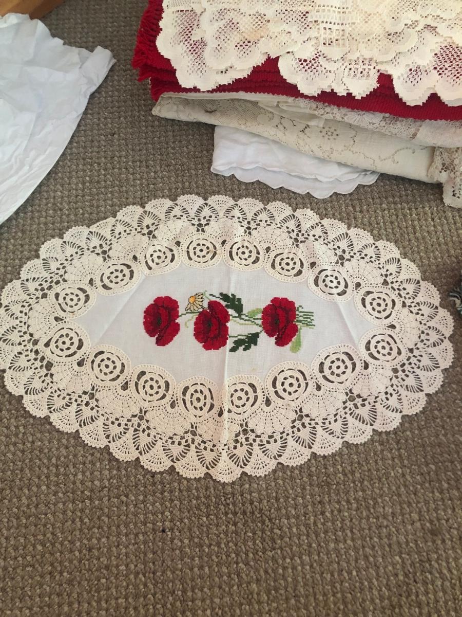 There are six sets of at least 4 of every style of place mat. Several linen hand towels and two linen table cloths (one oval one large rectangle). Three lace rectangular tablecloths and one shower curtain. Some of these pieces are stained but none are torn.