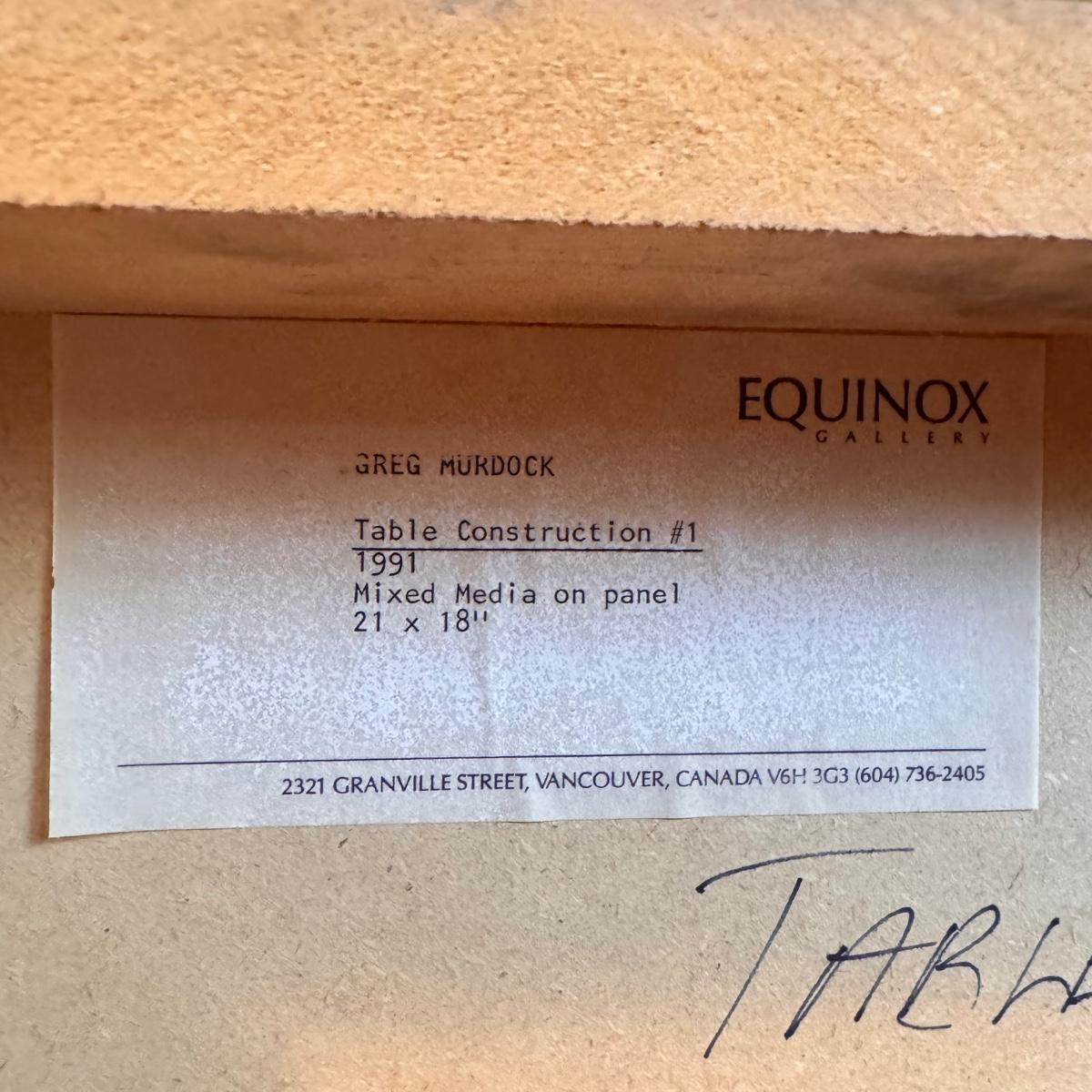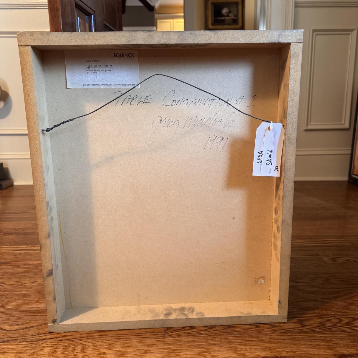 This Greg Murdock piece is titled “Table Construction #1.” It appears to be an original mixed media on panel that is signed on the back and dated with the year 1991. It measures 18” x 21”H. Shipping Available. Shipping can be costly. We suggest contacting our preferred local shipping provider, Postage Express, with dimensions and getting an estimate before bidding: 828-255-9250 or shipping@postageexpressnc.com
