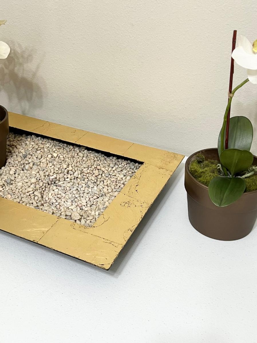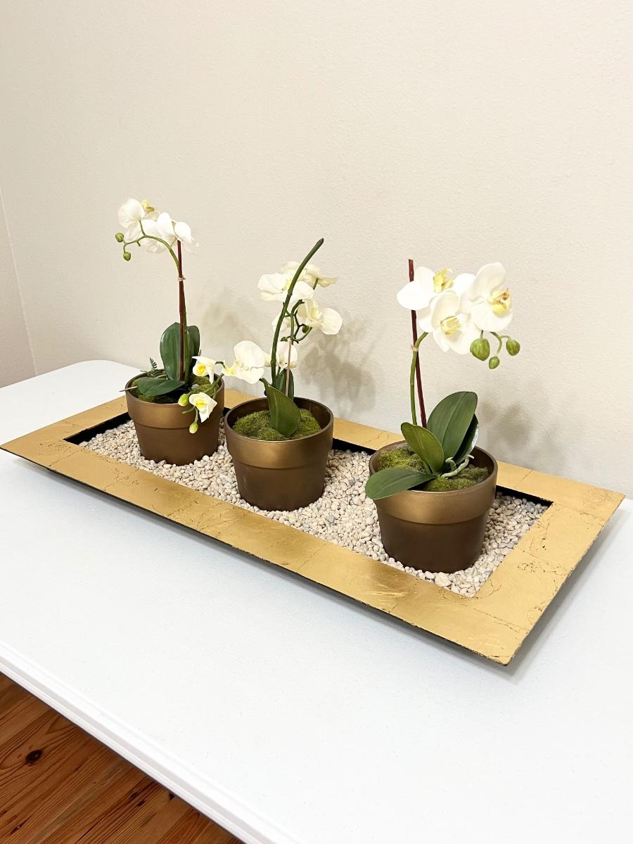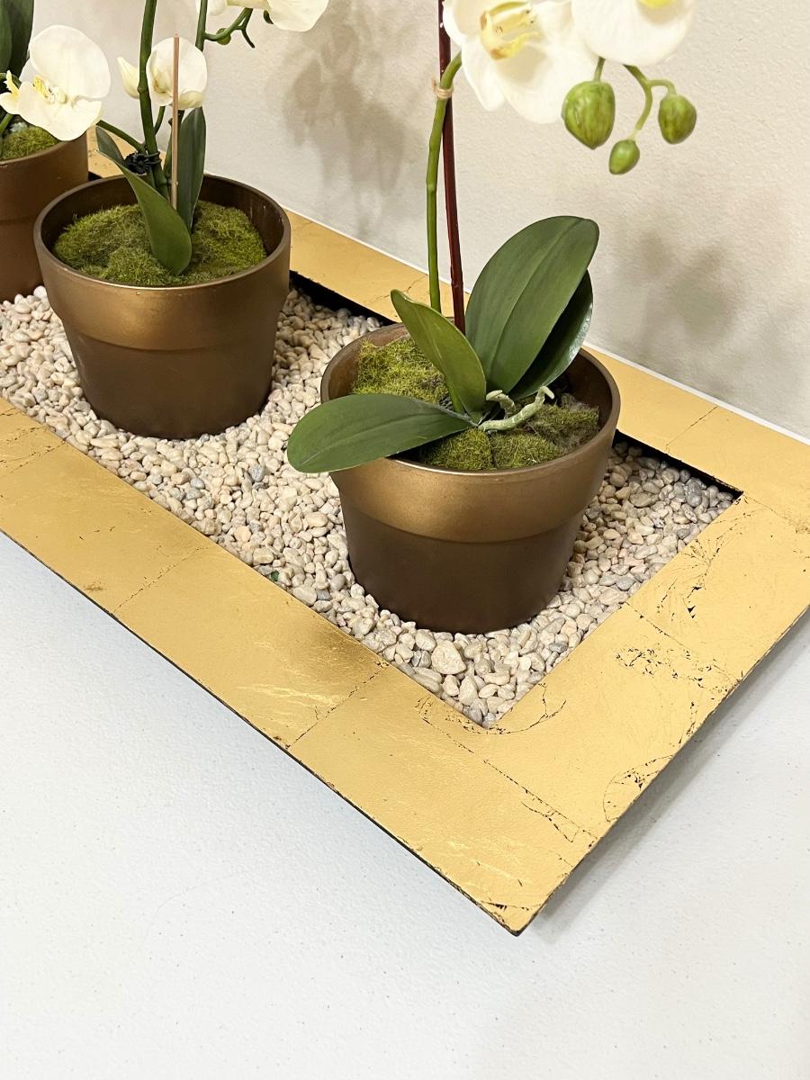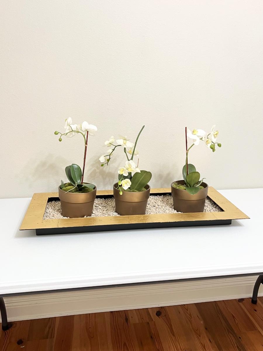 Gold / black tray is metal ~ Orchid pots are ceramic ~ All floral planters & rocks can be removed ~ Orchids are artificial ~ Entire setup = 18” H x 36” W x 16” D ~ Tray = 2.25” H