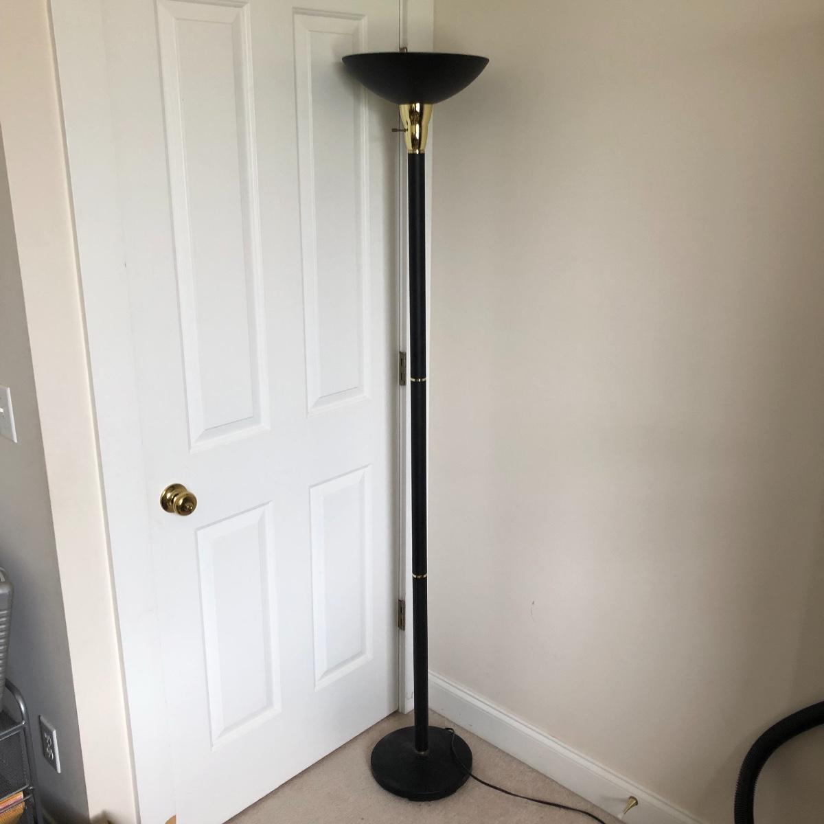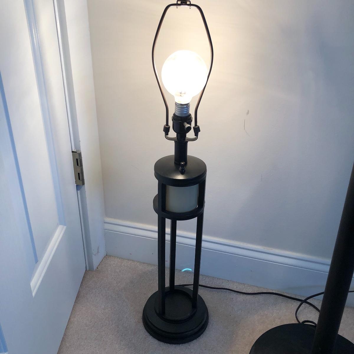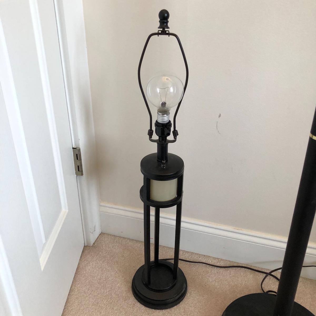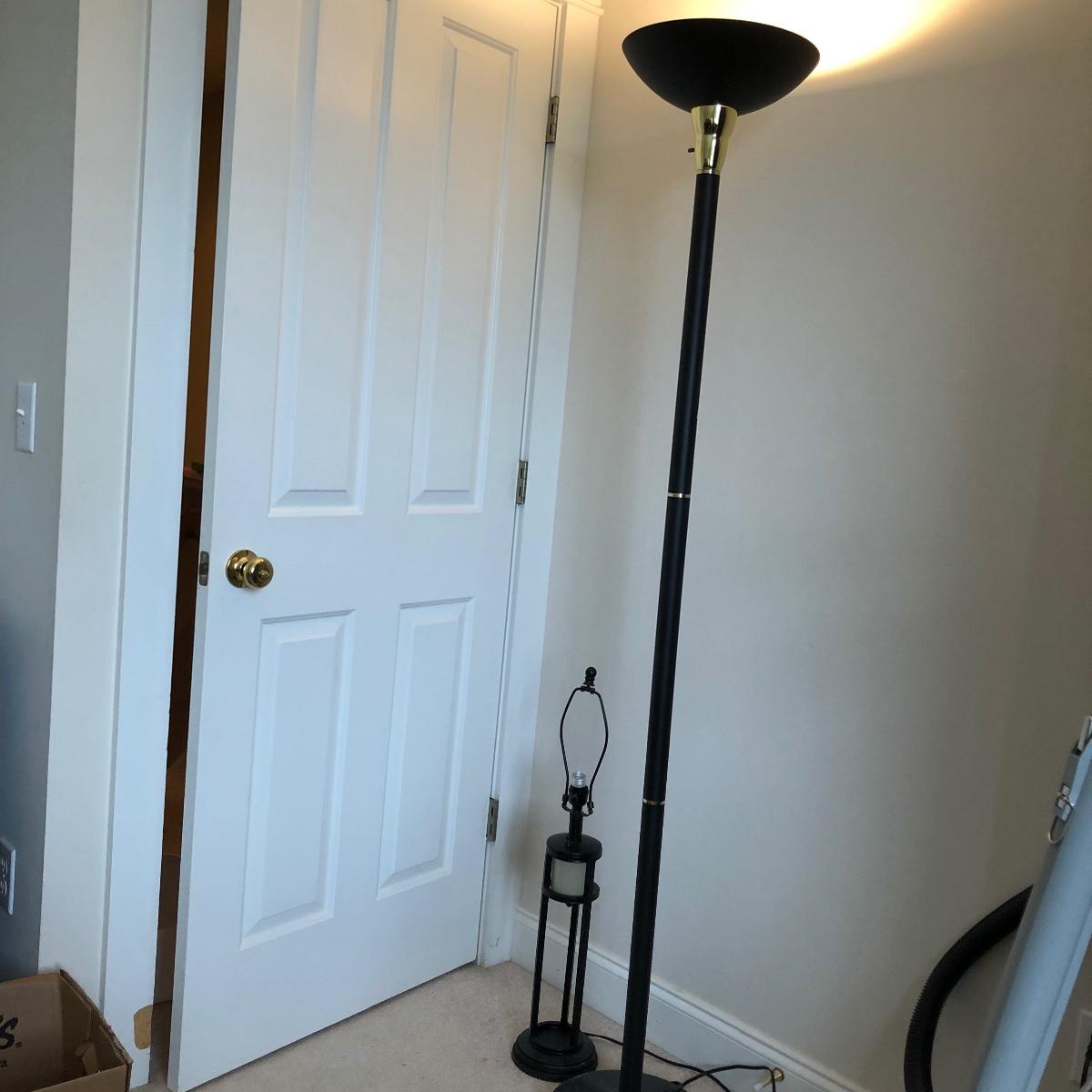 Lot includes black metal floor lamp and a bronze colored 31” tall metal table lamp. Floor lamp measures 12.5”D x 72” tall.