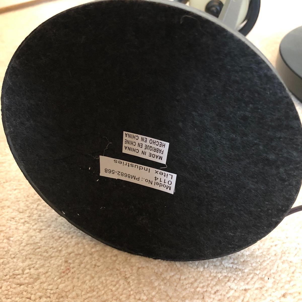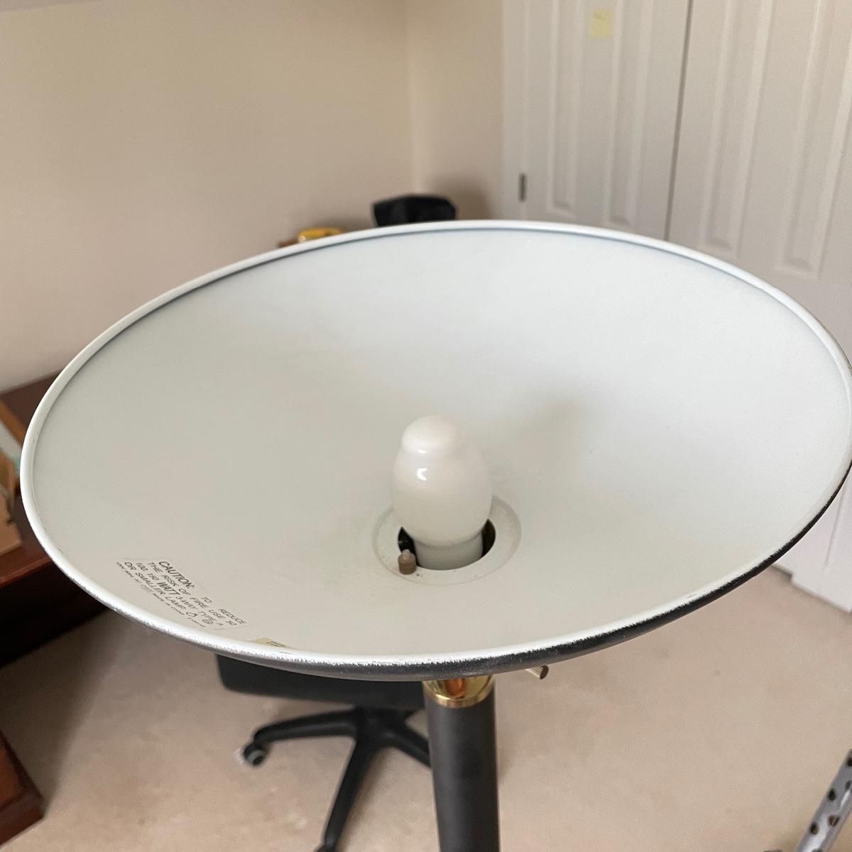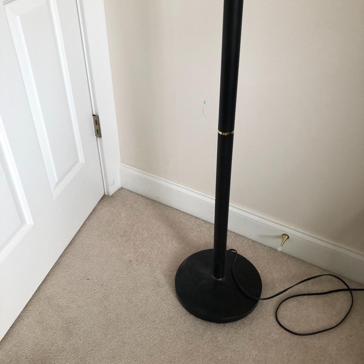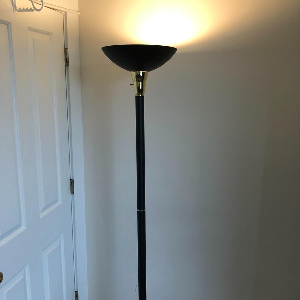 Lot includes black metal floor lamp and a bronze colored 31” tall metal table lamp. Floor lamp measures 12.5”D x 72” tall.