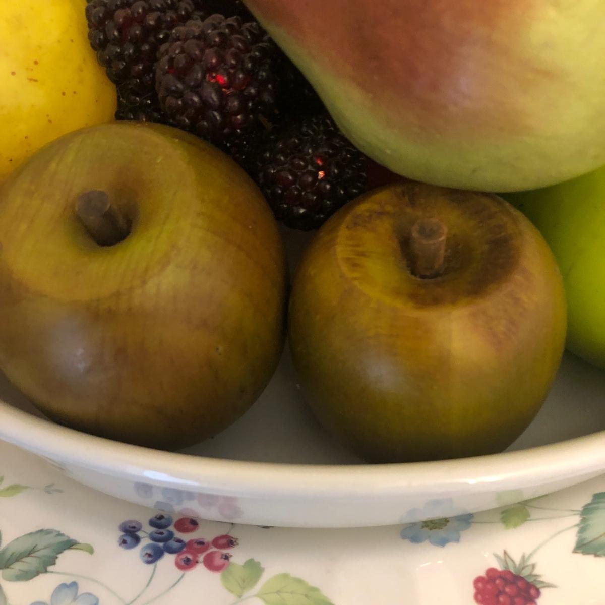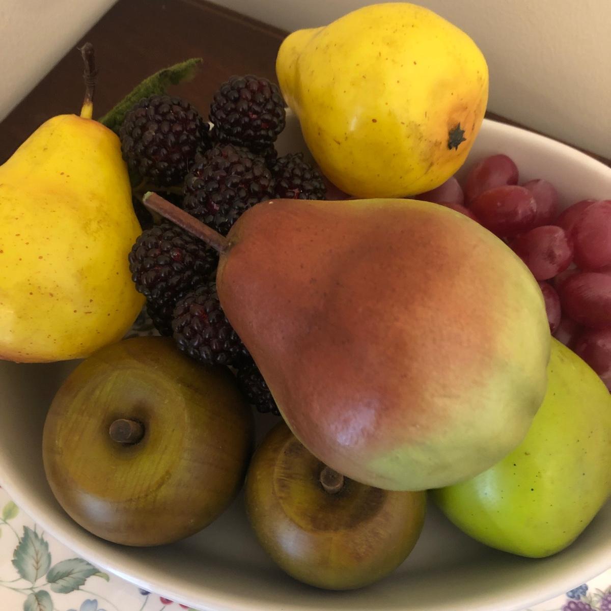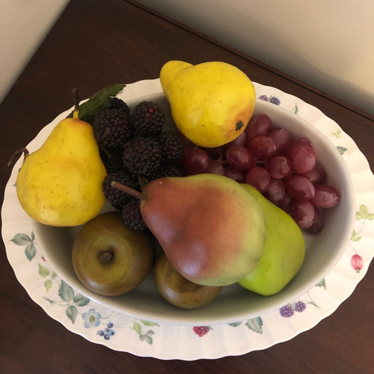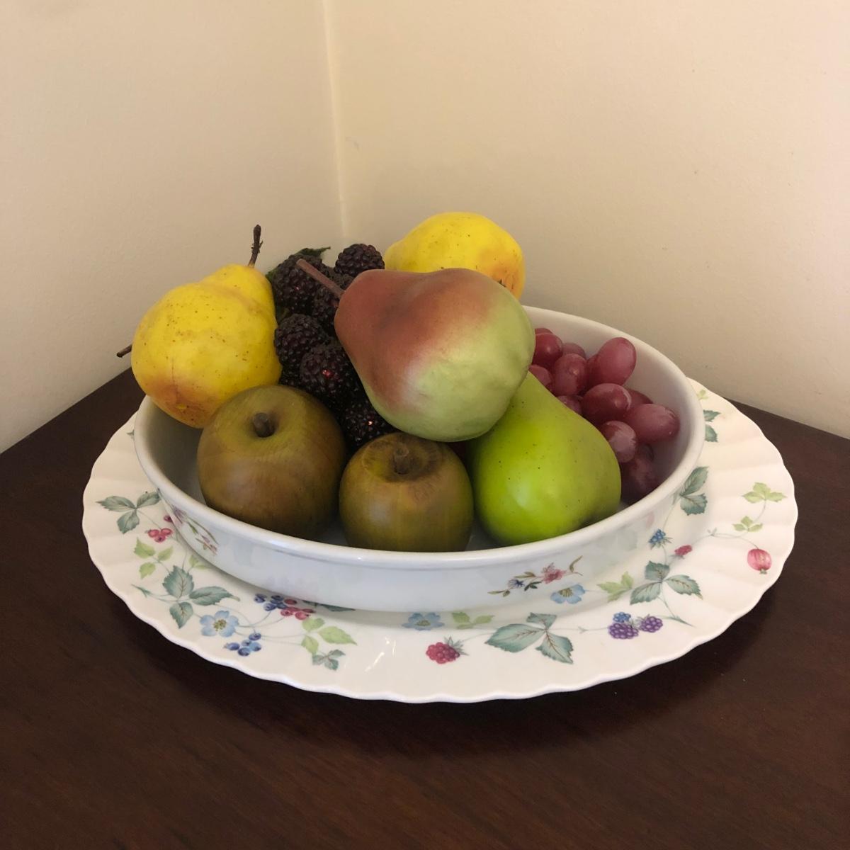 This lot includes faux fruit, a platter and dish. The fruit is plastic (grapes and raspberries), wood (apples) and styrofoam (pears). The bowl is marked BIA (11” x 8”) and the platter is Mikasa (14” x 11”). Shipping available.