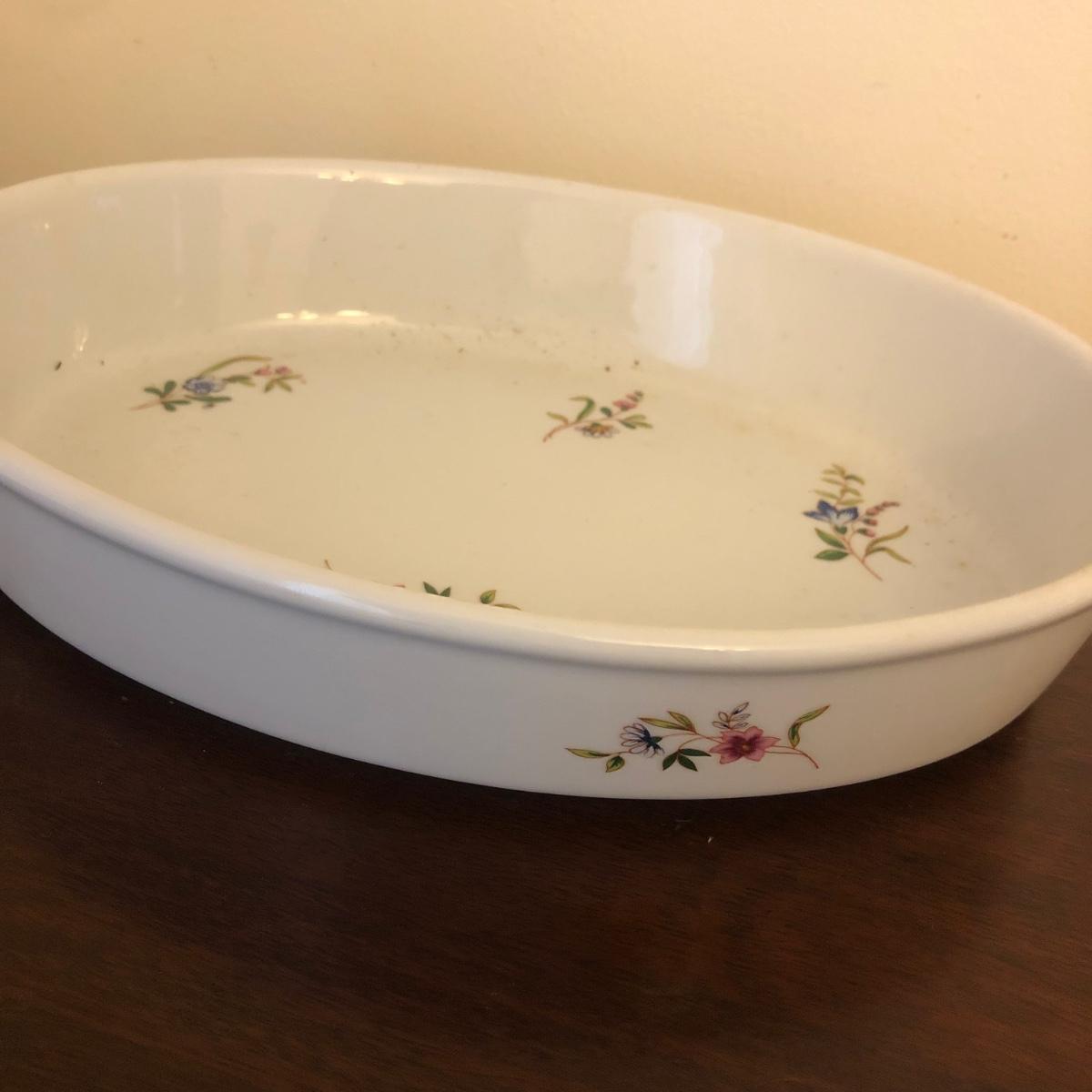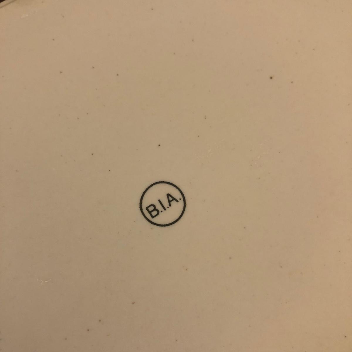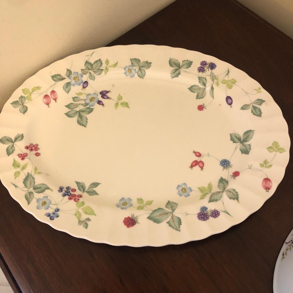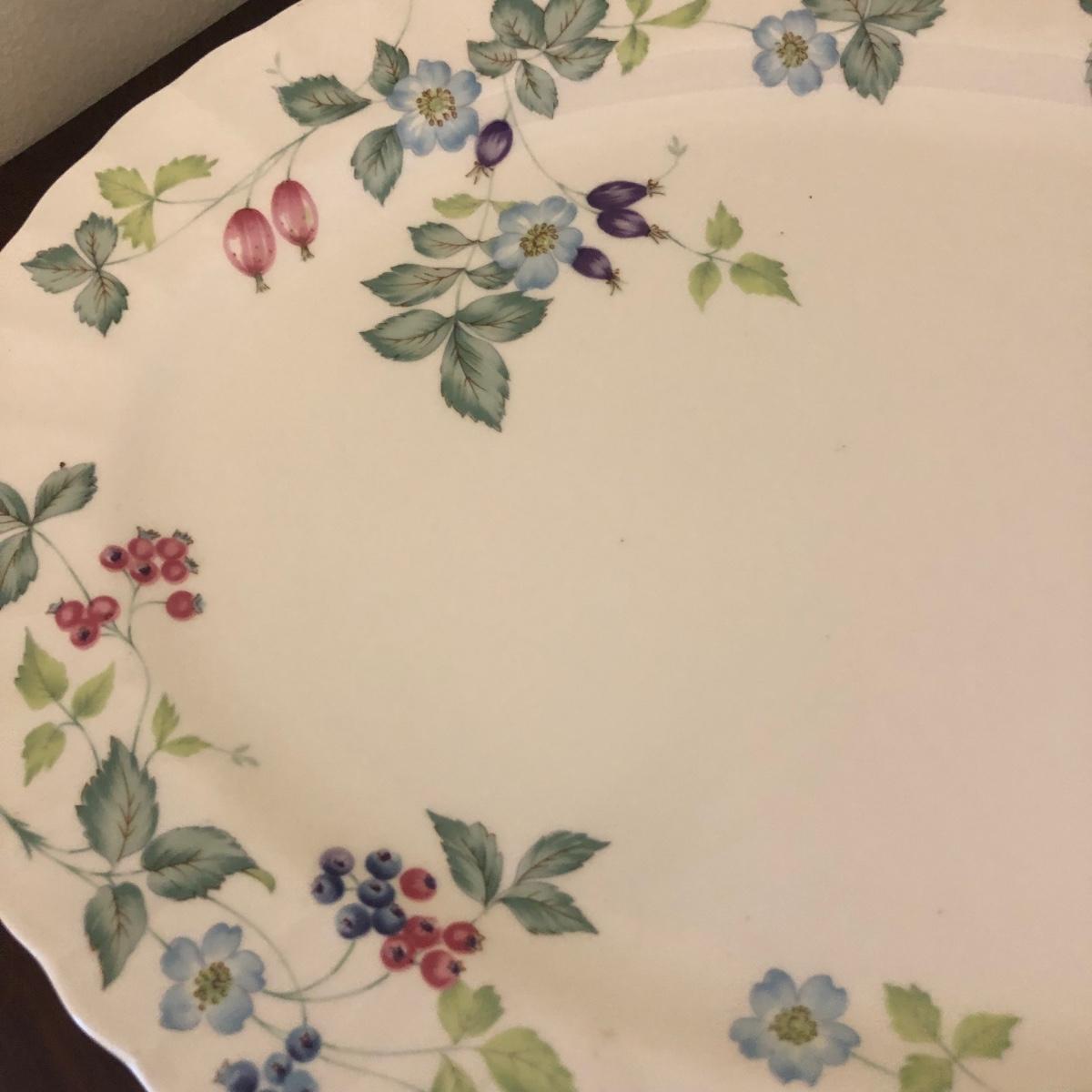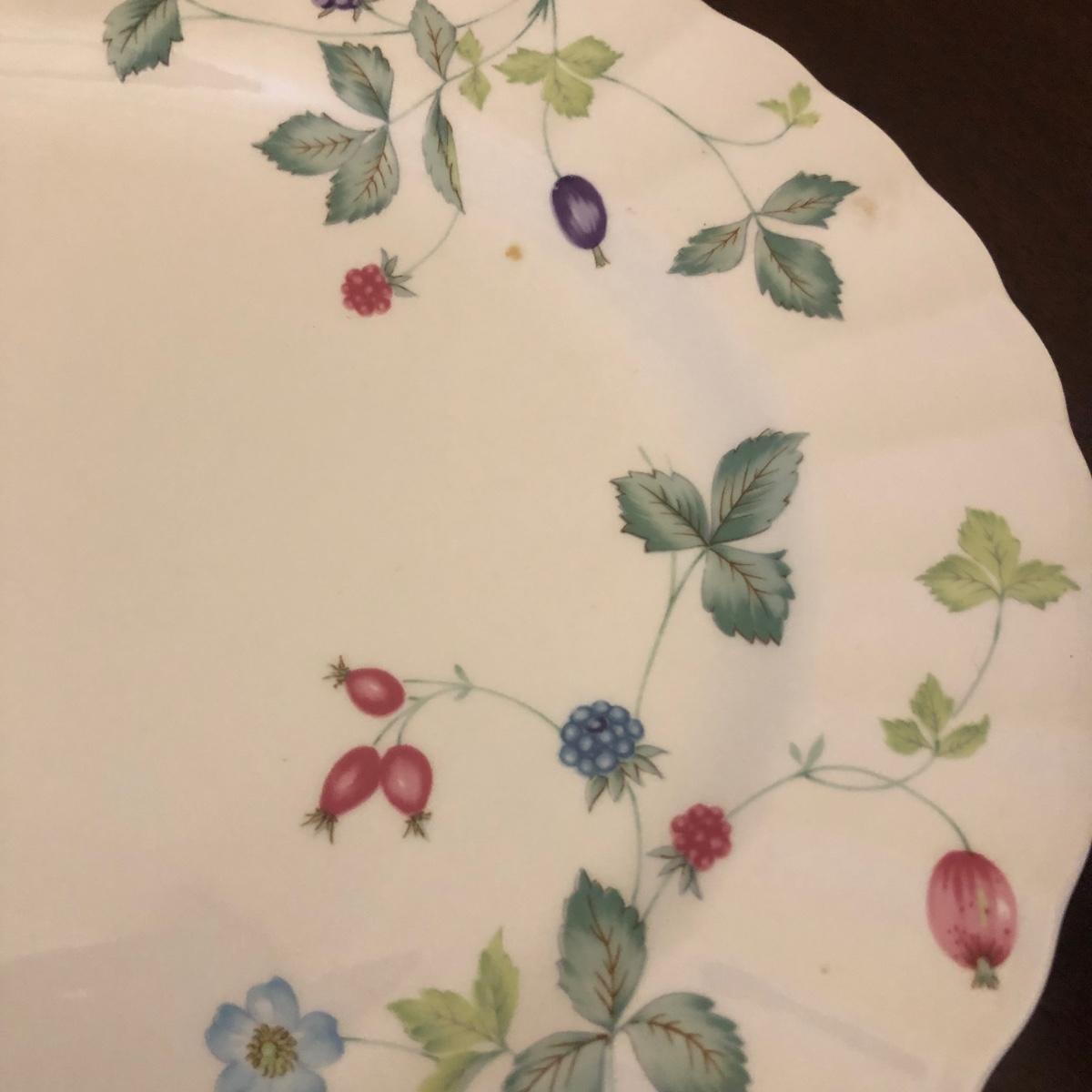 This lot includes faux fruit, a platter and dish. The fruit is plastic (grapes and raspberries), wood (apples) and styrofoam (pears). The bowl is marked BIA (11” x 8”) and the platter is Mikasa (14” x 11”). Shipping available.