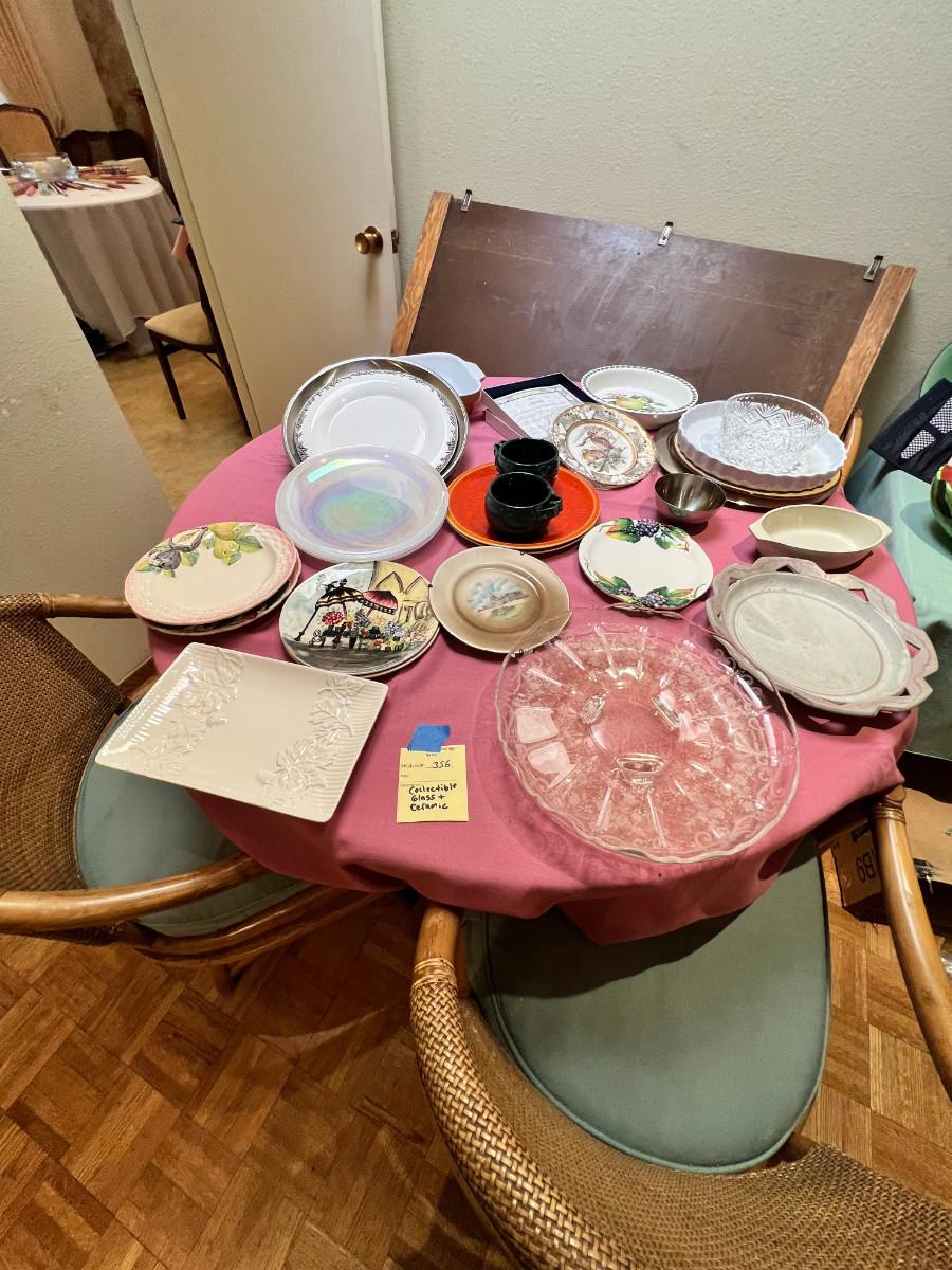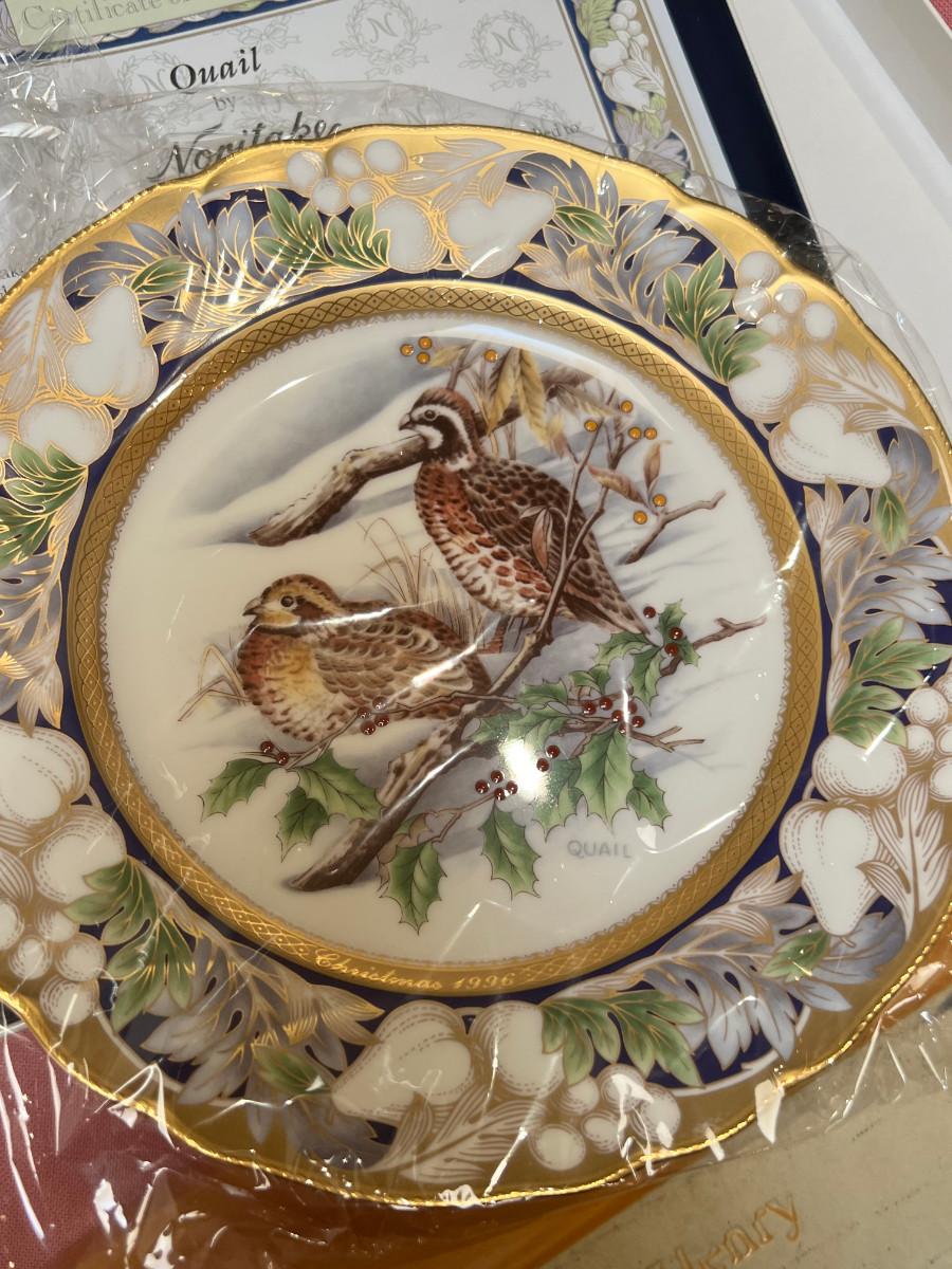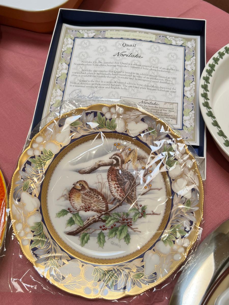 Table full of collectible glass and ceramics,  Noritake Quail plate with COA