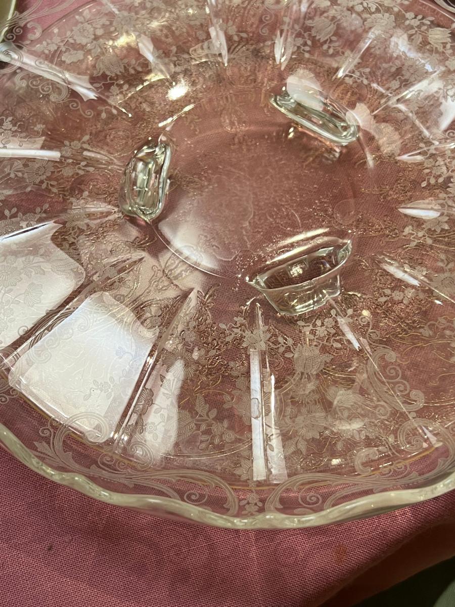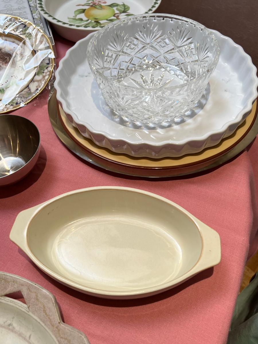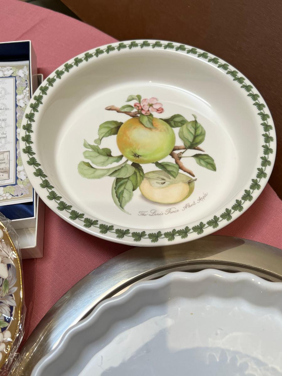 Cambridge pattern glass plates, fine china, ceramic pie pan, Trays, Noritake Quail plate with COA, Lovely and interesting plates. A few Denby of England.