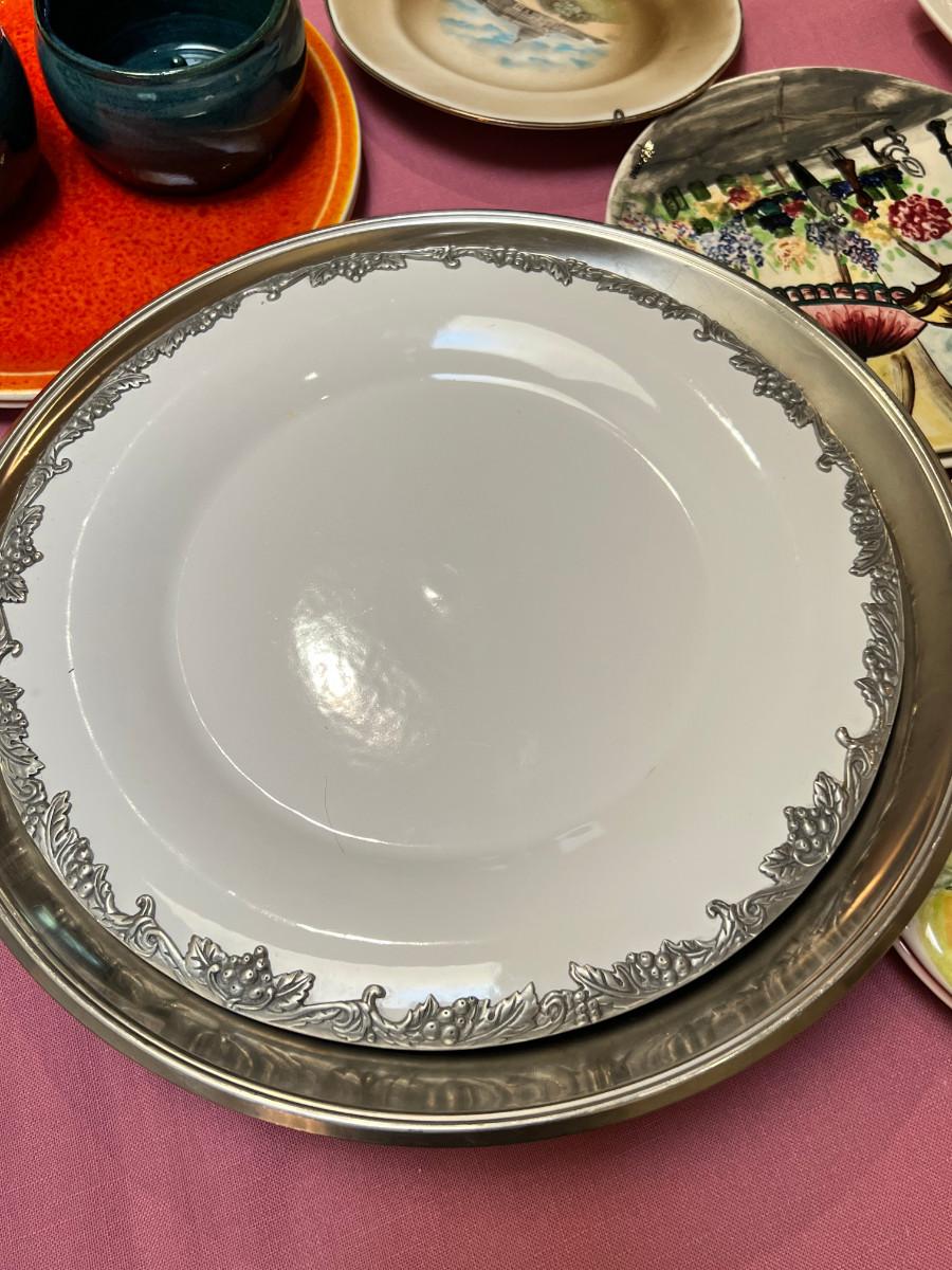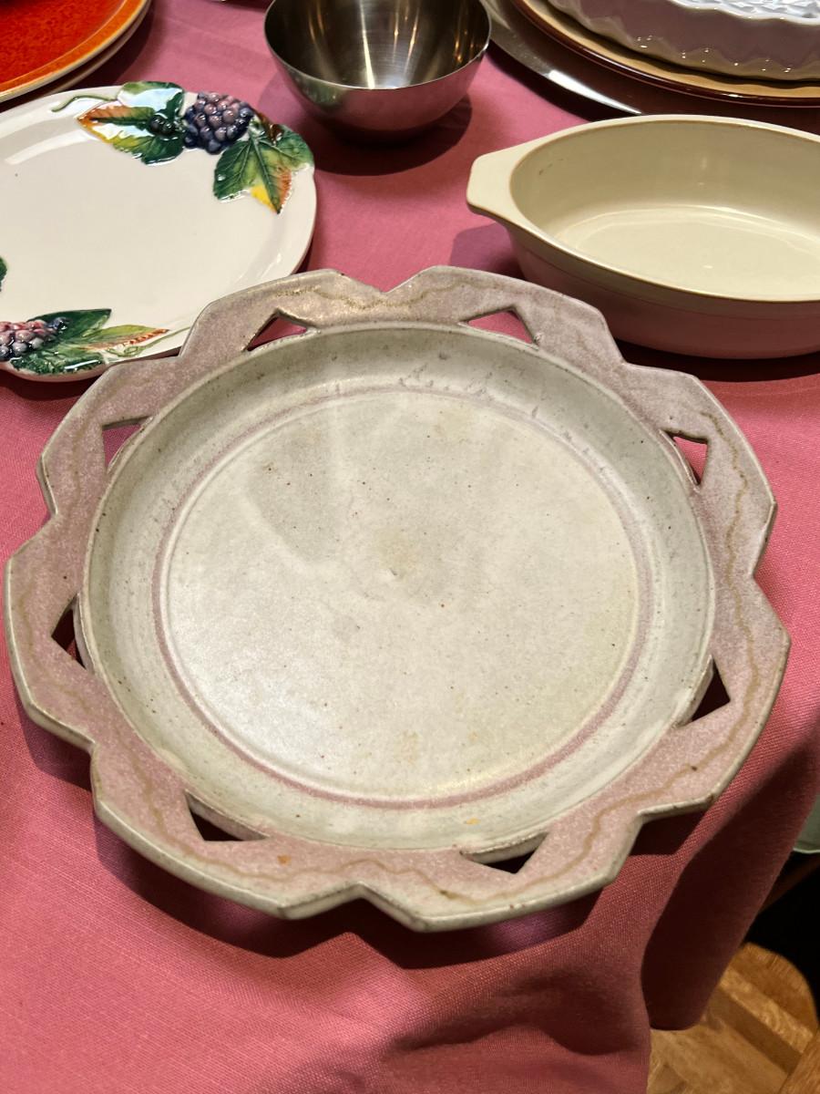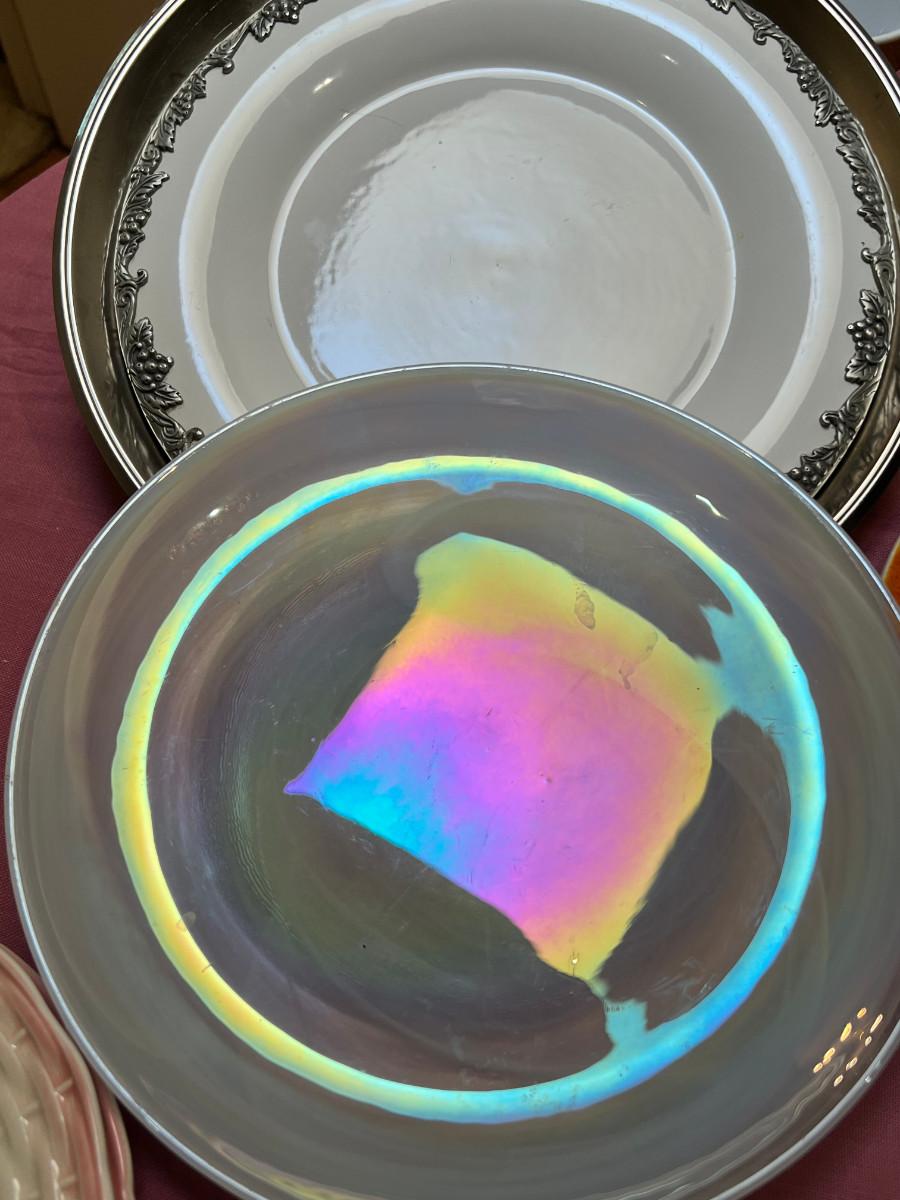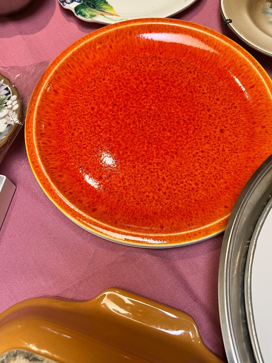 Cambridge pattern glass plates, fine china, ceramic pie pan, Trays, Noritake Quail plate with COA, Lovely and interesting plates. A few Denby of England.
